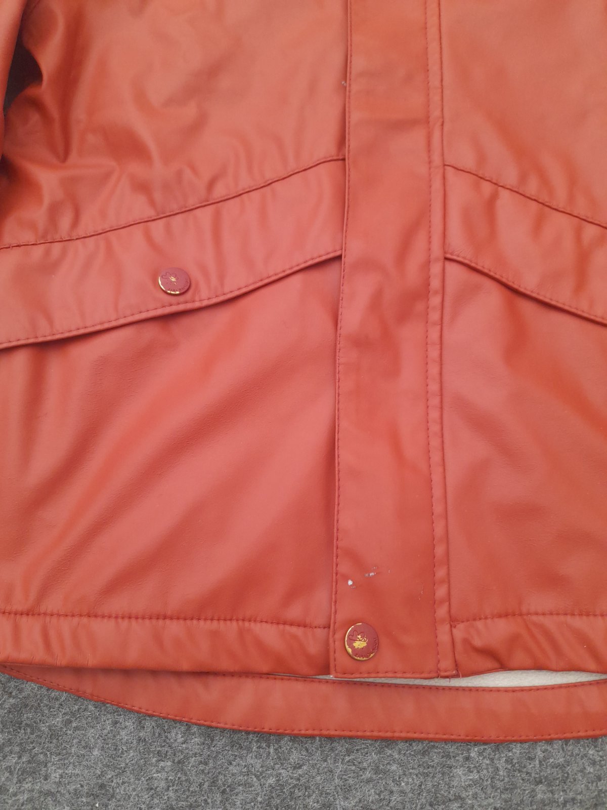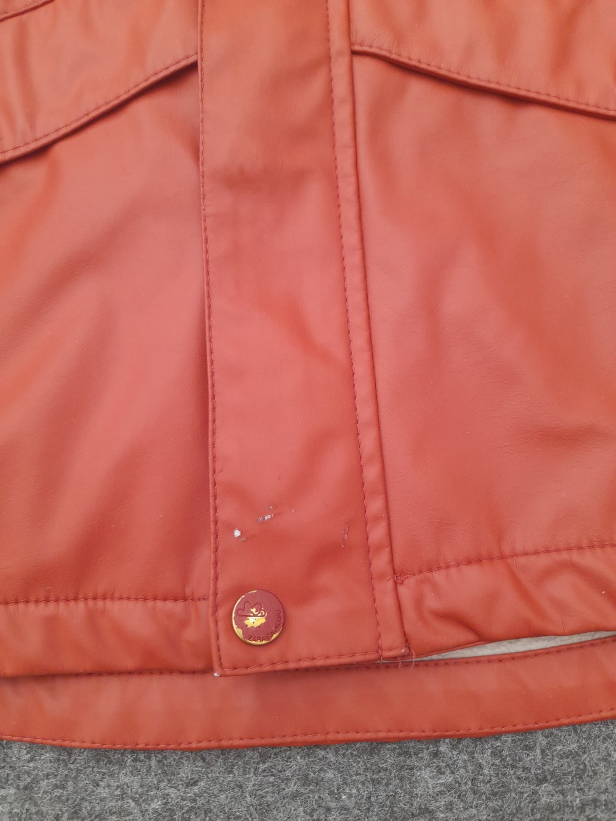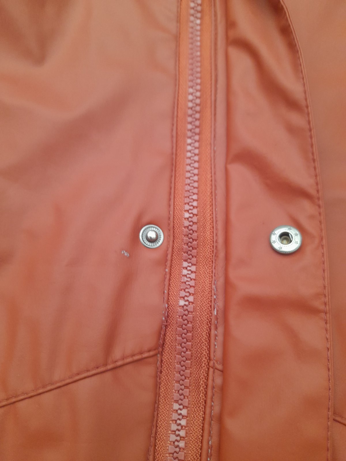 Nepremokavá, pogumovaná zateplená bunda. Na pár miestach je guma už trochu poškodená a gombíky ošúchané, ale pri nosení to nevidno. Cena 4€ plus pošta.