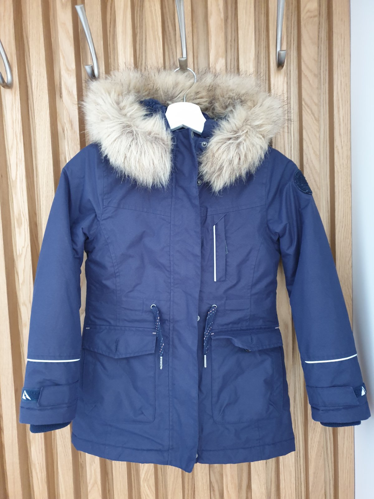 Teplučká zimná bunda. Odoláva vode, vetru. Odnímateľná kožušinka na kapucni. Rexlexné prvky vzadu, vpredu aj na rukávoch. Bez poškodení. Top stav.