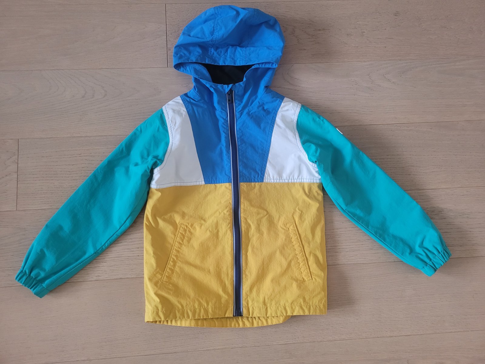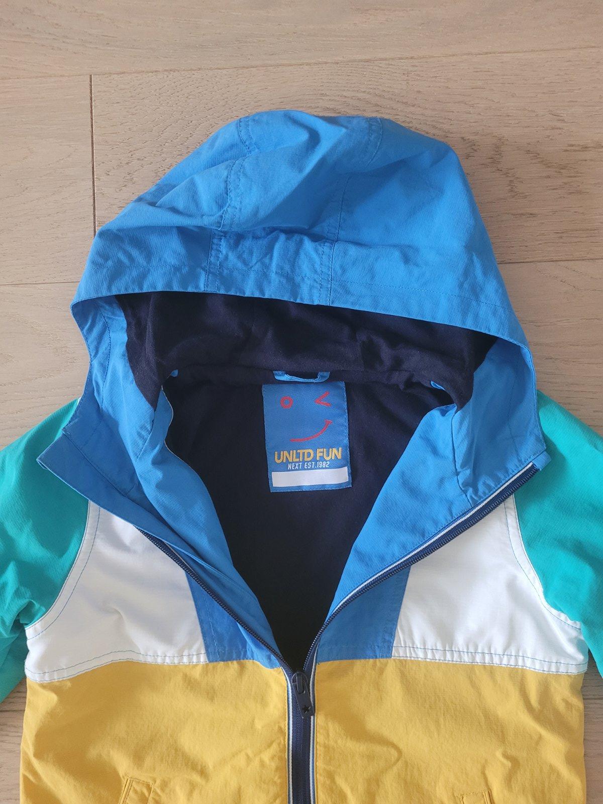 Predám pestrofarebnú protiveternú bundu Next na prechodné obdobie, veľ. 122, v dobrom stave.