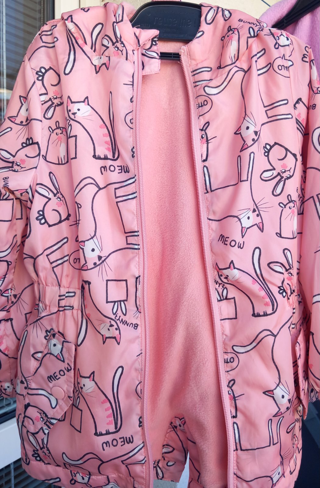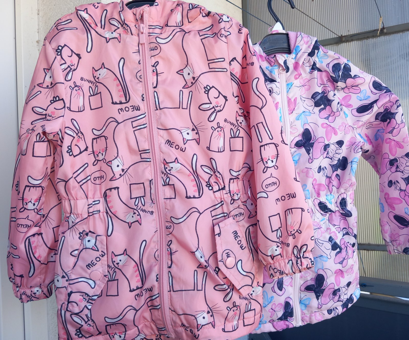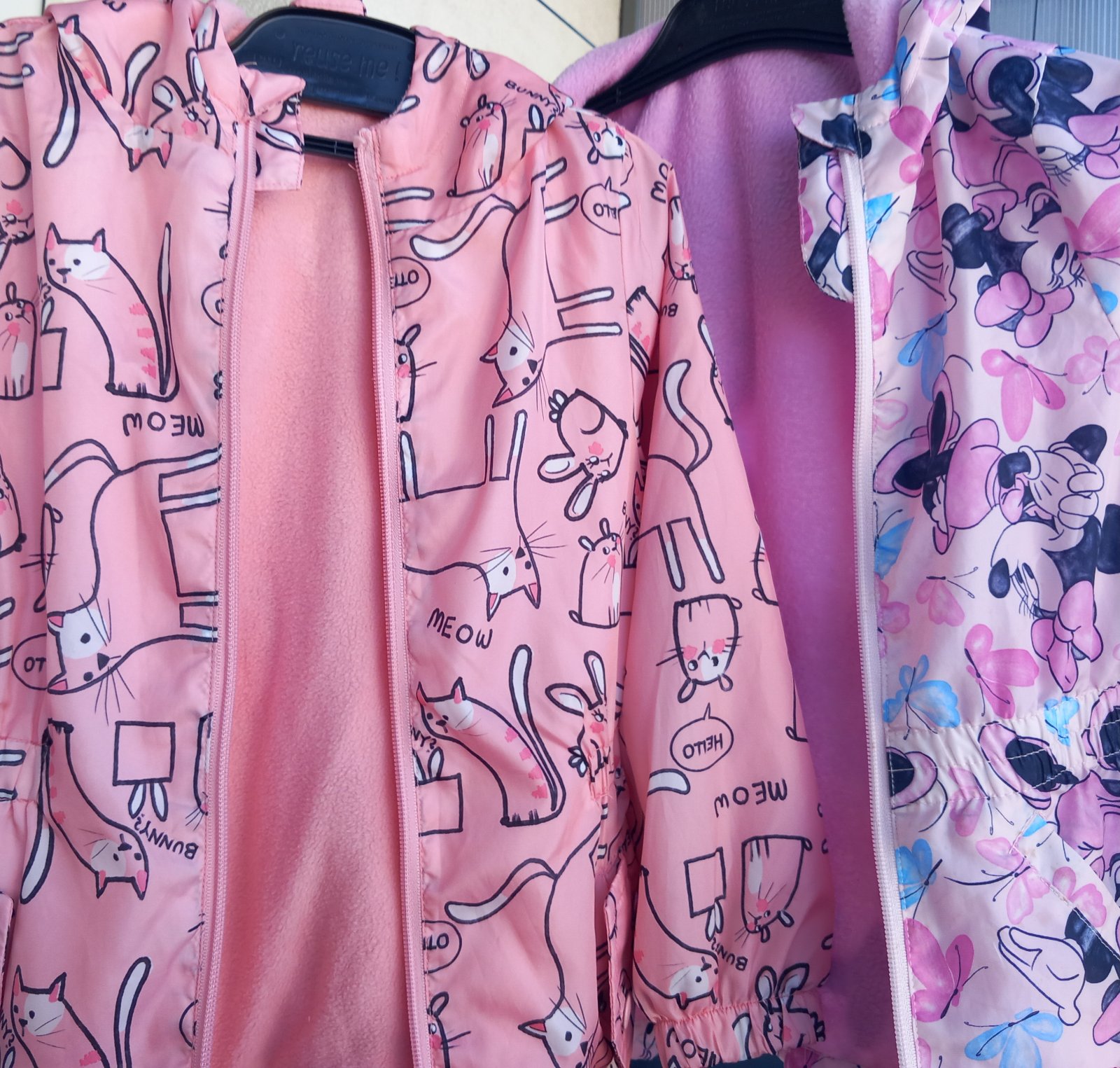 Predám dve prechodné vetrovky, bez poškodení, krásny stav, mačičková je veľkosť 104, druhá je trošku väčšia, tipujem 104-110.