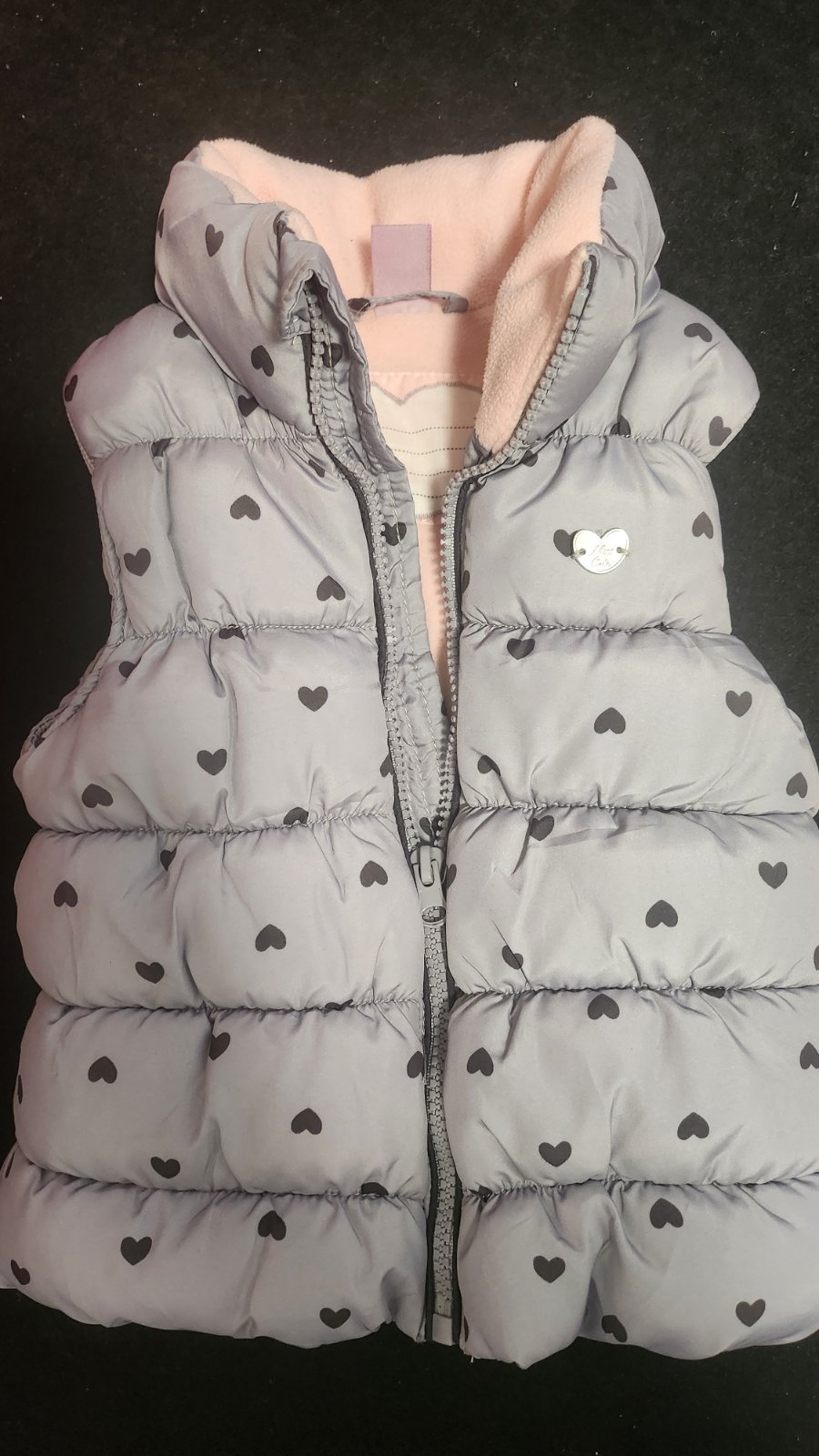 Krásna prechodná vesta so srdiečkami, top stav, ako nová, akurát farba na bežci trochu šuchnutá, vid foto. Ak je vesta zapnutá nie je to vidieť. Veľkosť 9-12mesiacov, kupovaná v Takku.V