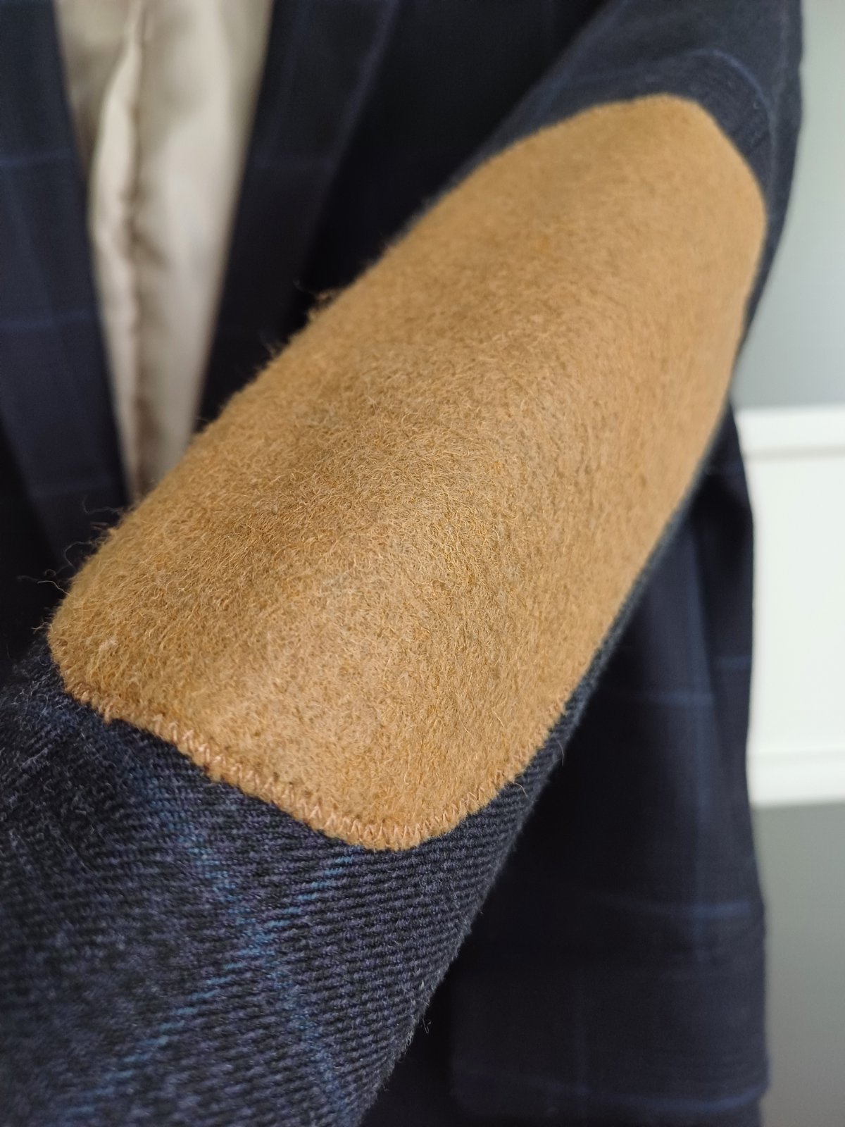 Kárované sako tmavomodrej farby s vačkami .Zapínanie je na jeden gombík.