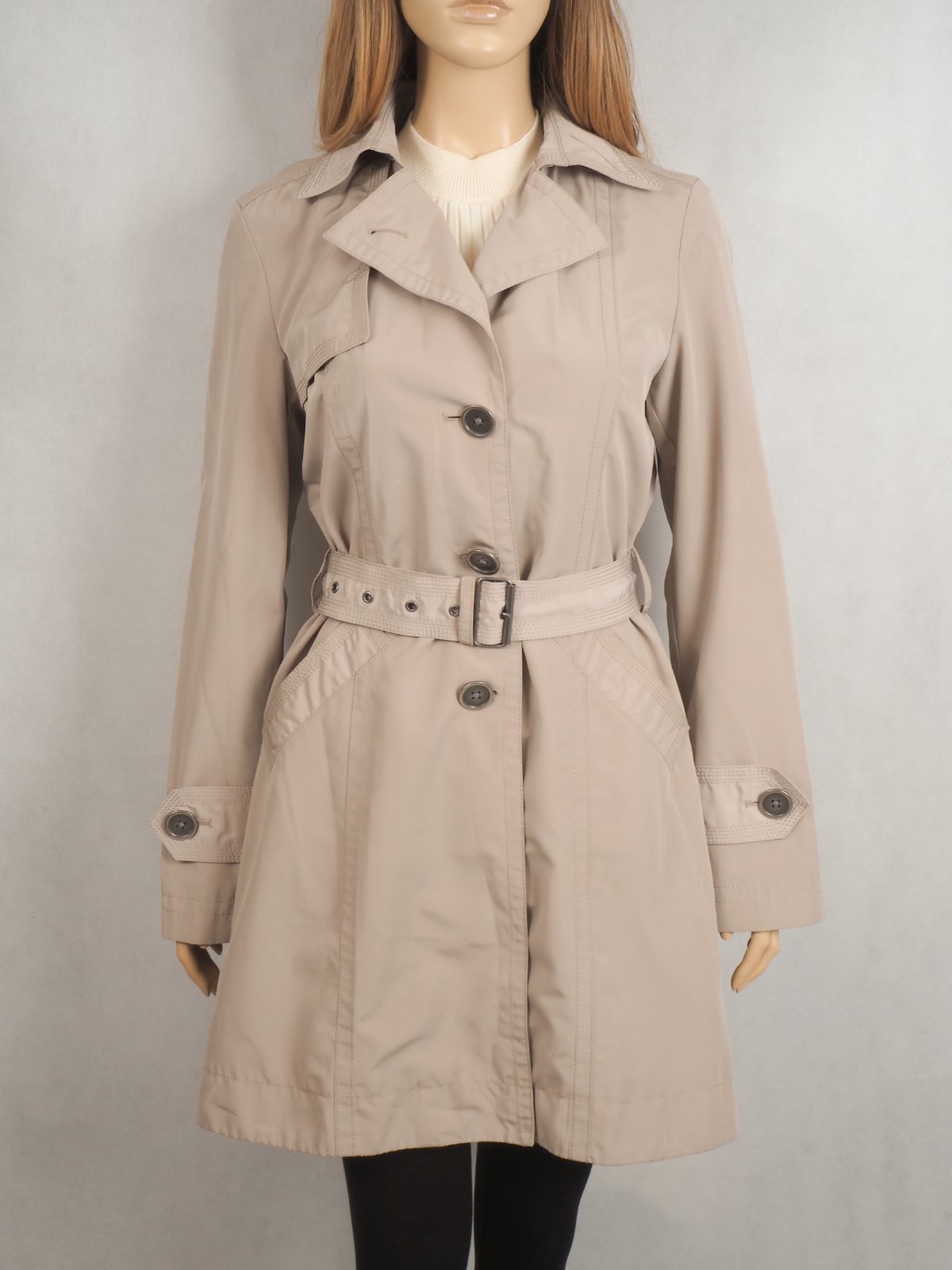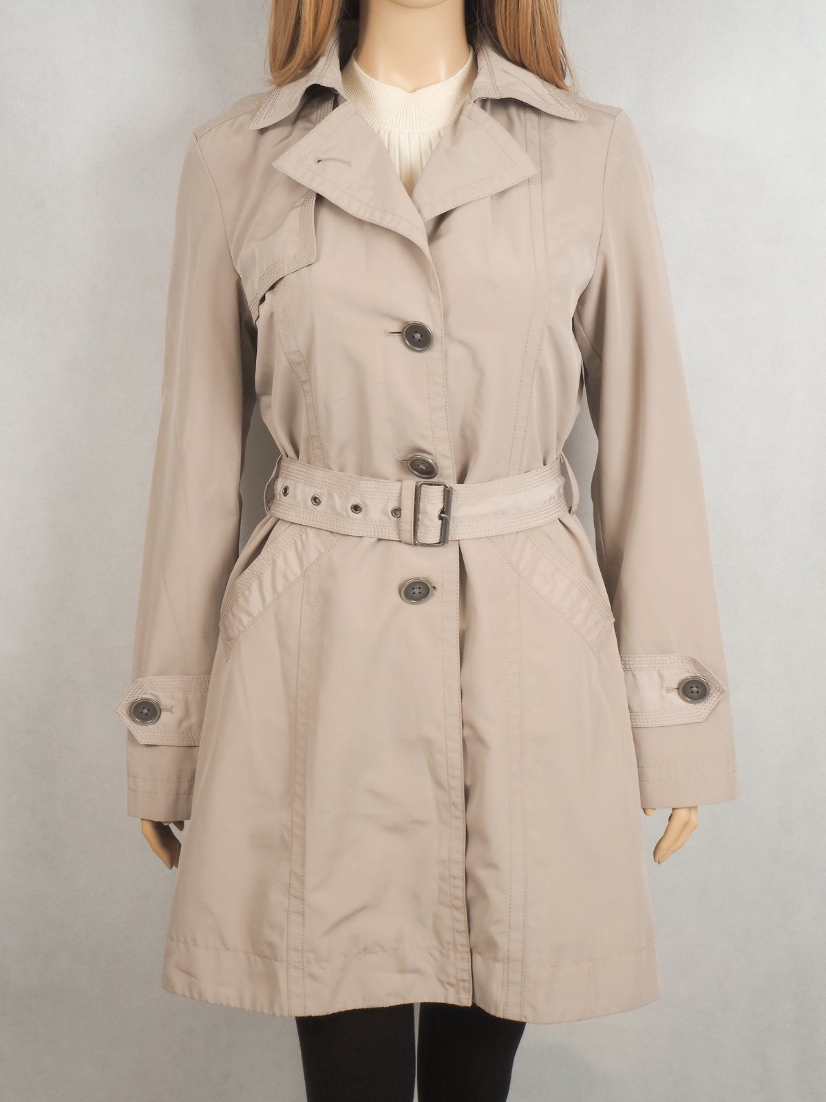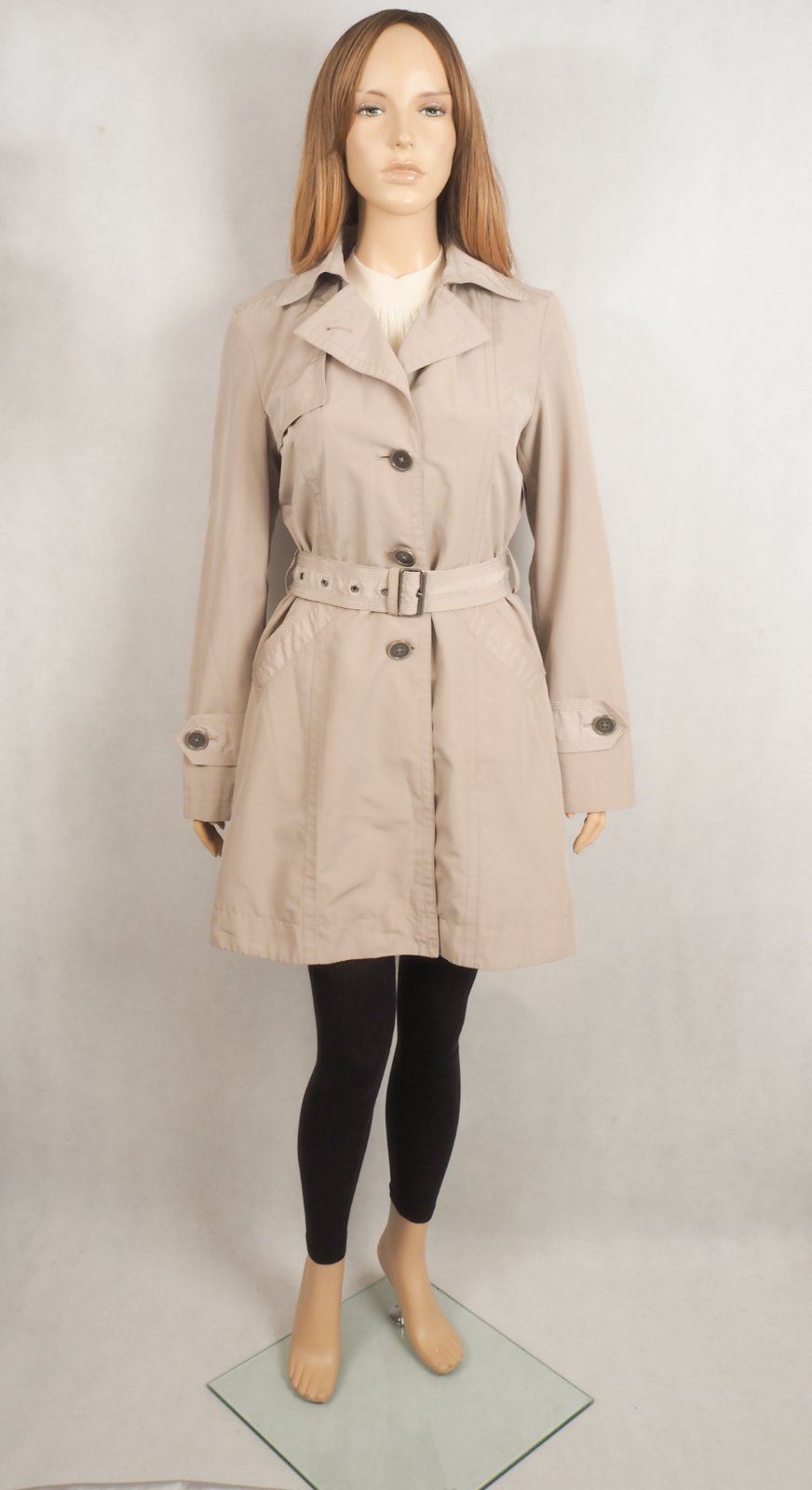 Kvalitný jarný trenčkot béžovej farby, zapínanie na gombíky, vypracovaný do detailov, materiál 100% polyester, podšívka acetát, super stav.