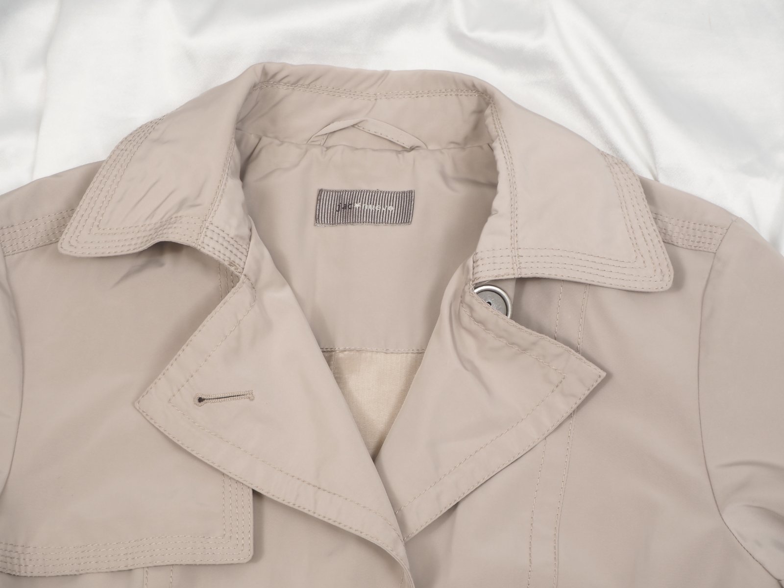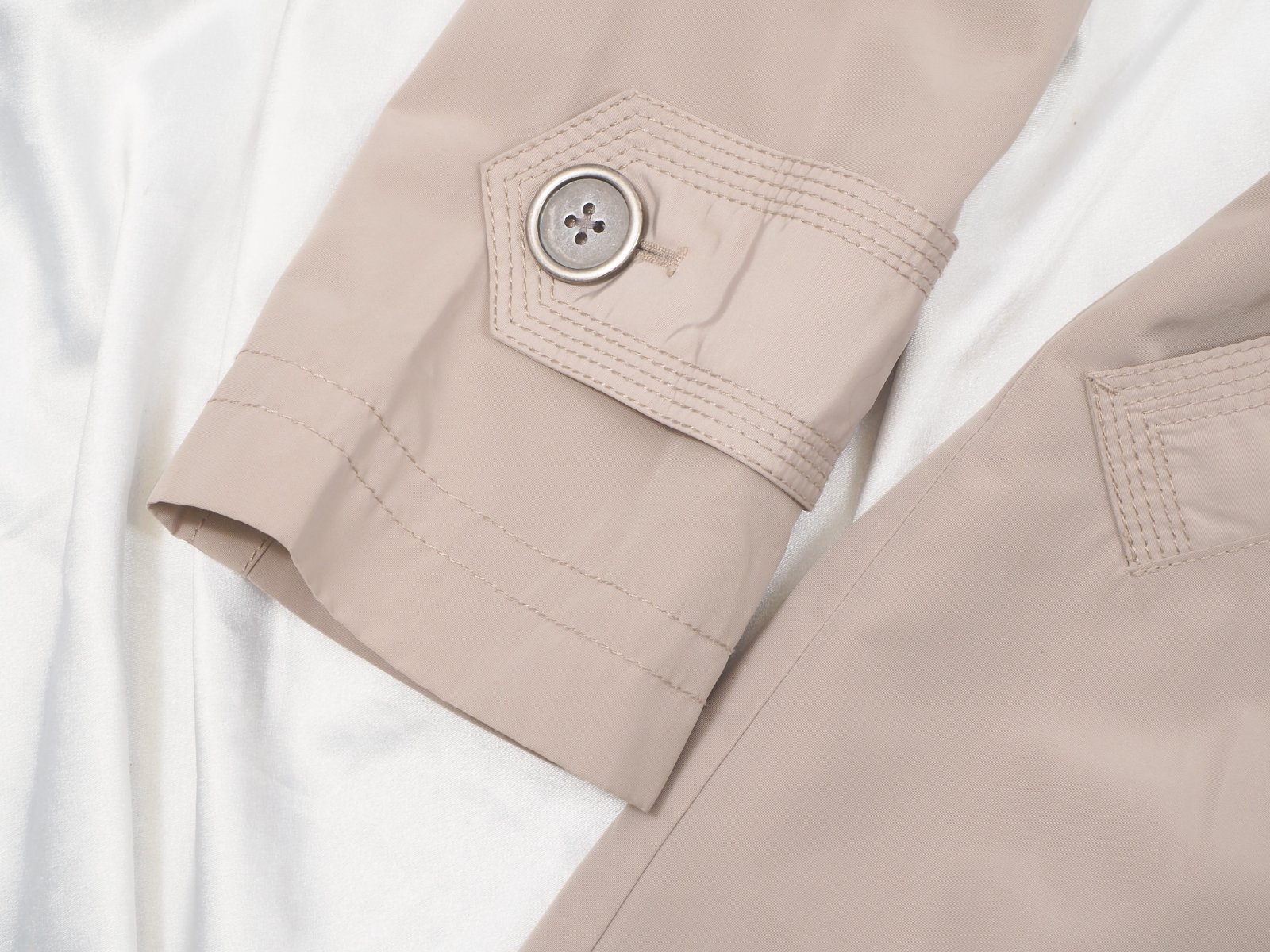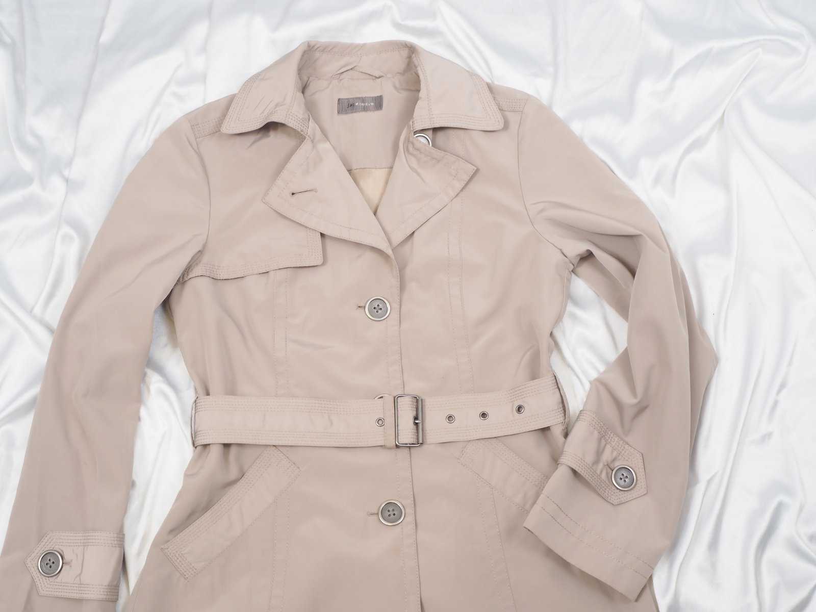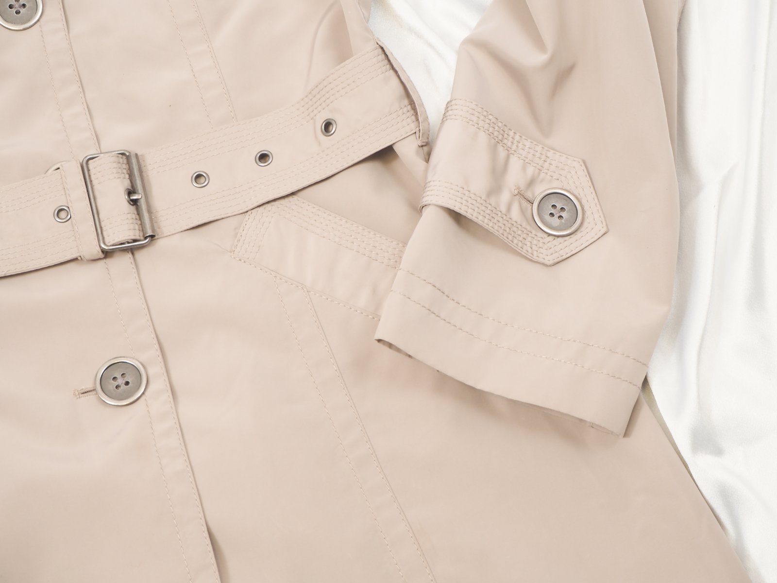 Kvalitný jarný trenčkot béžovej farby, zapínanie na gombíky, vypracovaný do detailov, materiál 100% polyester, podšívka acetát, super stav.
