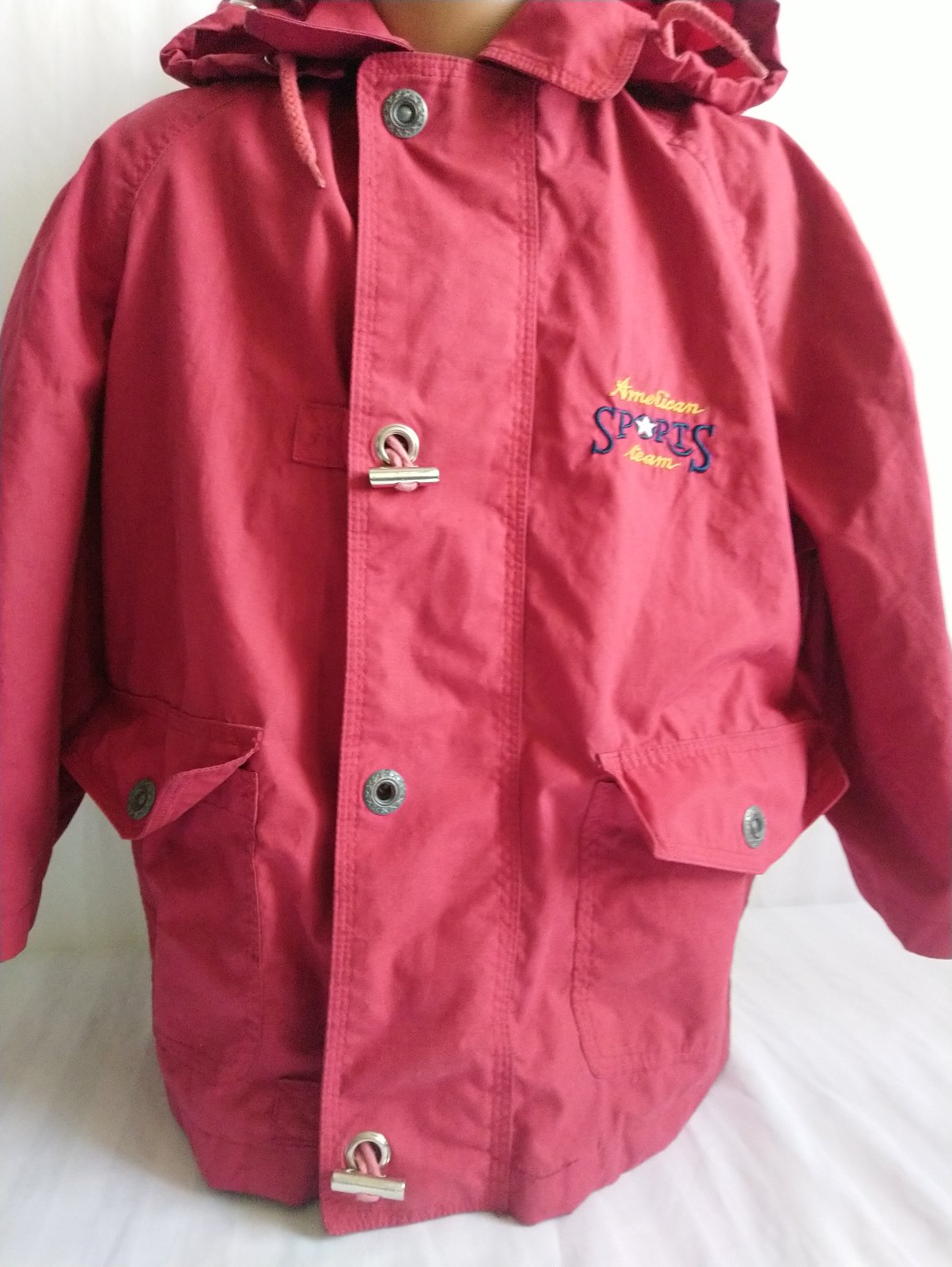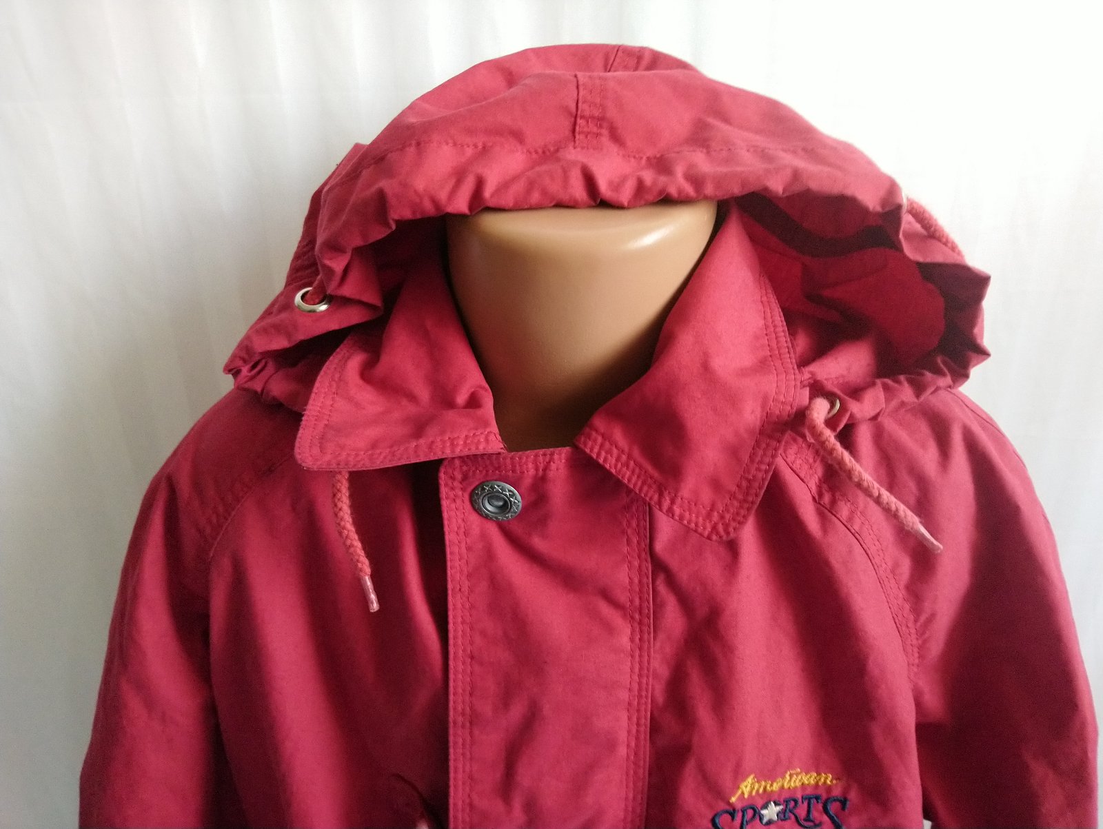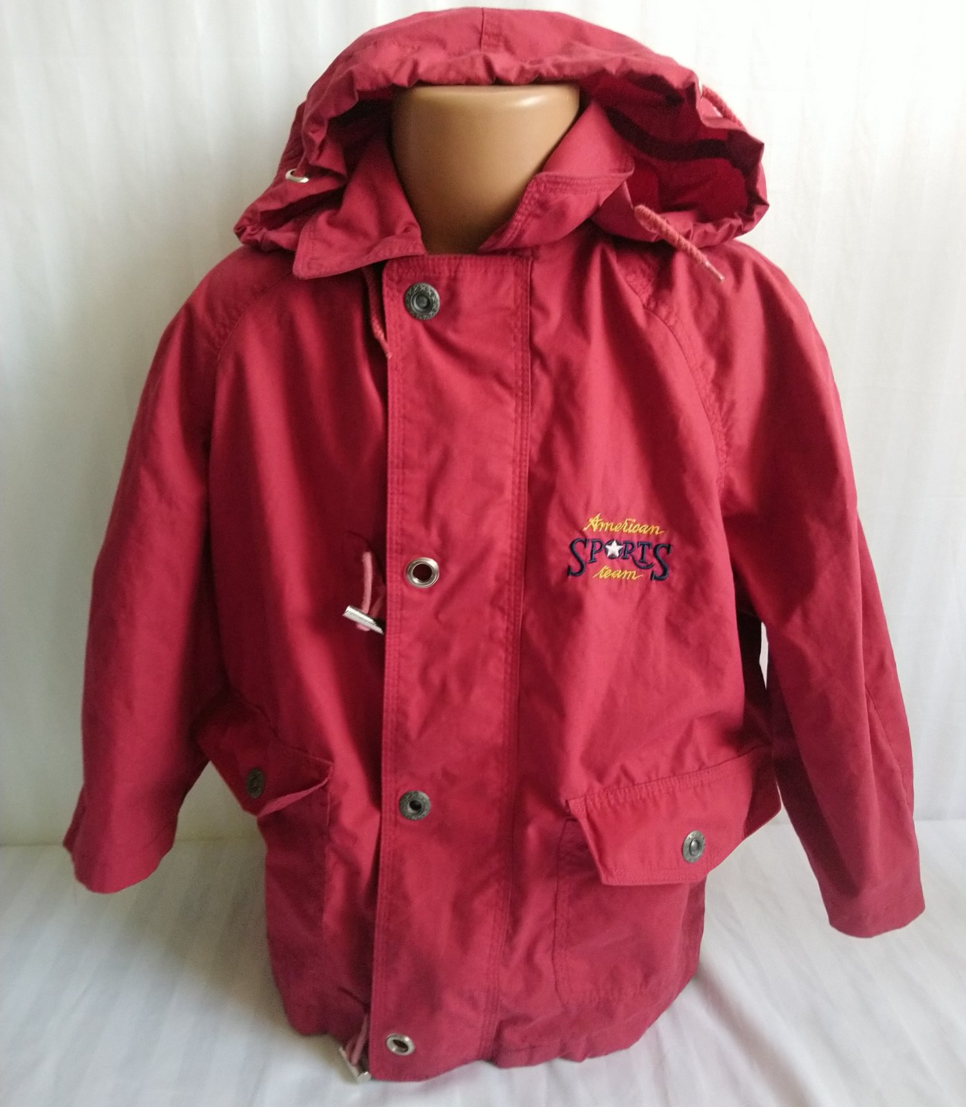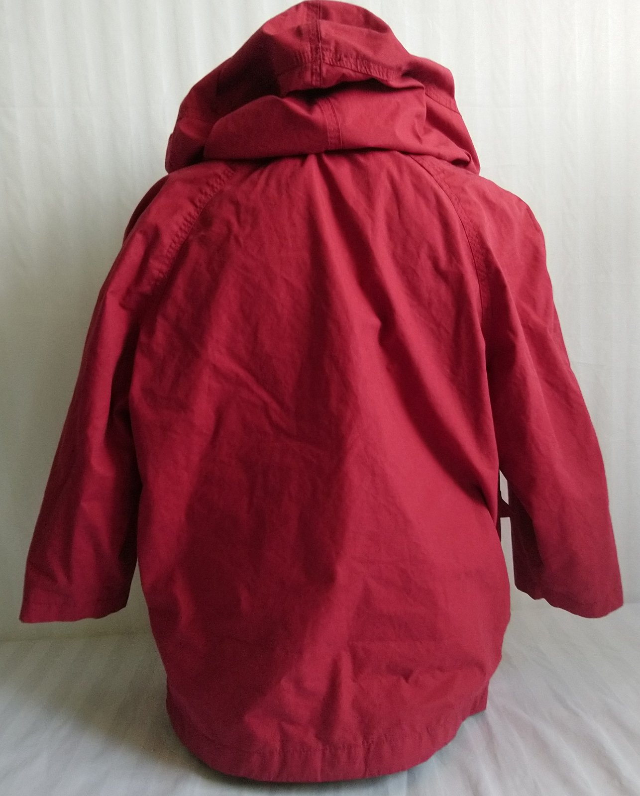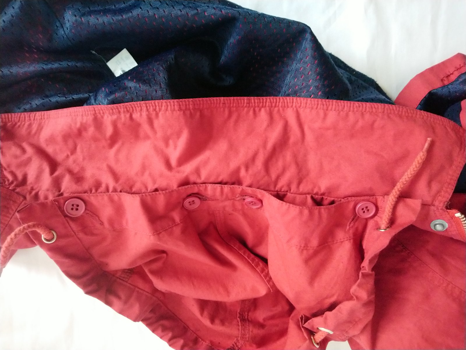 prechodná červená - odtieň je viac červený ako na foteke - bunda, golier, odopínateľná kapucňa, skryté zapínanie na zips, vrecká,