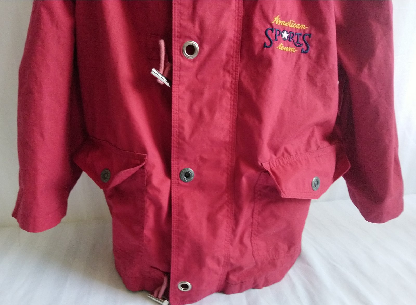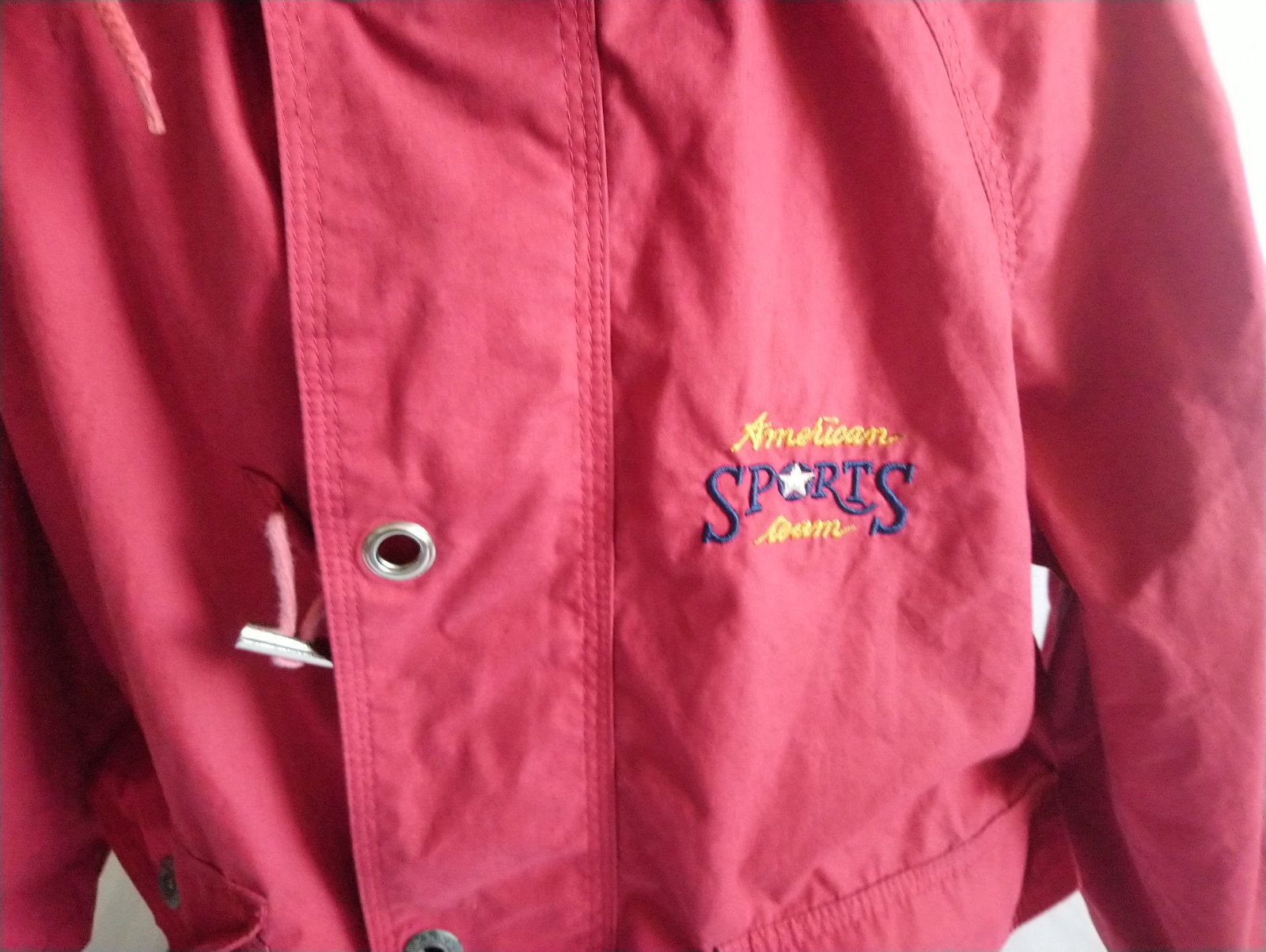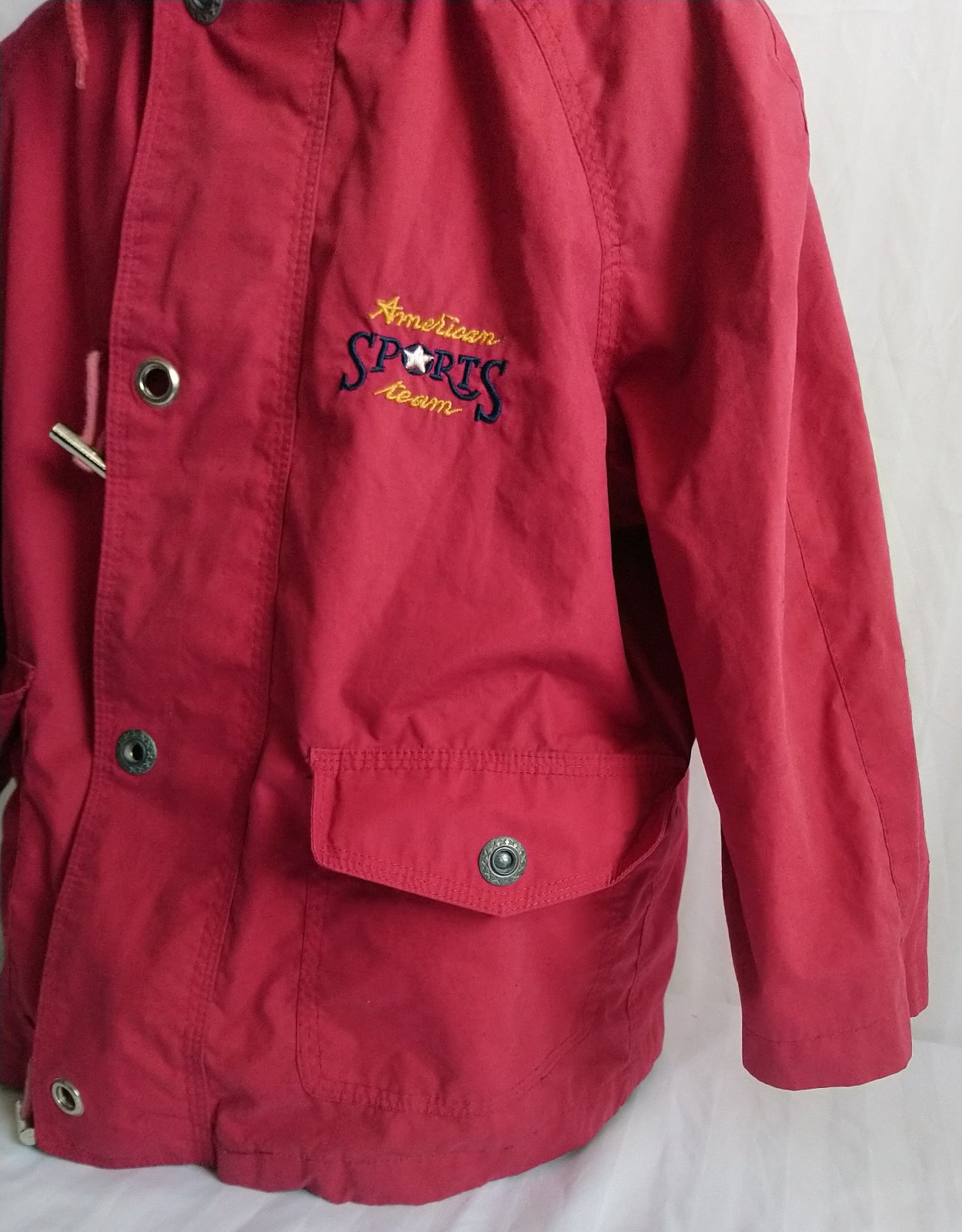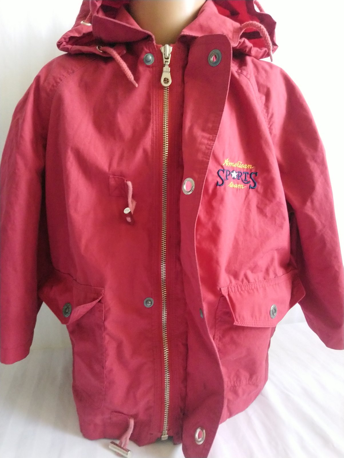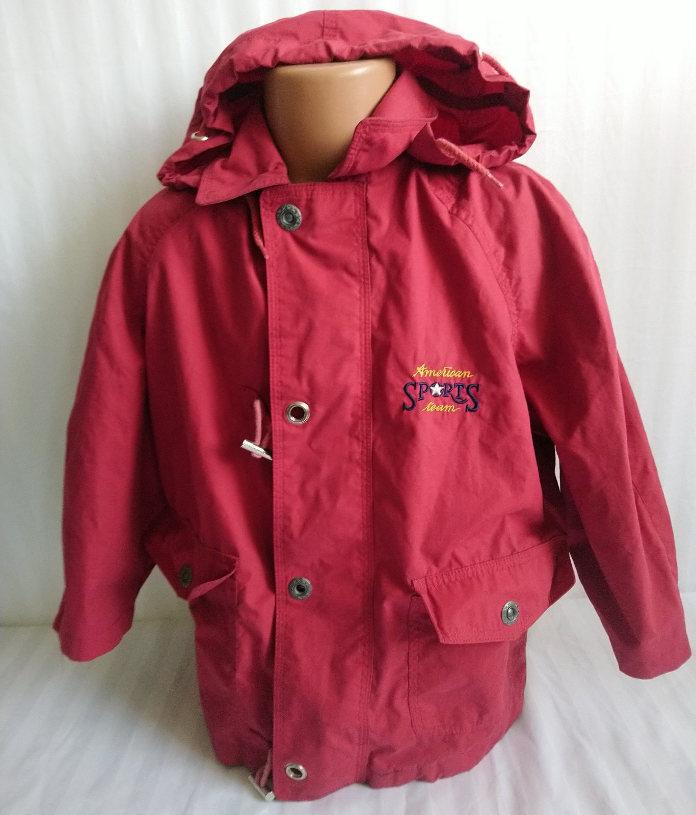 prechodná červená - odtieň je viac červený ako na foteke - bunda, golier, odopínateľná kapucňa, skryté zapínanie na zips, vrecká,