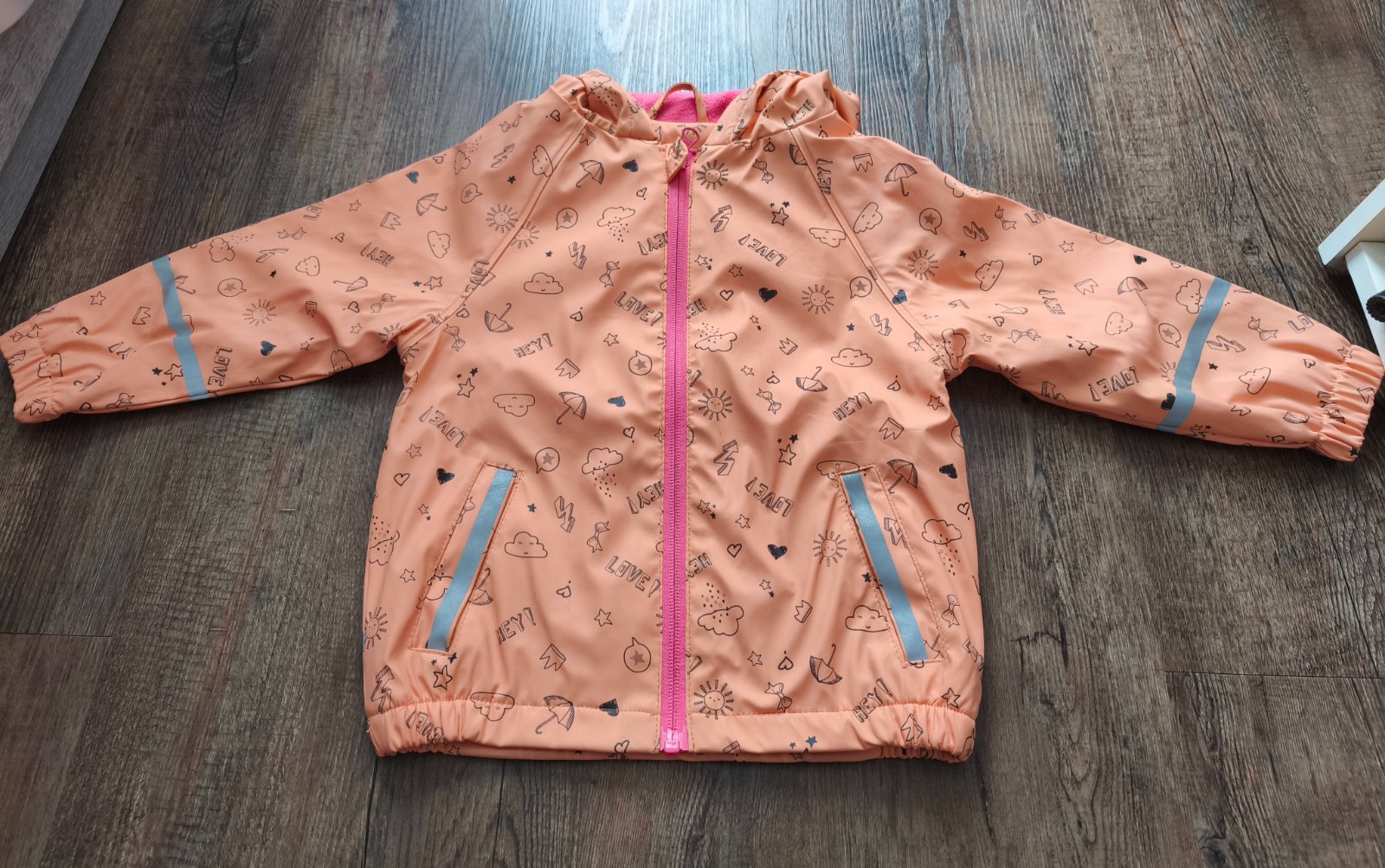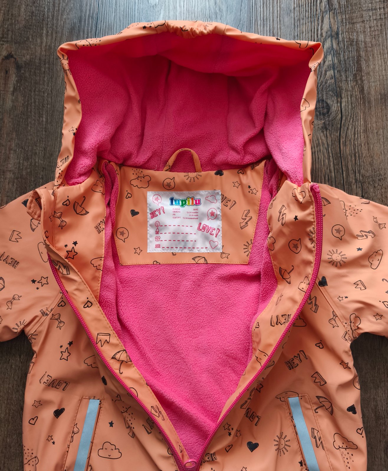 Predám krásnu oteplenú nepremokavú bundu vo výbornom nosenom stave. Veľkosť 86/92. Farba pekná oranžová, krajšia ako na fotkách.