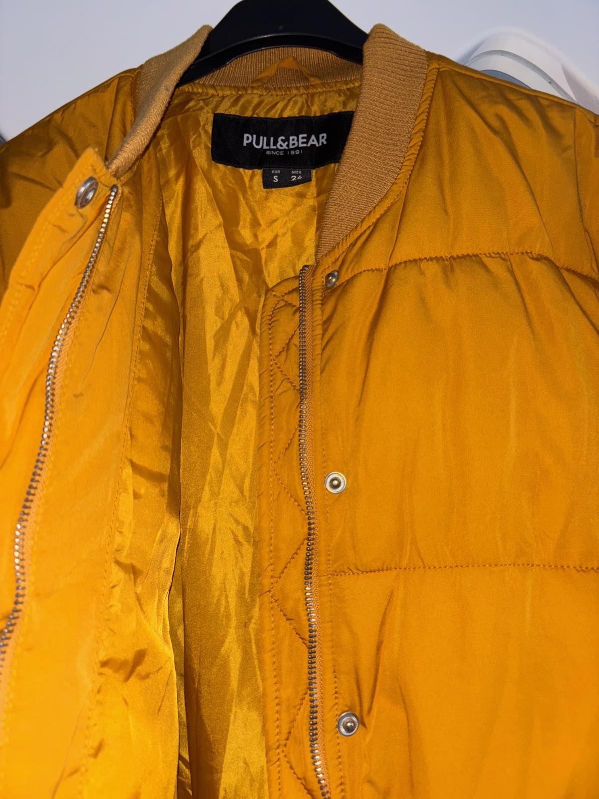 Výborný stav, horčicová,vatovana, určená na chladný prechod až miernu zimu, veľkosť S, sedí na S/M,s.54 cm,d.57 cm