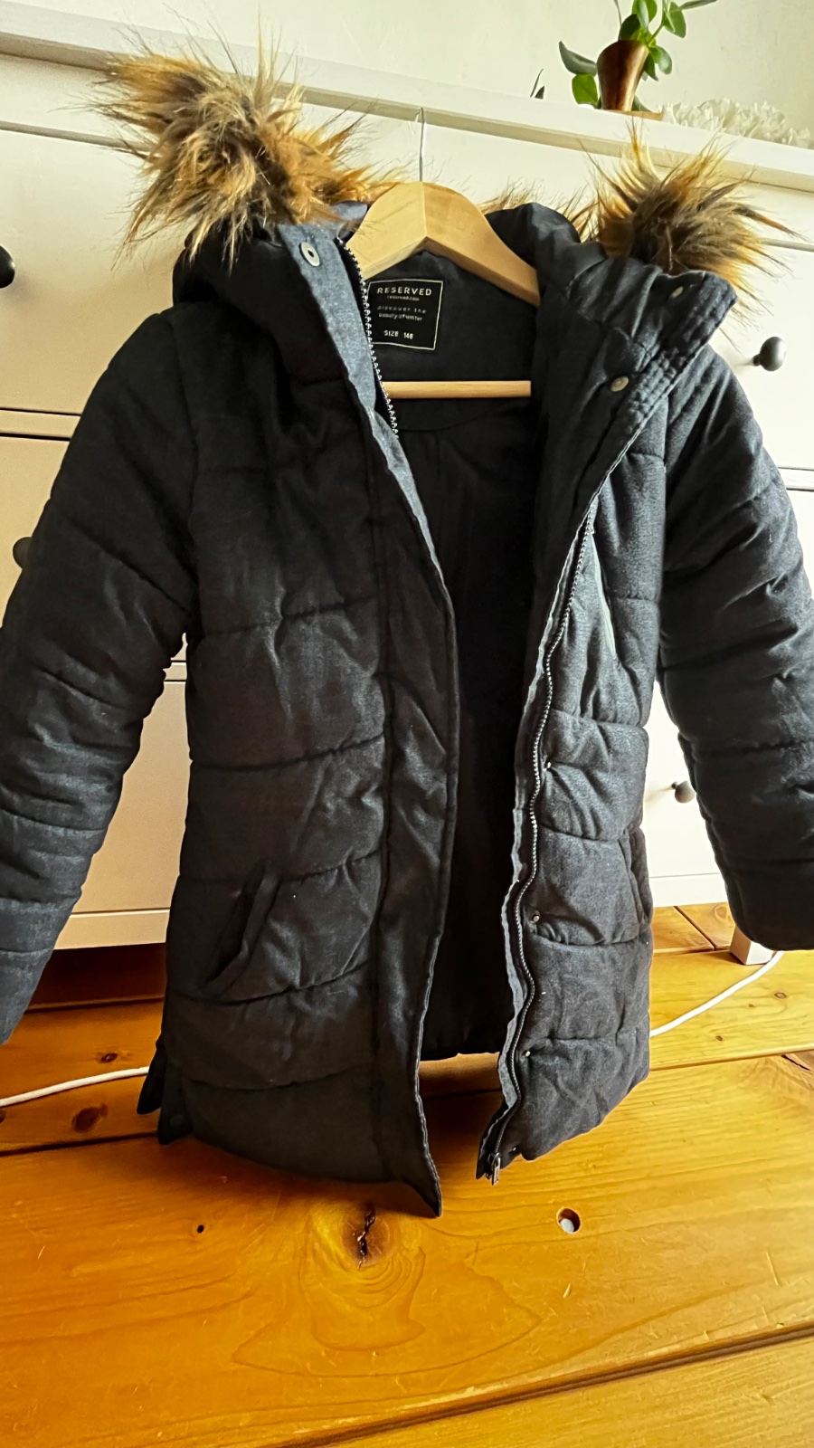 Predám veľmi teplú zimnú bundu, zn. Reserved, veľkosť 146. Tmavomodrej farby, zapínanie na zips, a cvoky, kapucňa, kožušinka odnímateľná. Nie je nepremokavá, je látková, no veľmi teplá. Nie je páperová. Vo veľmi dobrom stave, bez poškodení, nefajčiarske prostredie.
