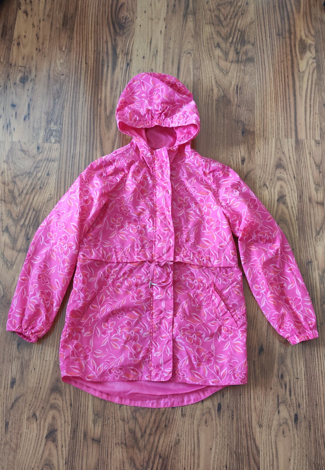 Bez poškodení a fľakov, v páse sa sťahuje šnúrkou, vpredu dĺžka 69cm, šírka v podpazuší 46cm, rukáv od krku 66cm.