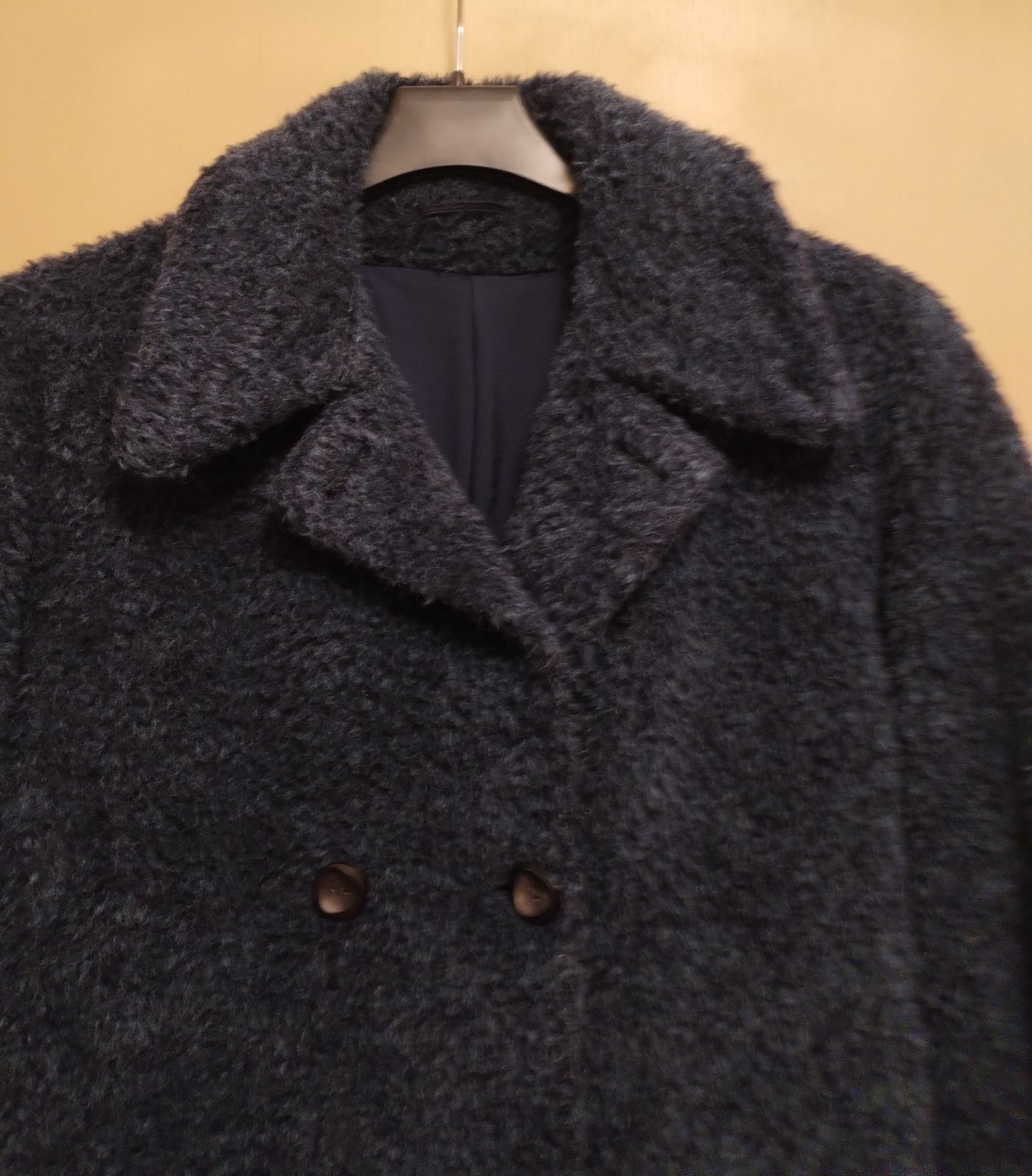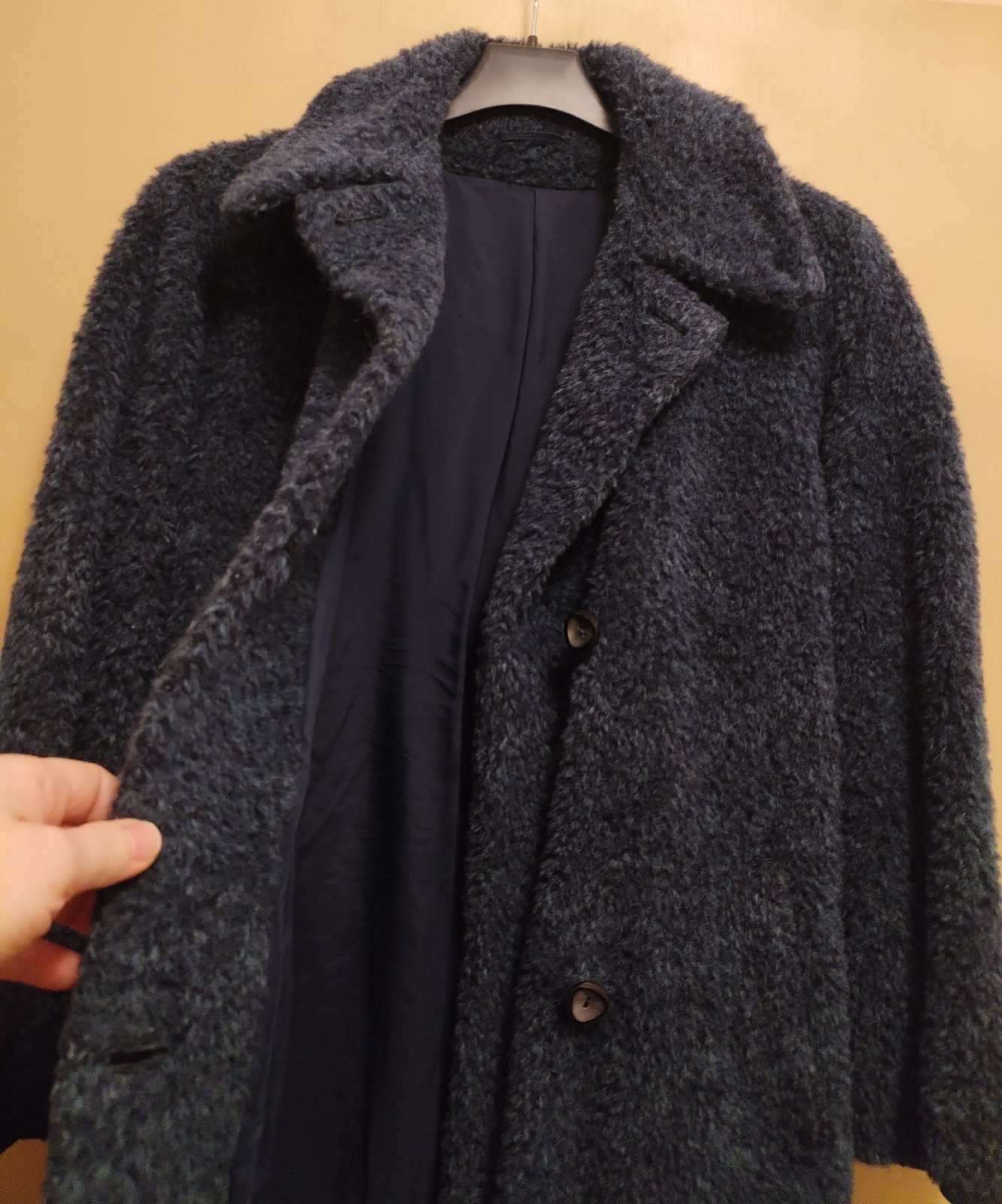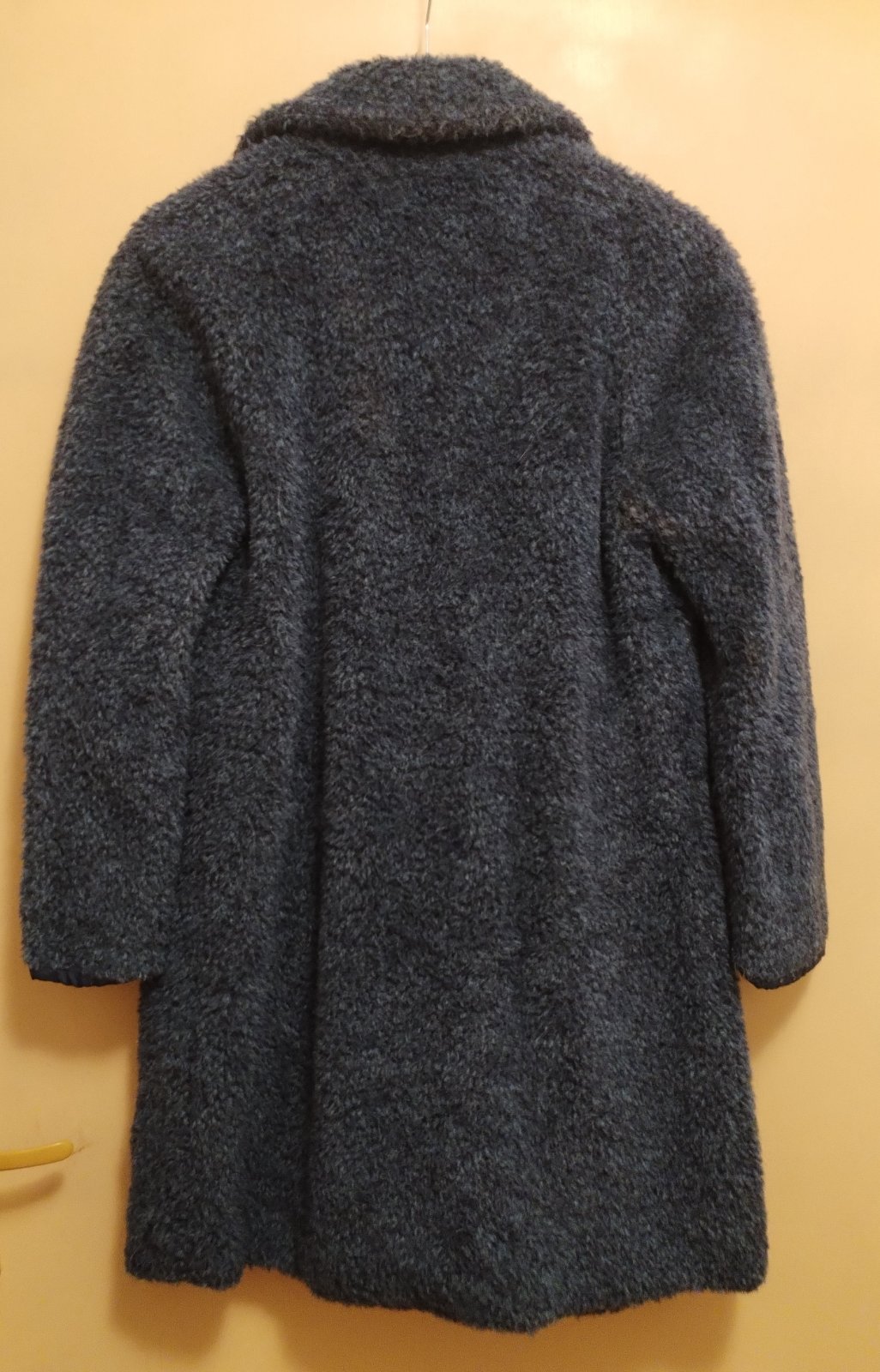 Dĺžka 118cm, šírka cez prsia 52cm a šírka v pase 50cm Super stav, Obsahuje vlnu a kašmír preto je veľmi teplý a kvalitný, nepoškodený Farba je taka tmavomodročierna