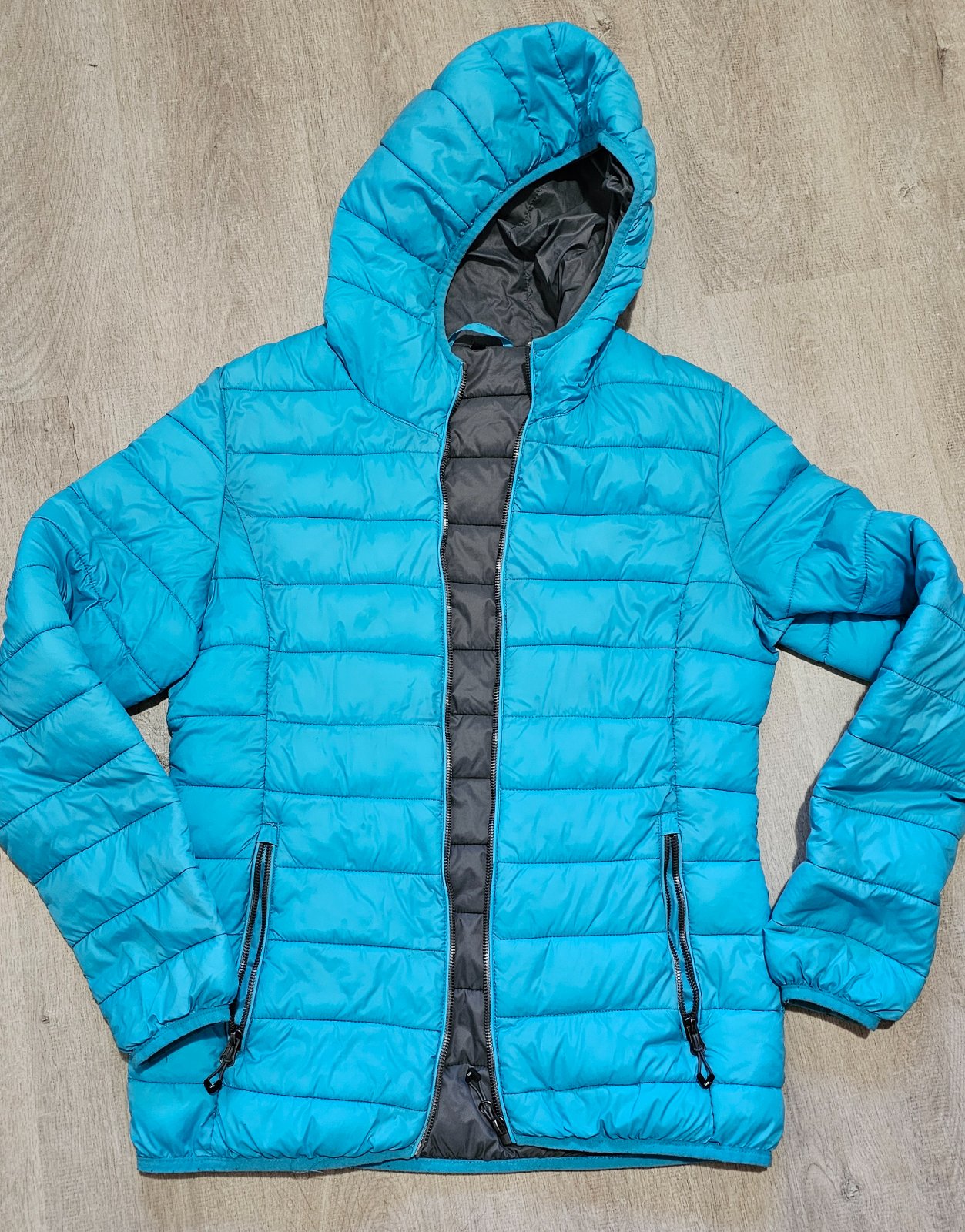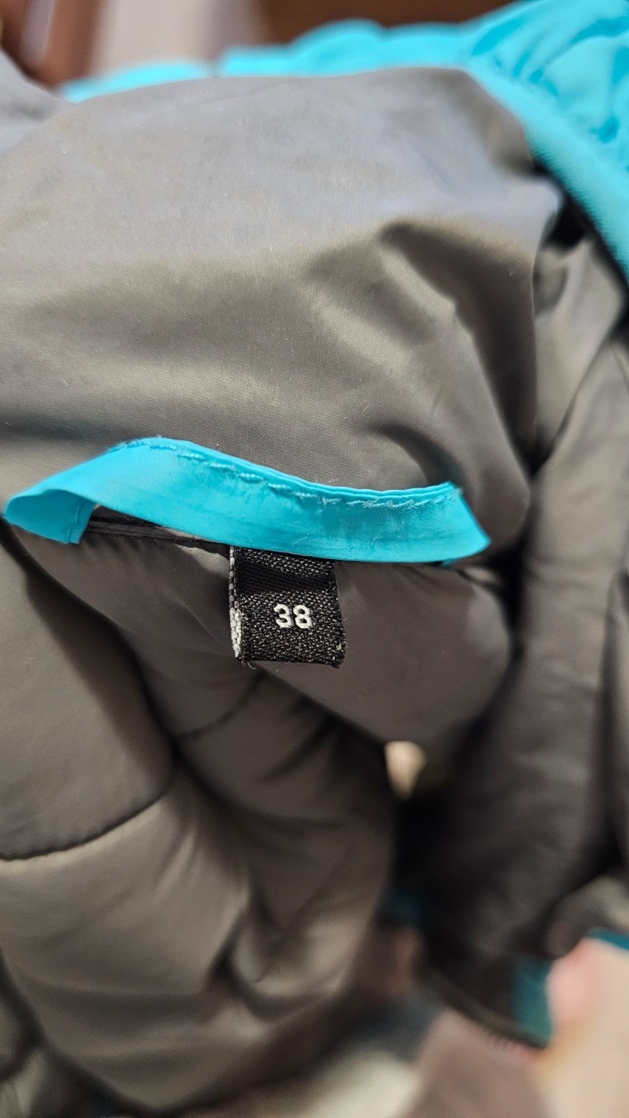 Predám prechodnú bundu tyrkysovej farbe.Farba je krásna,presne taká,ako na prvých fotkách.Velkosť sa píše S,ale určite nie je.Ja nosím 40 a je dobrá na mňa,preto píšem veľkosť 38-40,na 4.fotke sú r...