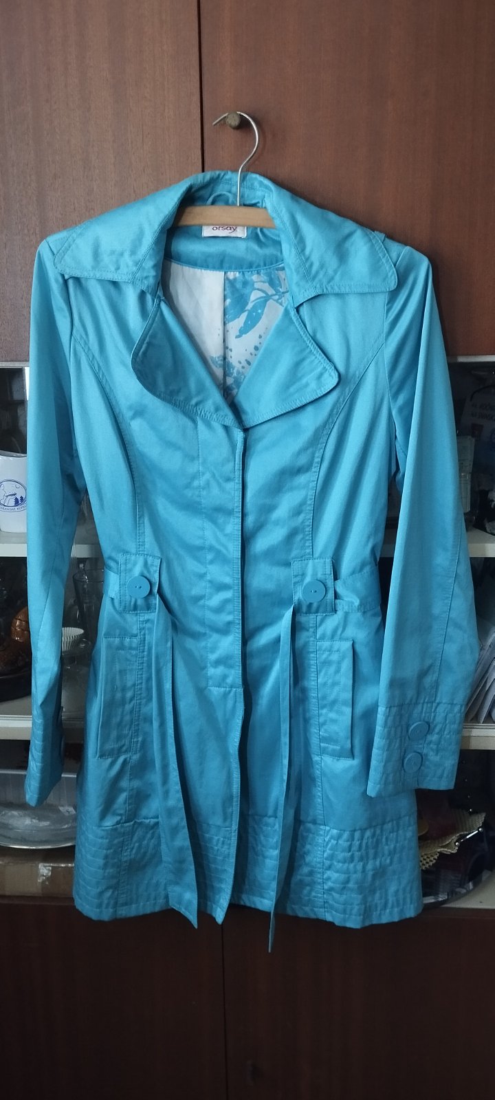 Damsky bledomodry kabat zn. Orsay, veľkosť 38. Nosený. Vyčisteny v cistiarni. pod pazuchami 48 cm v páse 40 cm dĺžka rukáva 60 cm Dĺžka od pleca dole 83 cm