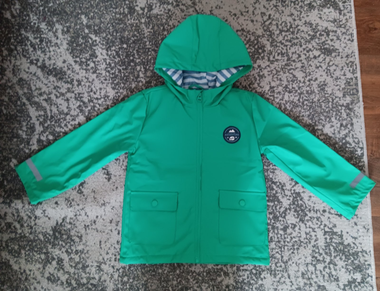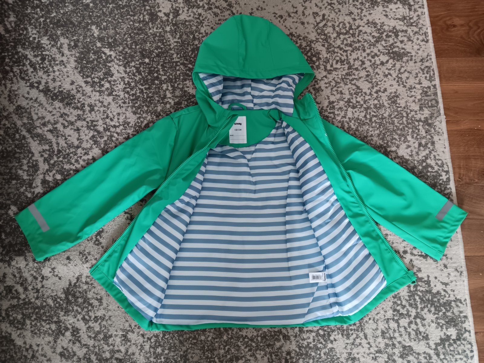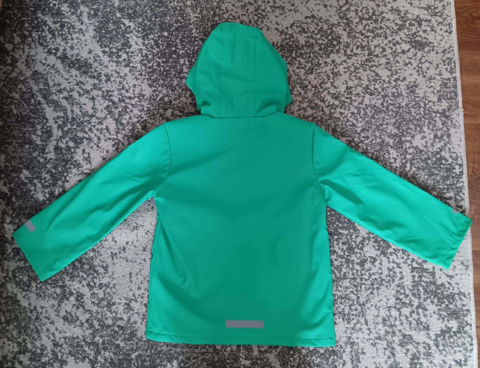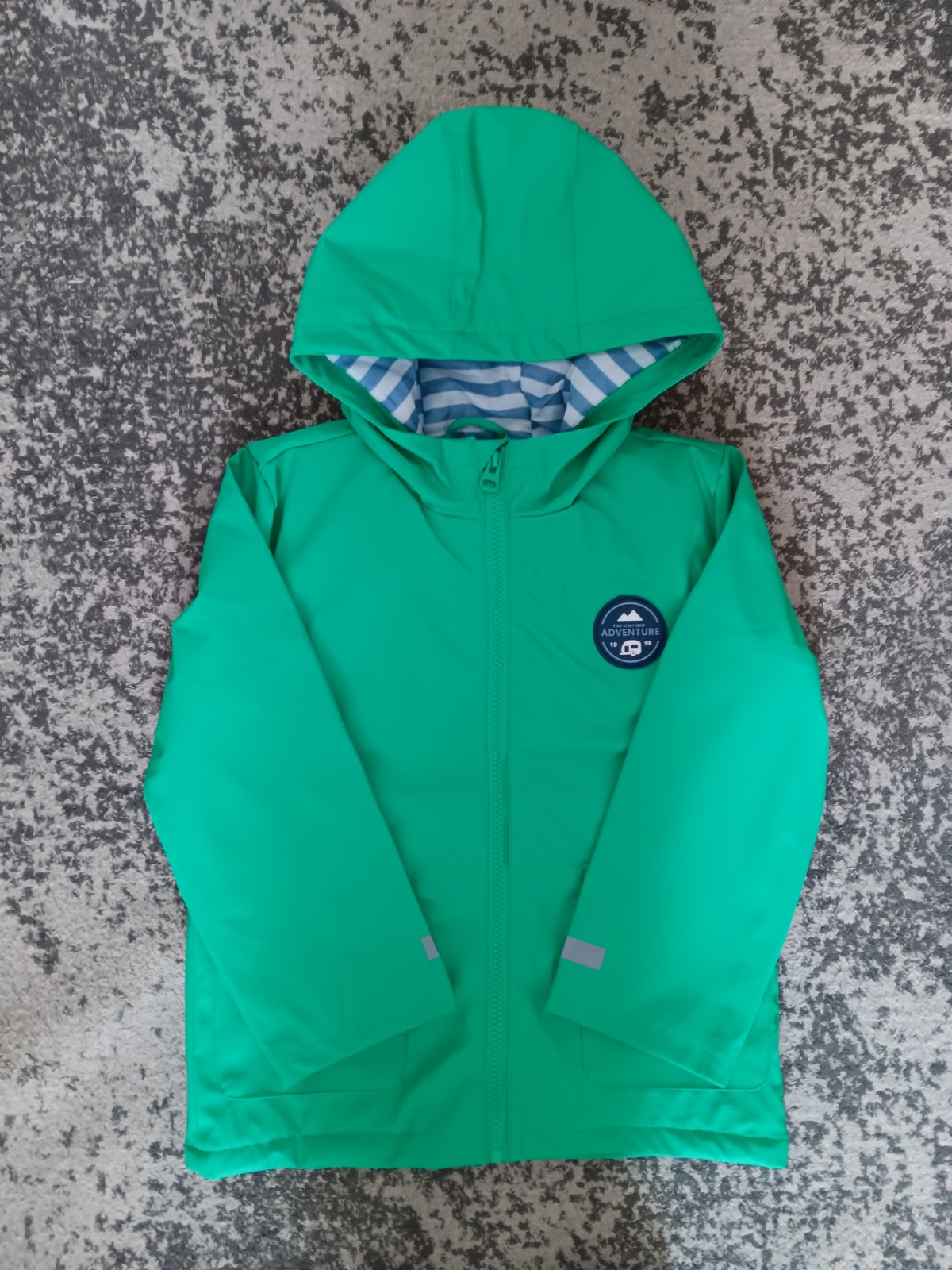 Nová (bez visačky) zelená pogumovaná, bunda do dažda, veľ. 122, zn. Sinsay, cena 7€.