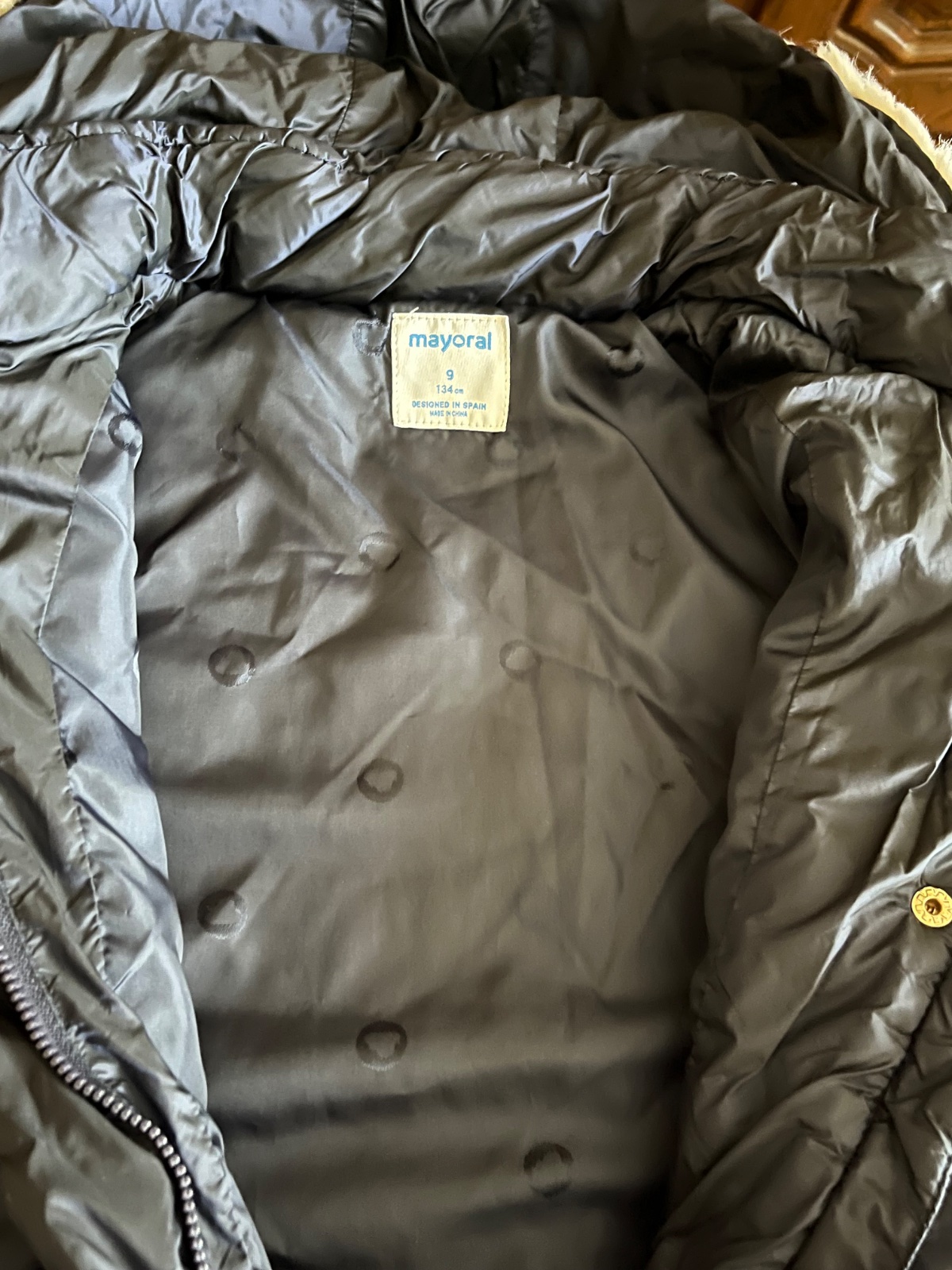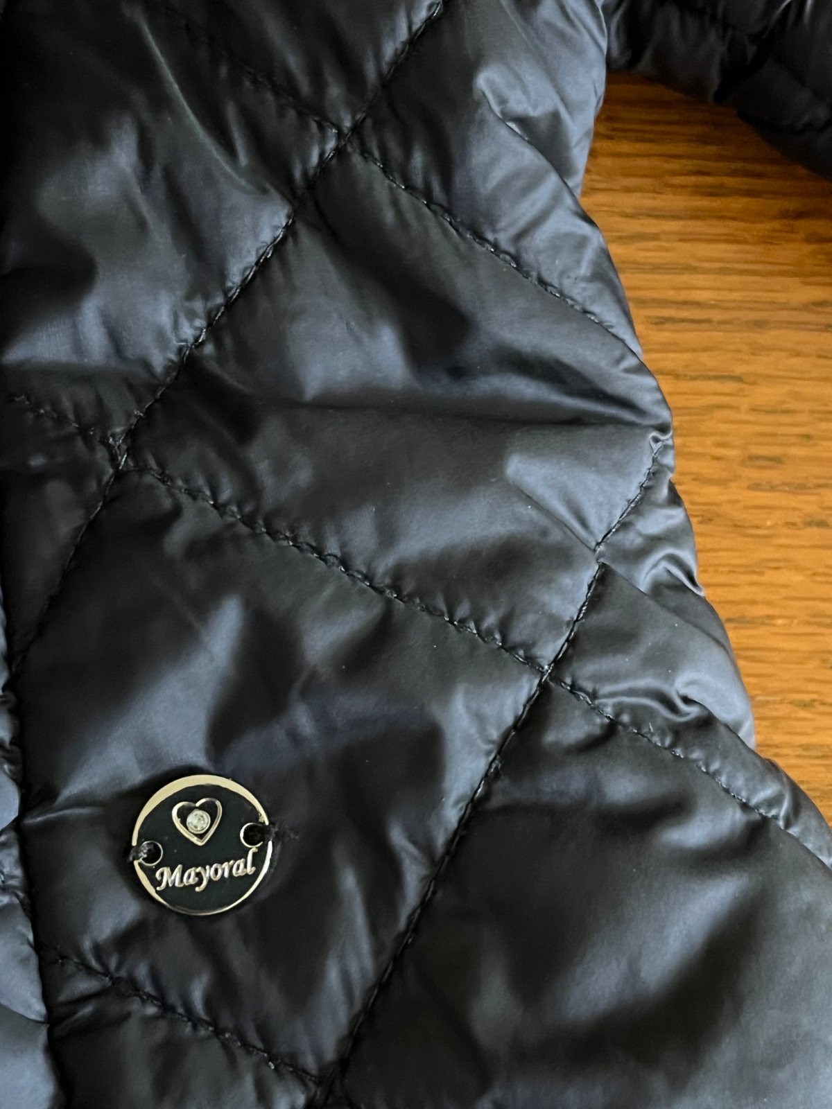 Na bežci zipsu a na nitoch vyrazený nápis značky Mayoral, rovnaký vzor je na podšívke zvnútra bundy. Na ľavom rukáve ozdobná aplikácia s nápisom značky a trblietavými kamienkami, po bokoch vrecká. Naspodku zvnútra tvarovacie gumičky. Na rukávoch zvnútra gumka proti podfúknutiu chladu do rukáva.