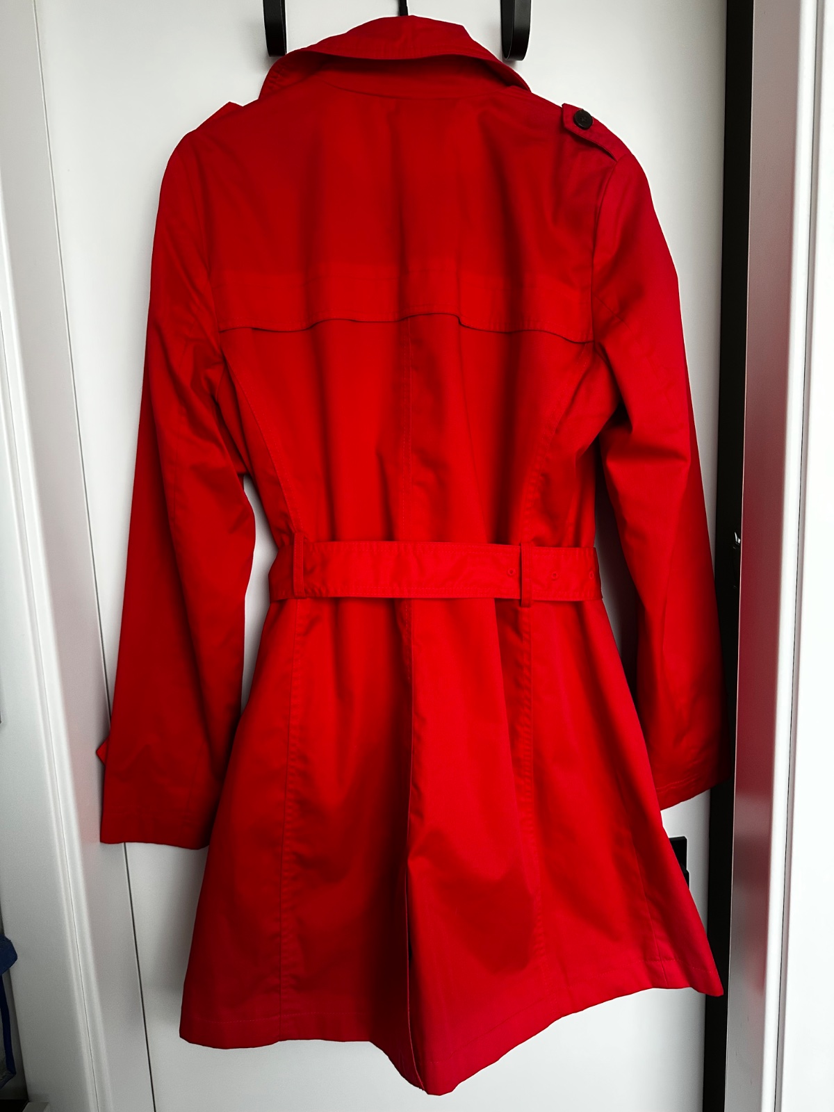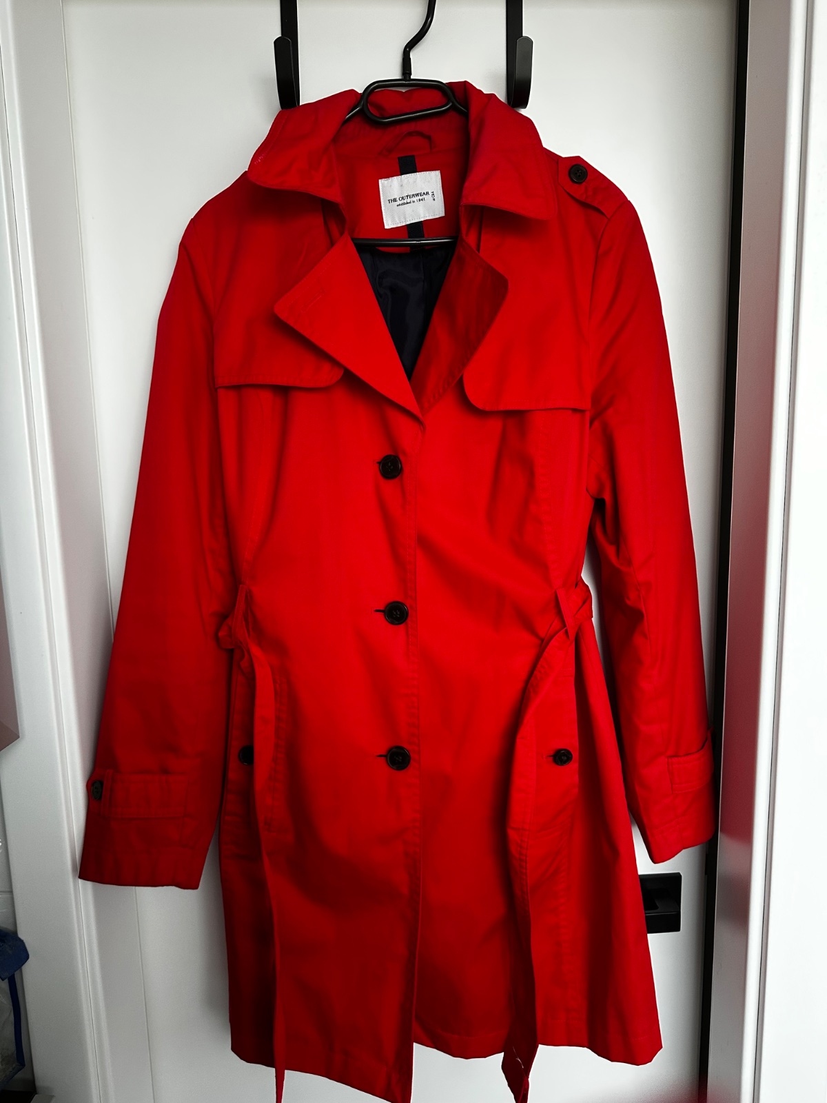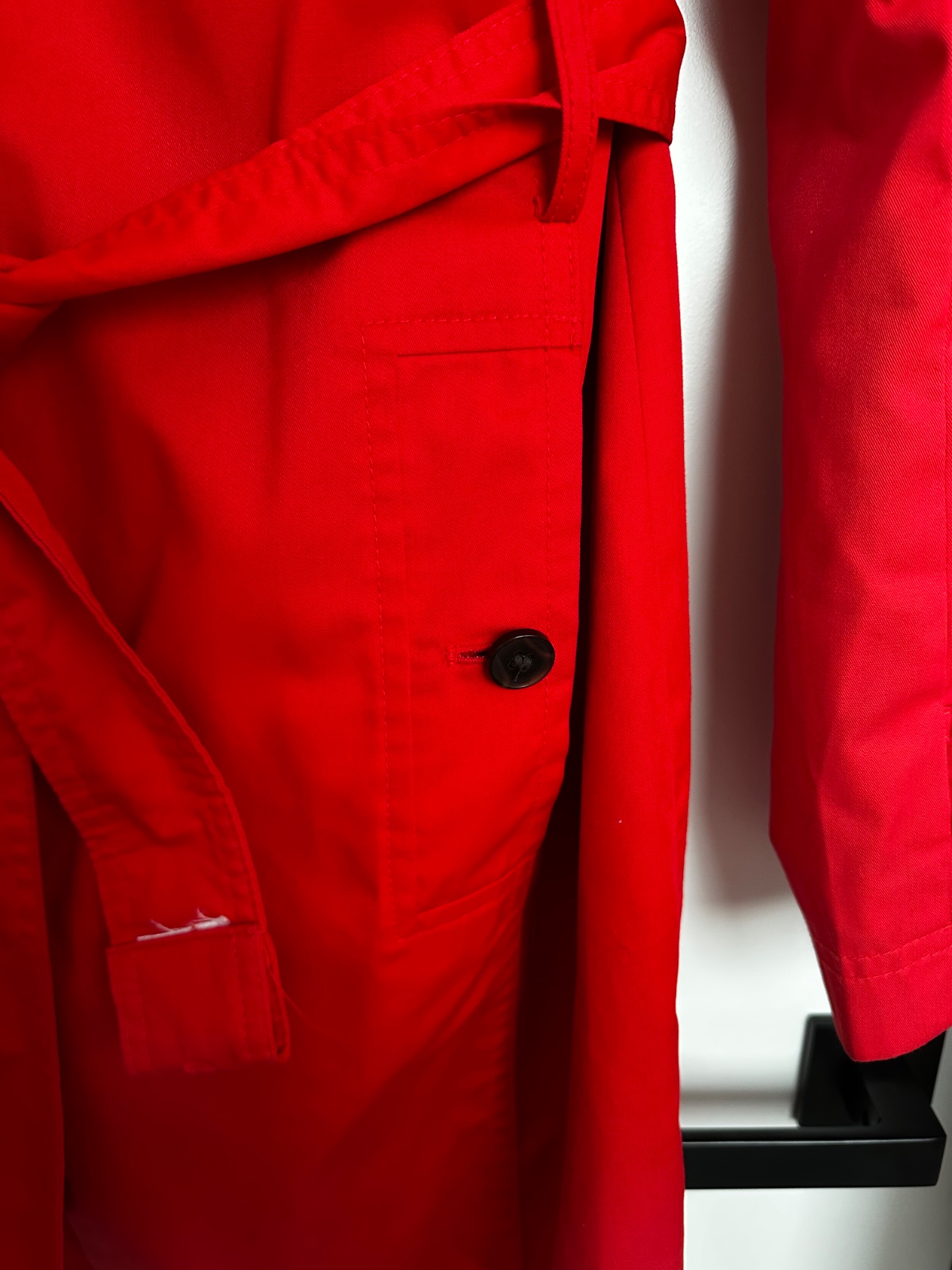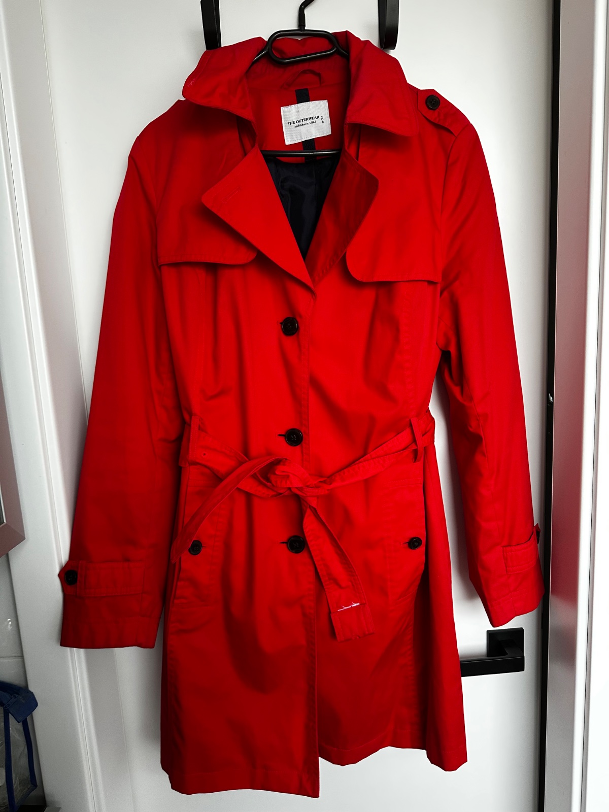 Predávam štýlový a neprehliadnuteľný trenčkot od značky C&A v červenej farbe. Kabát má klasický strih trenčkotu s jednoradovým zapínaním na čierne gombíky, s efektnými klopami na pleciach a manžetami s prackami na rukávoch. Súčasťou je aj opasok. Jediné poškodenie sa týka opasku – chýba mu pracka. Opasok je možné aj napriek tomu bez problémov nosiť a uväzovať na uzol