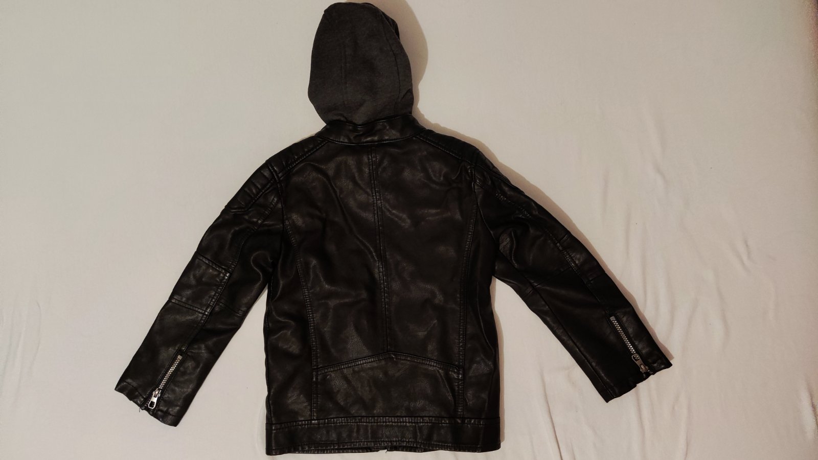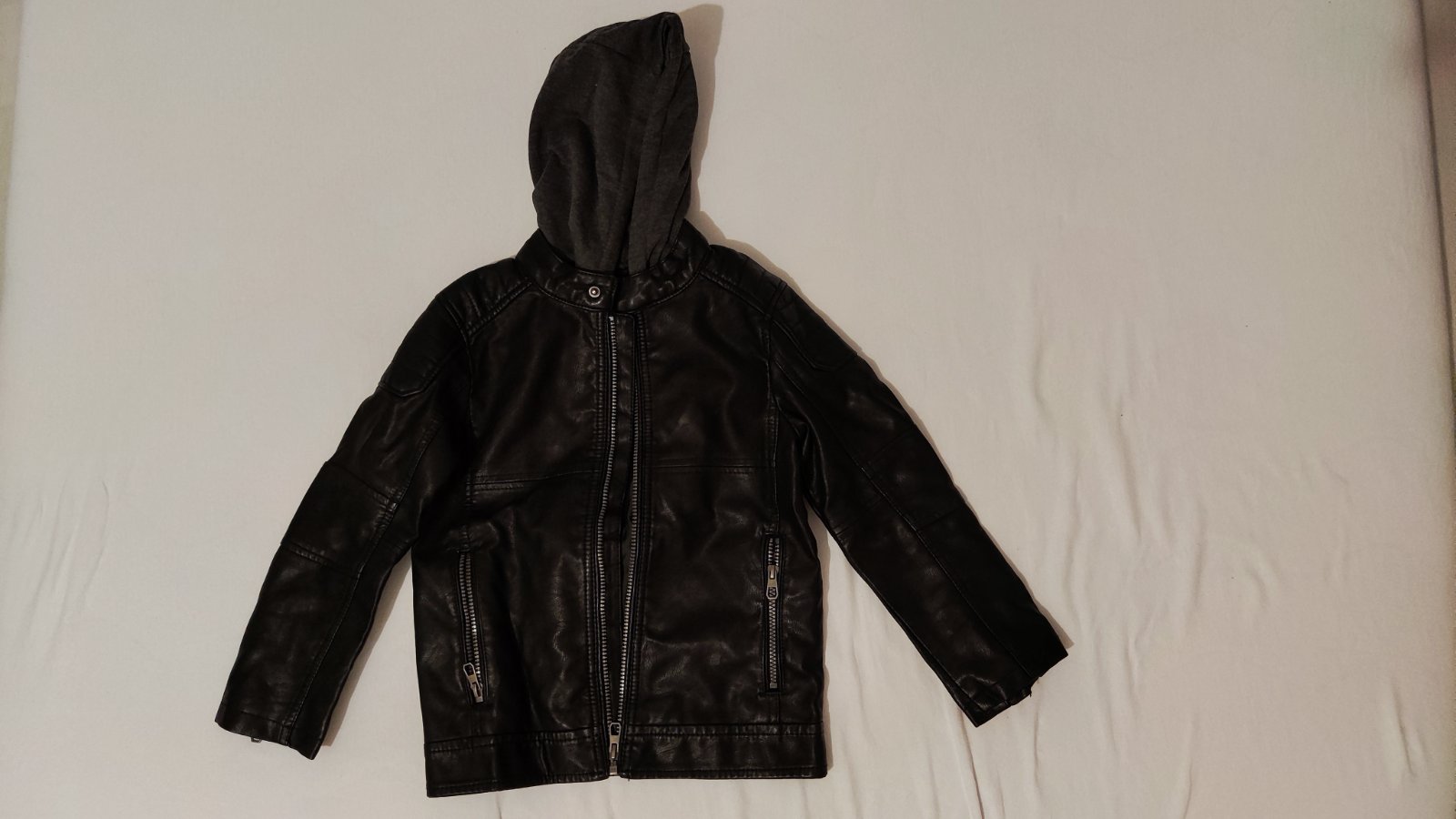 krásna koženková bunda vo veľmi dobrom stave, párkrát oblečená, kapucňa je tmavo šedá, teplakoveho materiálu, č.128