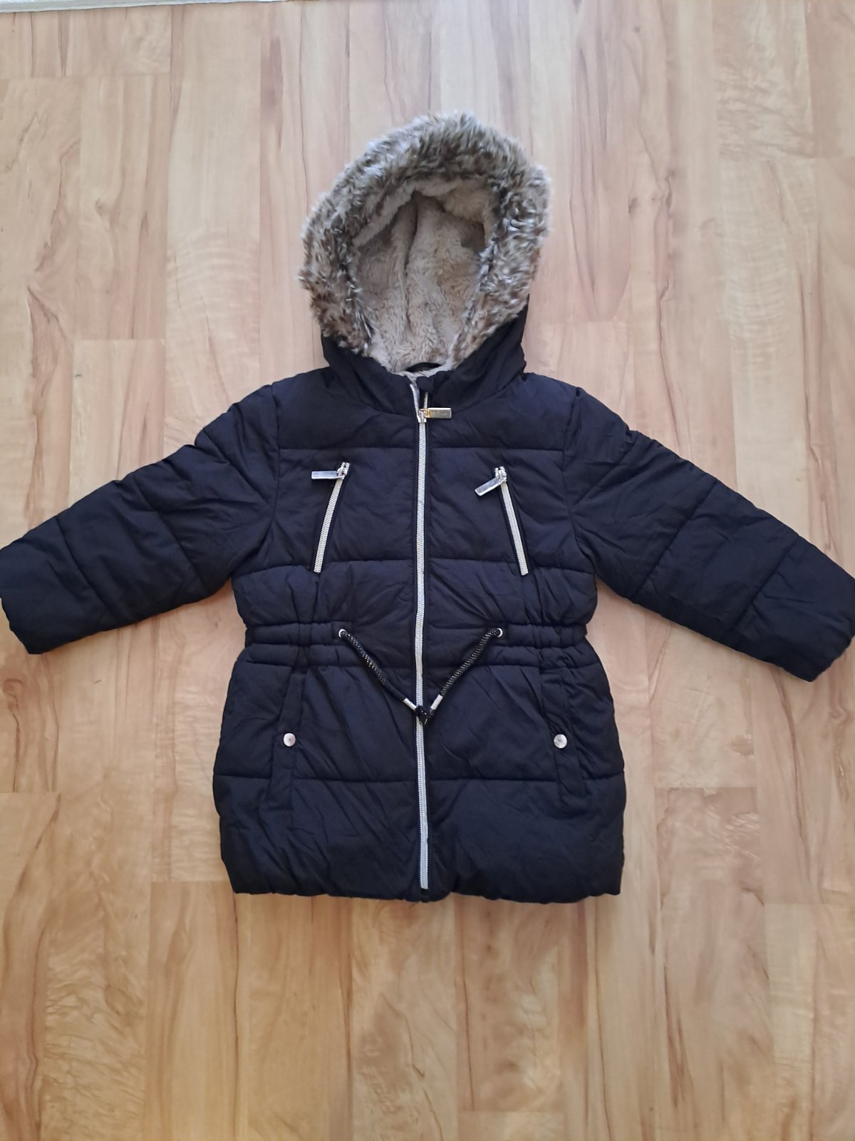 Skvelá zimná bundička - kabát vnútri podsita kožušinkou Veľkosť 110, 4-5 rokov Reflexný prvok vzadu Kapucňa napevno sú k nim aj rukavičky Dĺžka od ramena 47 Rukáv od šije 43 Nosena bez poskodeni