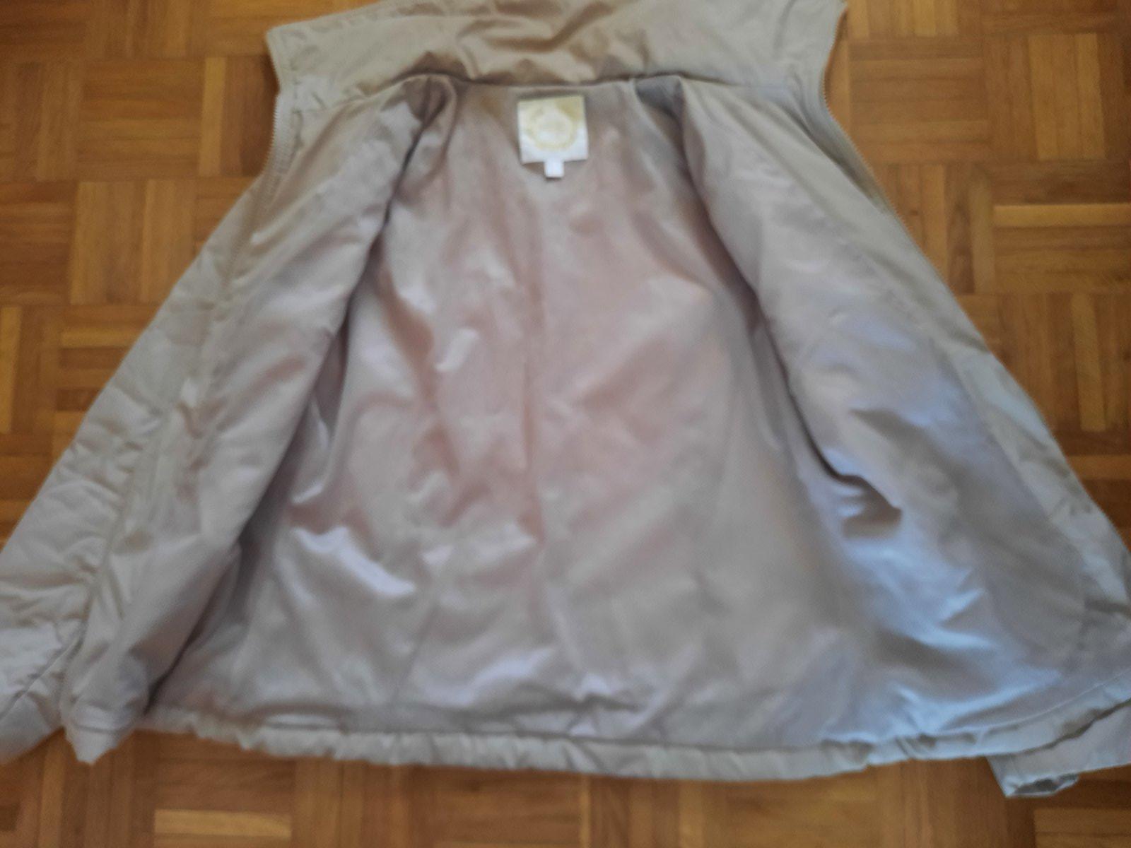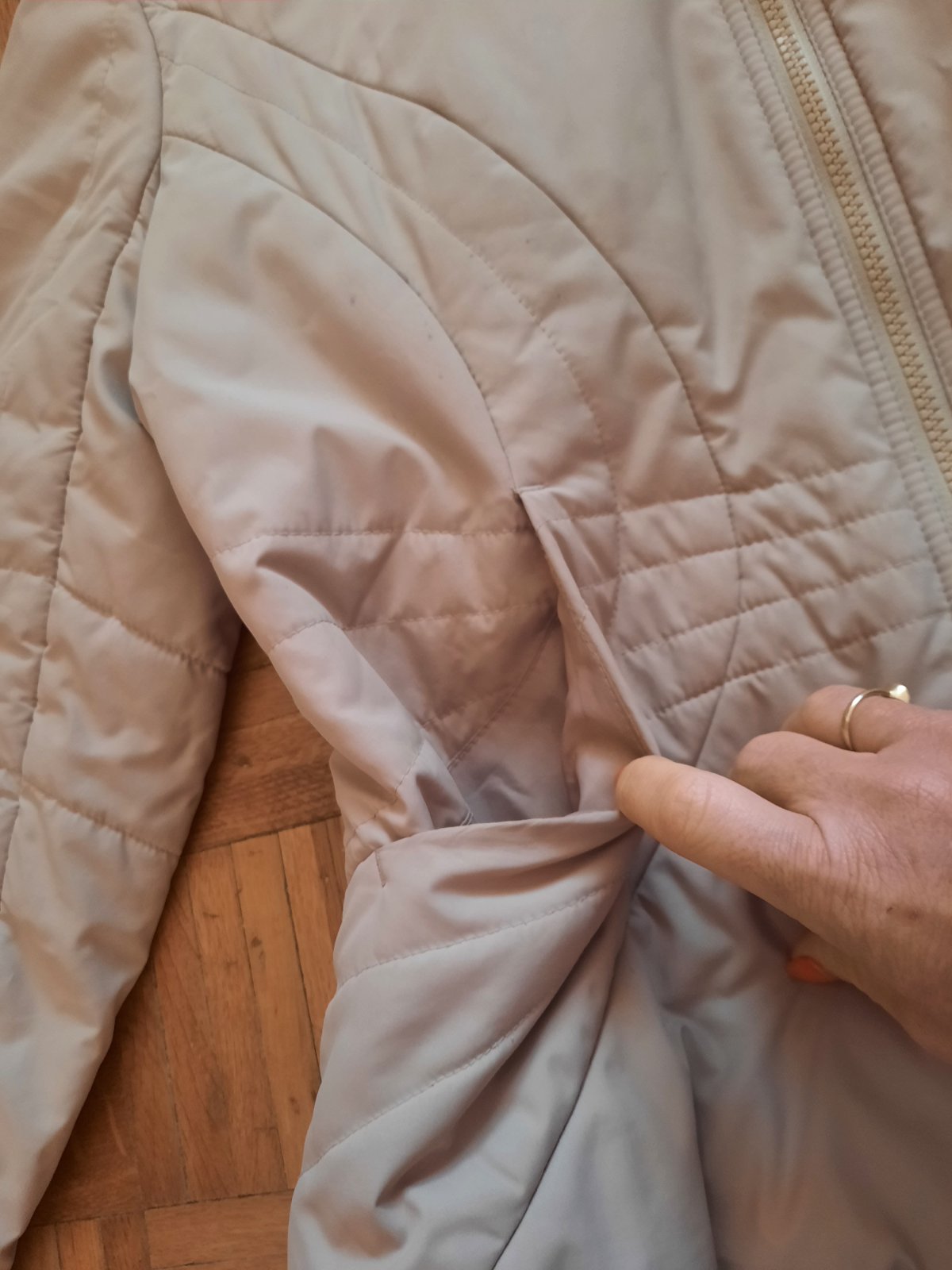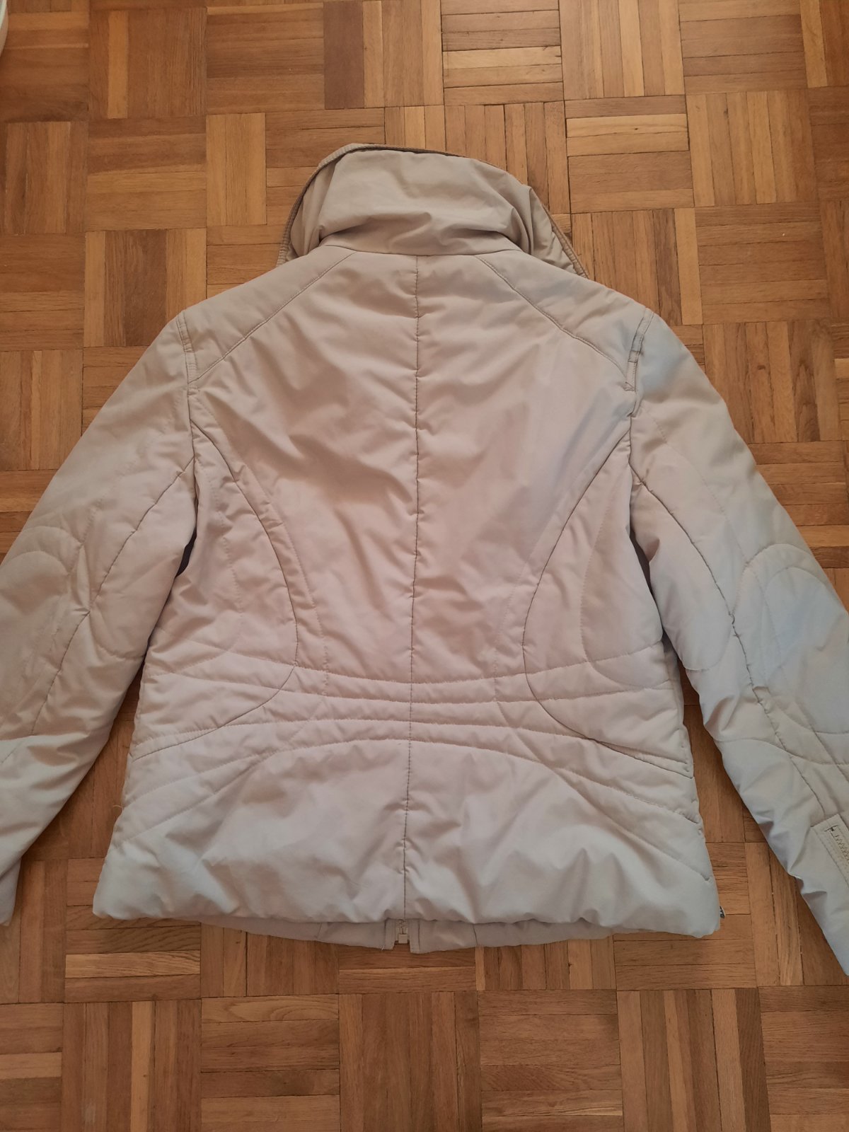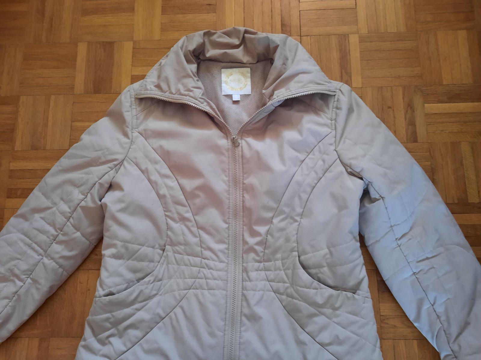 Pekná dámska bunda, zaujímavo poprešívaná. Na rukáve je ozdobný zips. Vačky sú vpredu. Vo vnútri na jednom kúsku sú jemné žmoľky.