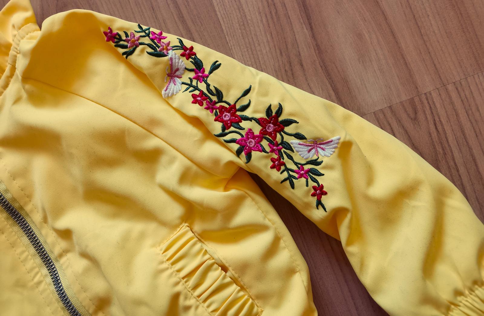 Krátka, sýto žltá bomber bundička s krásnou výšivkou na rukávoch, nová, nenosená, Kupovali sme pred zimou a žiaľ na jar sa tam už dcéra nezmestila :-D je to tenšia, prechodná bundička, zapínanie na zips, s volánikom okolo krku. Veľkosť 92, dĺžka 32cm, šírka 2x31cm, rukáv od krku 37cm.