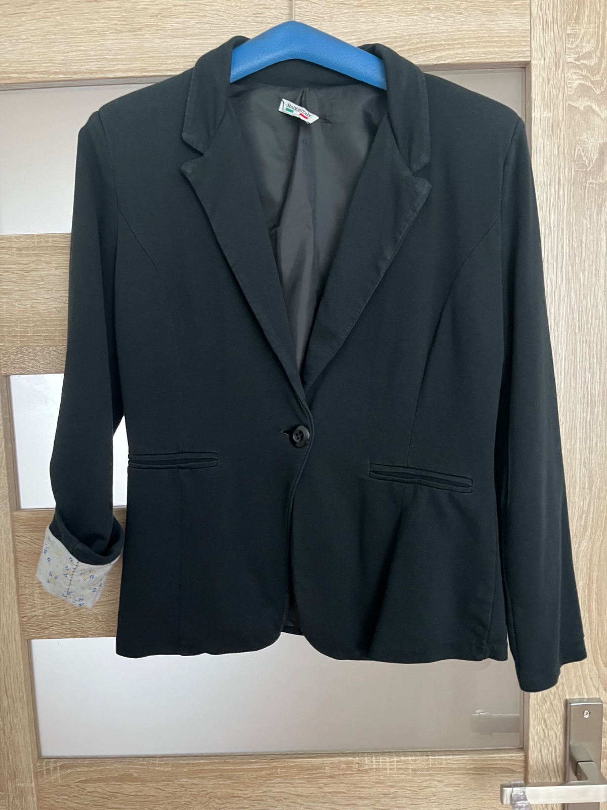 Predám dámske látkové čierne sako, na rukávoch kvietková podšívka. V prípade potreby premeriam.
