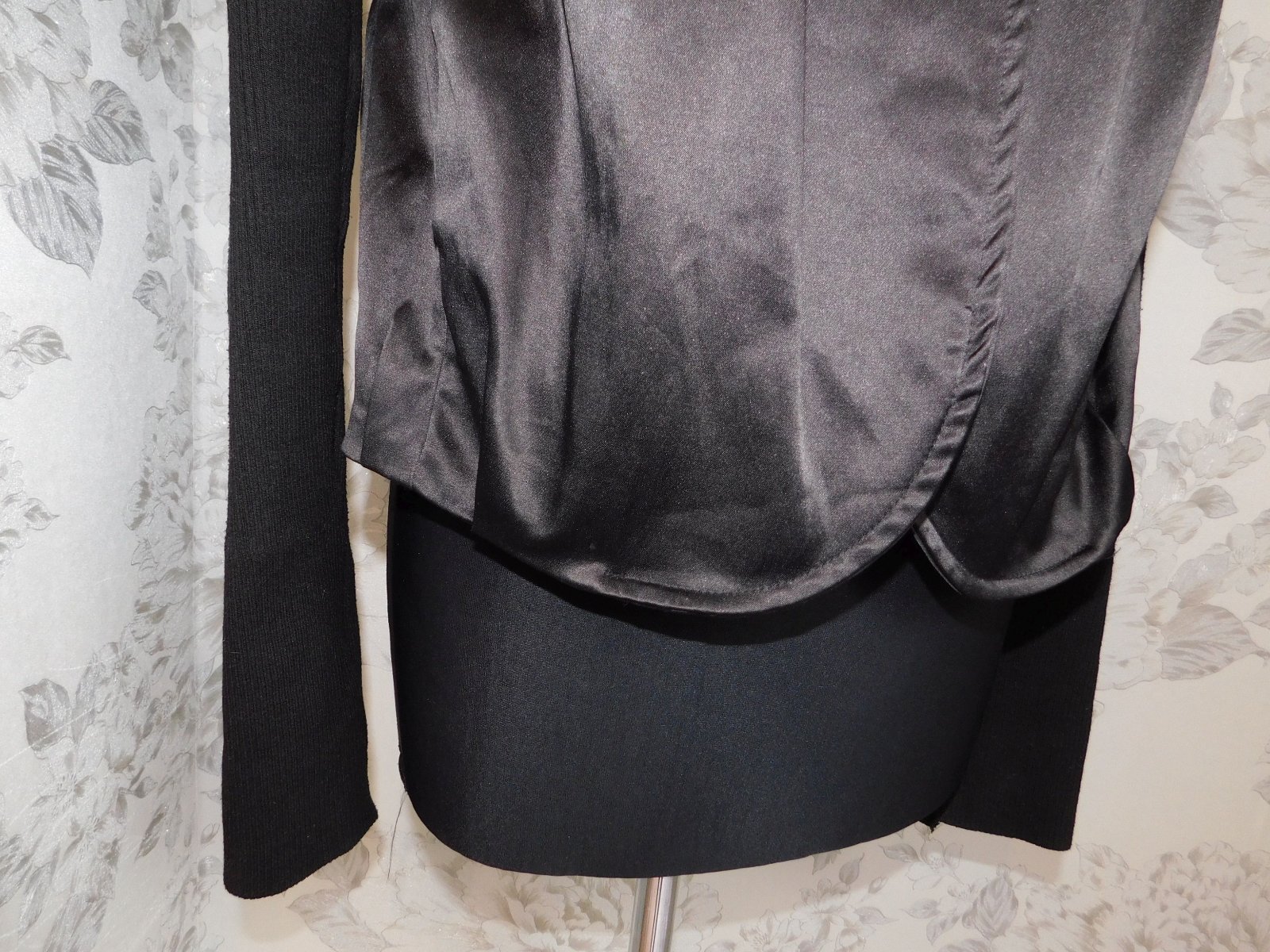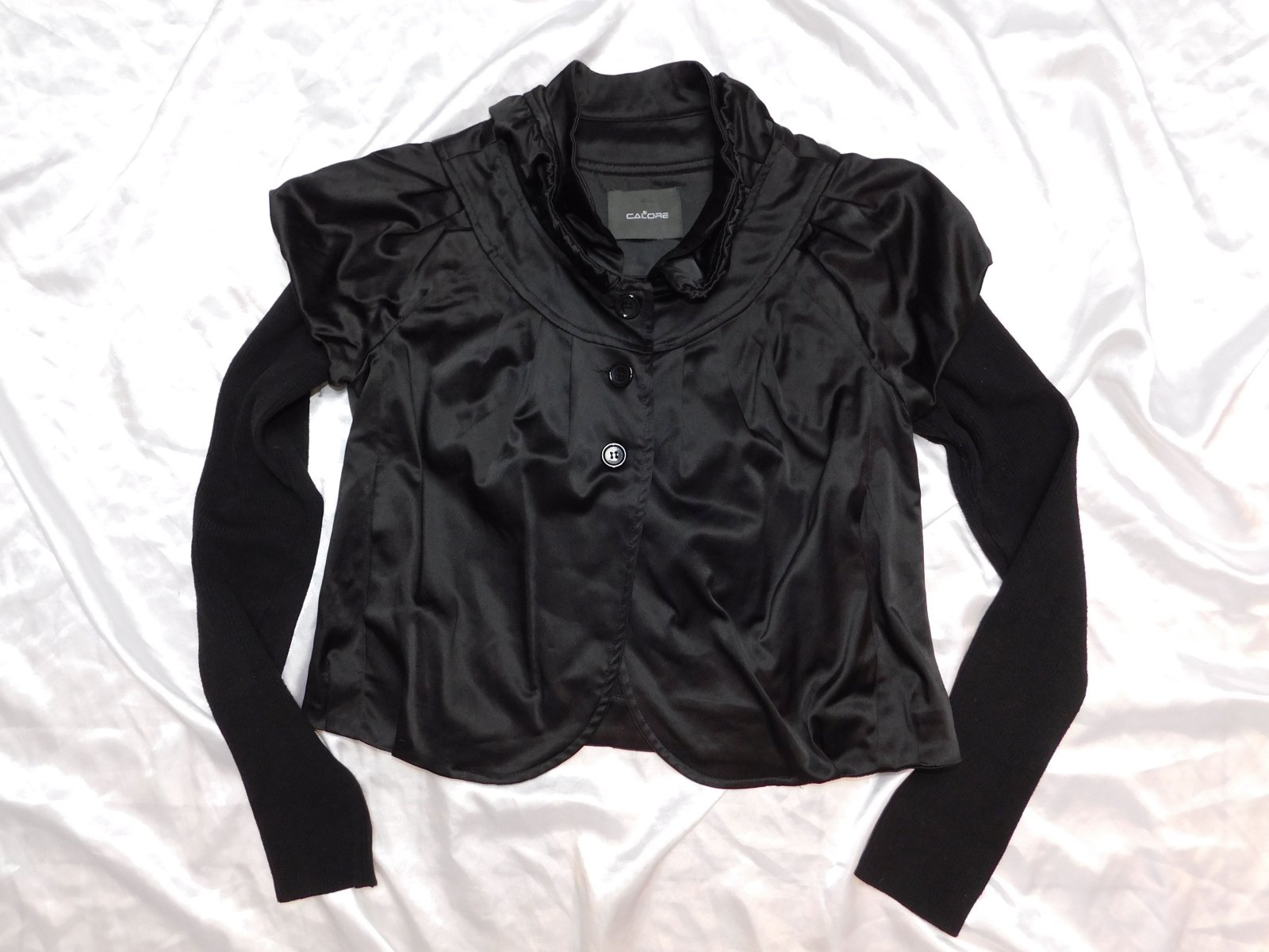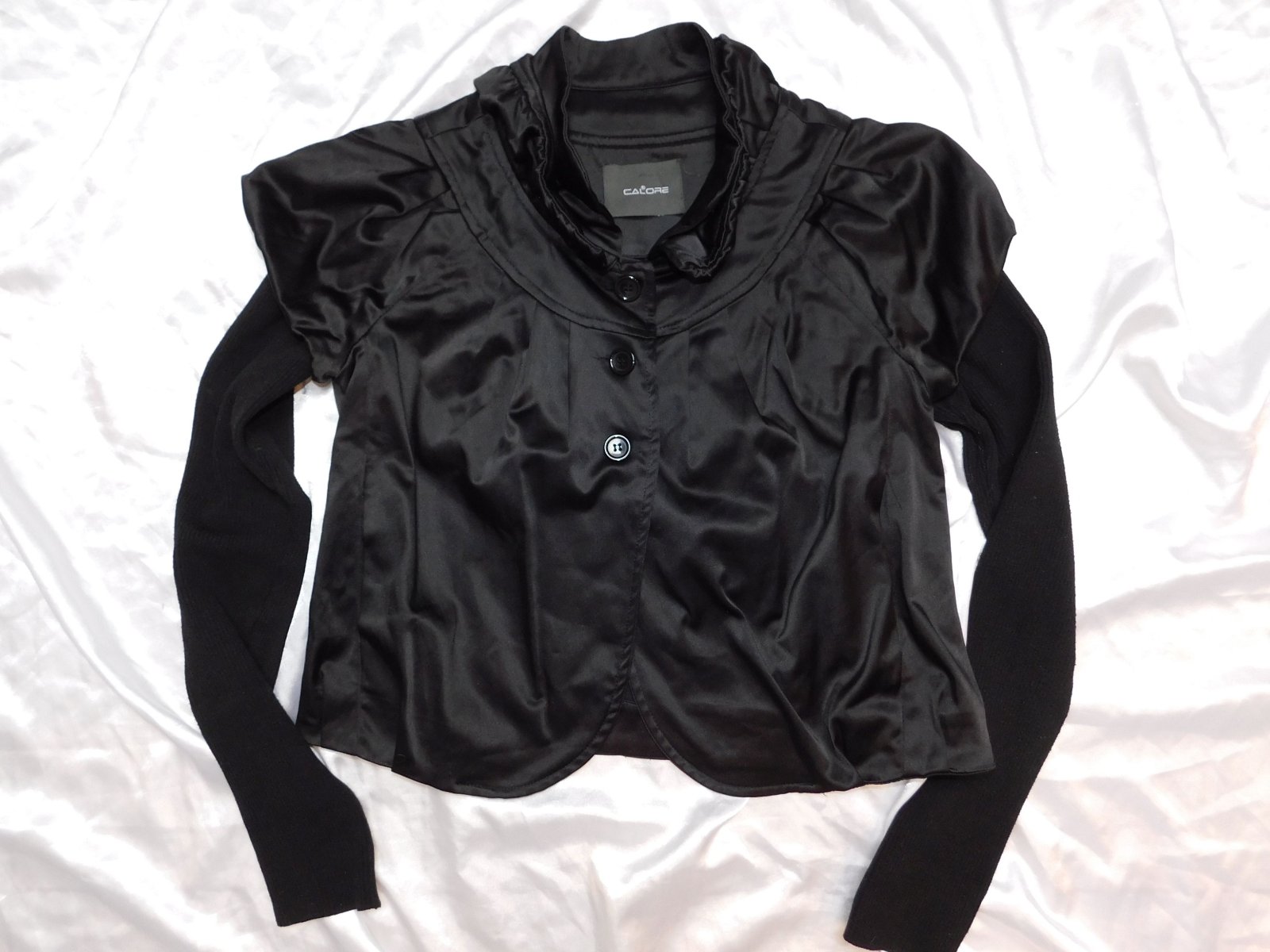 Kvalitny trendy štylovy blejzer,čiernej farby,vrubkovaneuletove rukavy.96%polyester,4%elastan.80%acrylic,20%polyester.pozor-na upletovych rukavoch su jemne drobne žmolky,inak super stav. j23