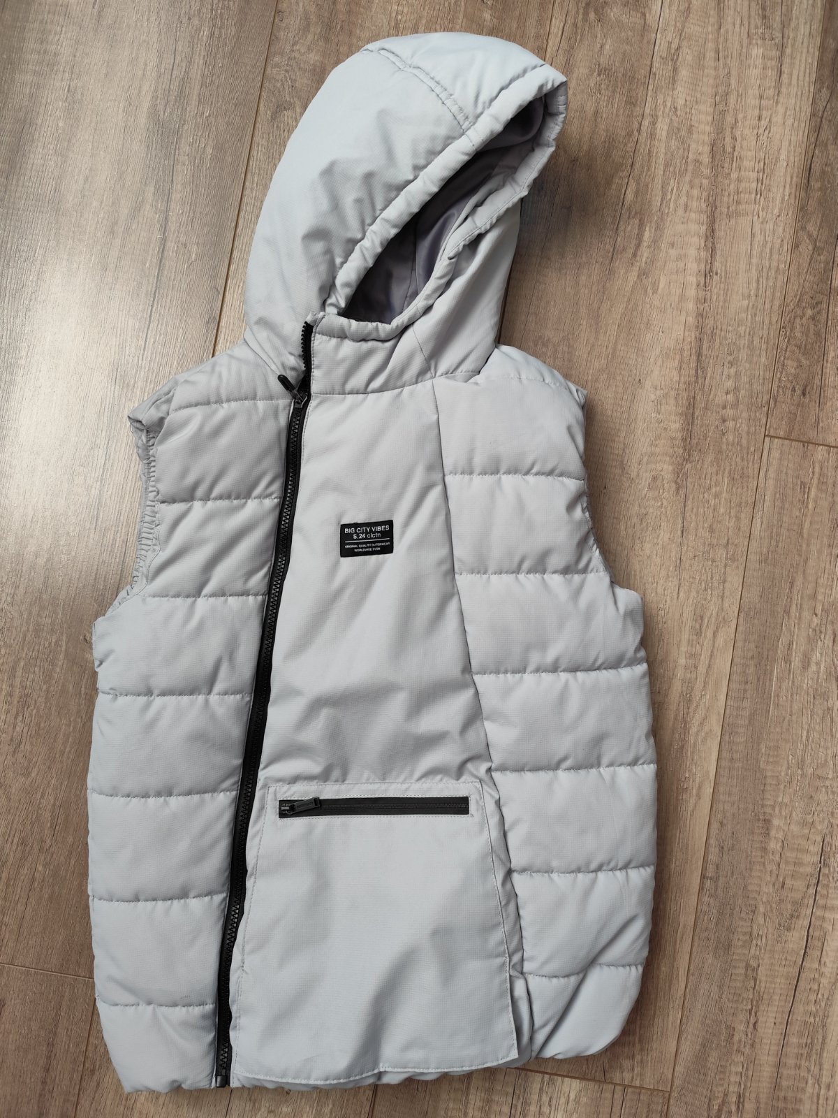 Málo nosena vesta, na jednom vrecku je odpáraný 1 suchý zips,pri nosení nevidieť. Rozmer cez prsia 2x43cm, dĺžka 55cm.
