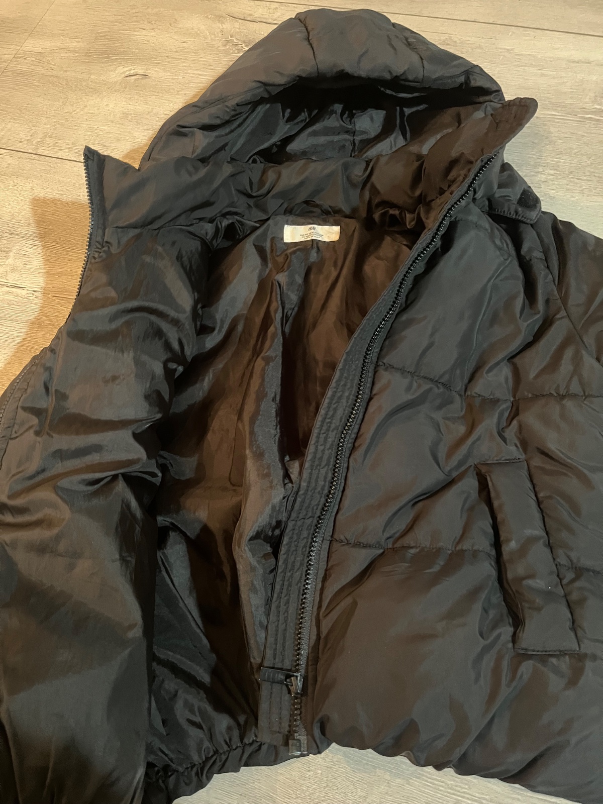 Cierna h@m bunda dlhsua super sedi pekne presivana vnut patent v rukave. Lahka pohodlna v.152 aj pre utlu mamcu. Je v top stave mozno 3x oblecena ako nova.