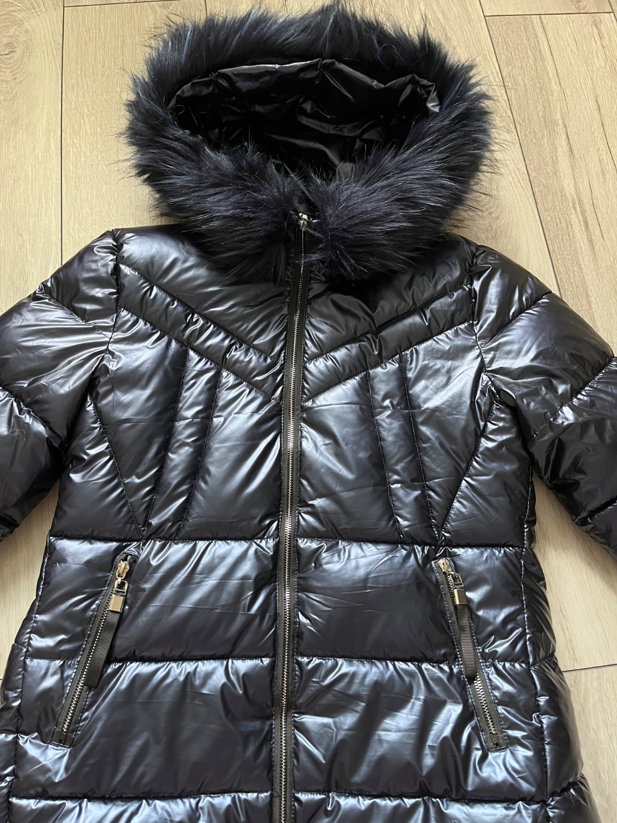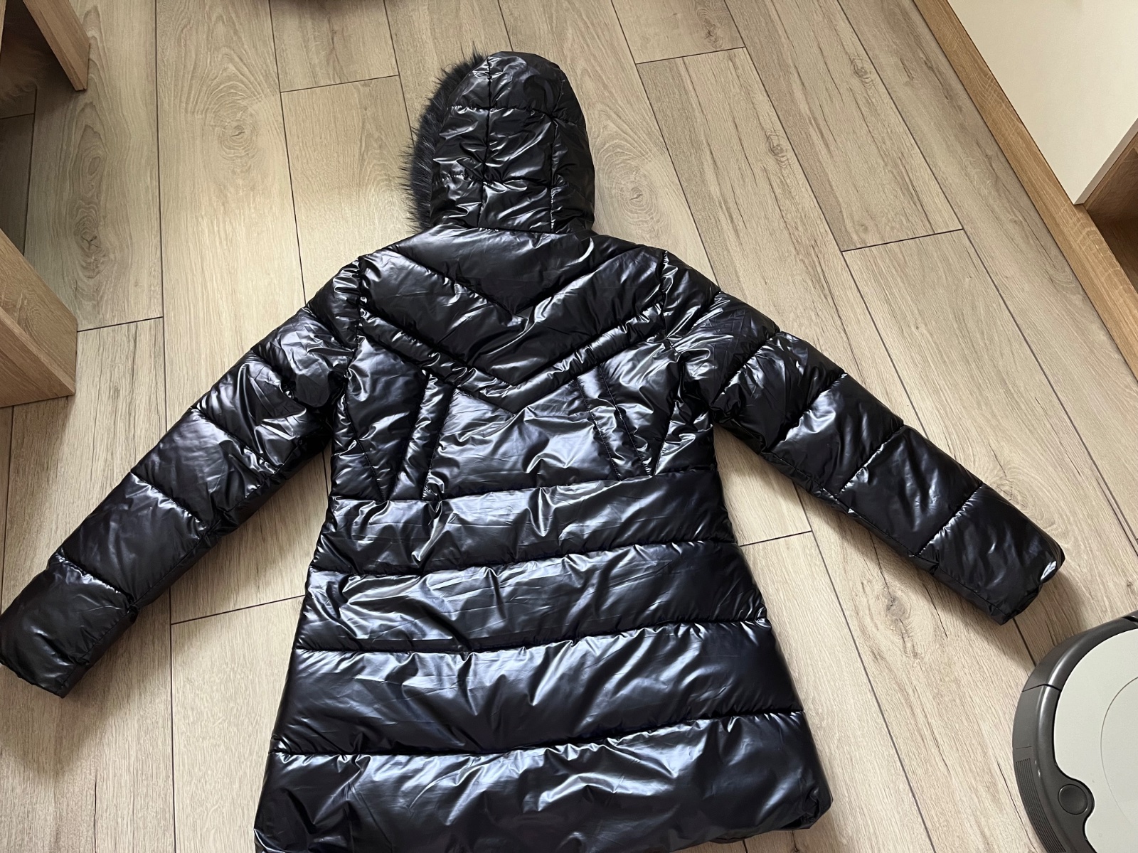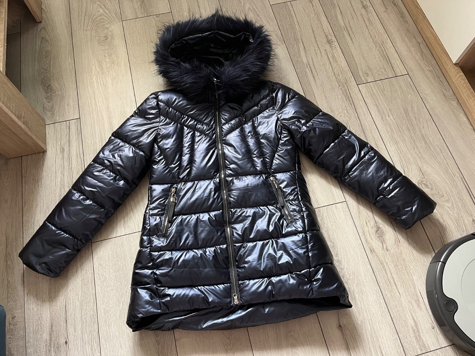 Lesklá bunda v top stave,bez chyb,s odopínateľnou kožušinou na kapucni.