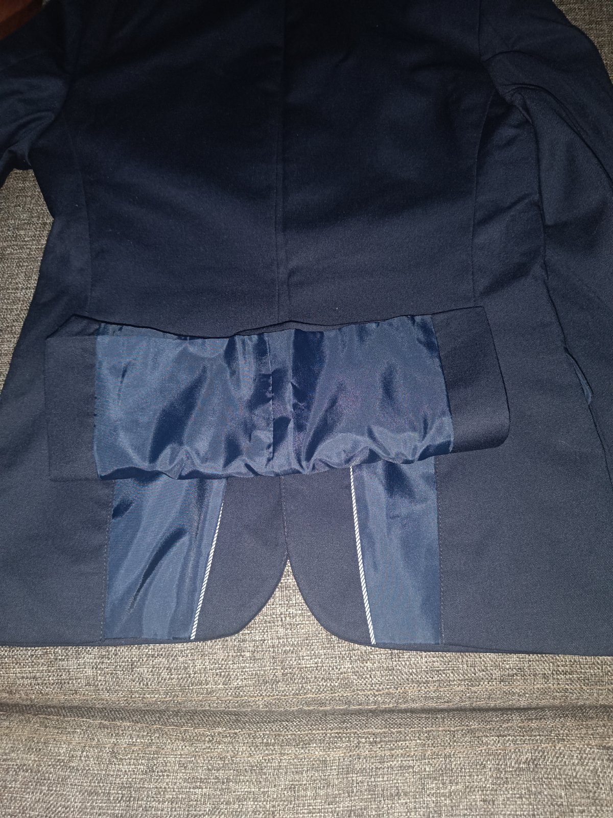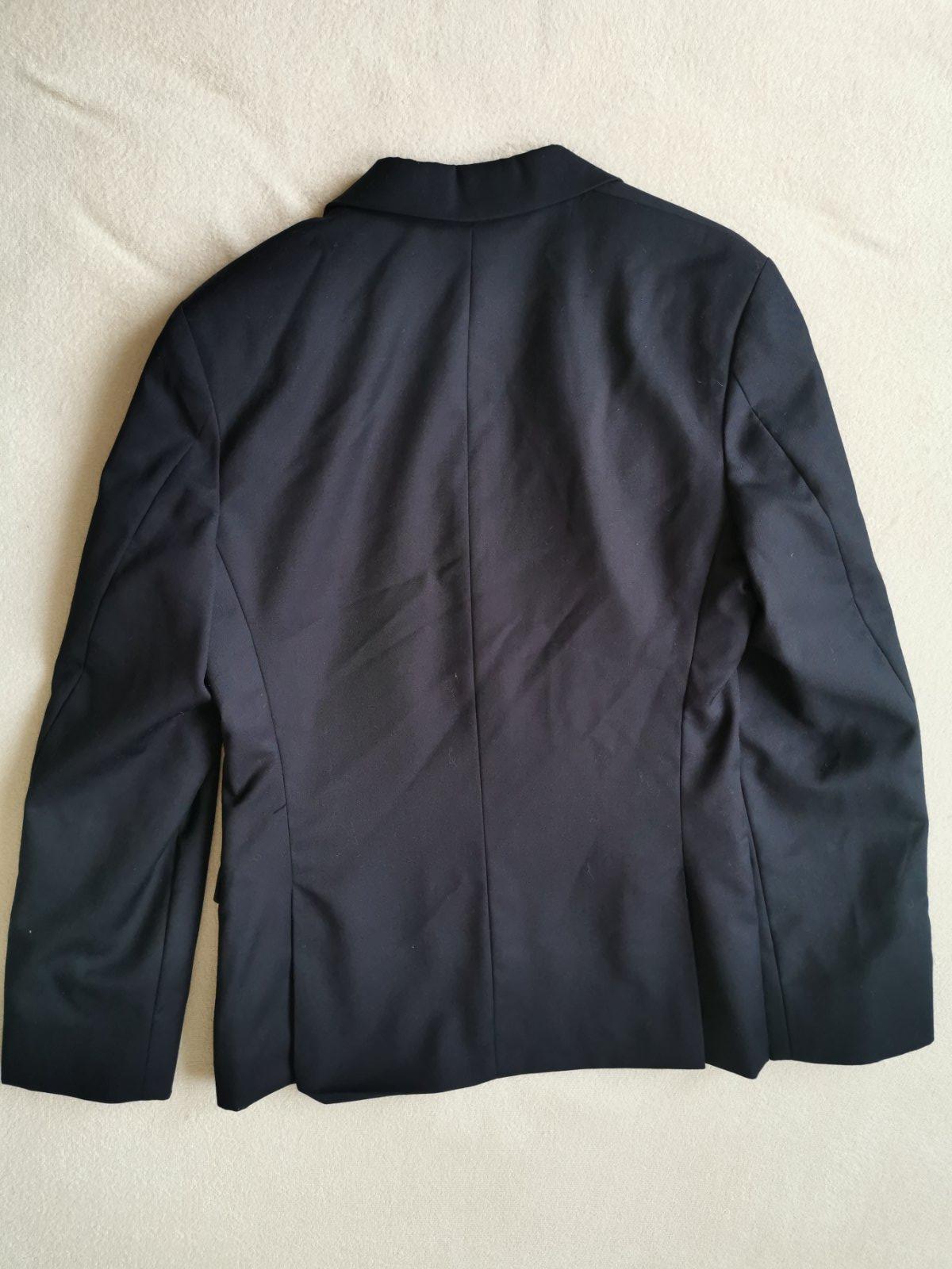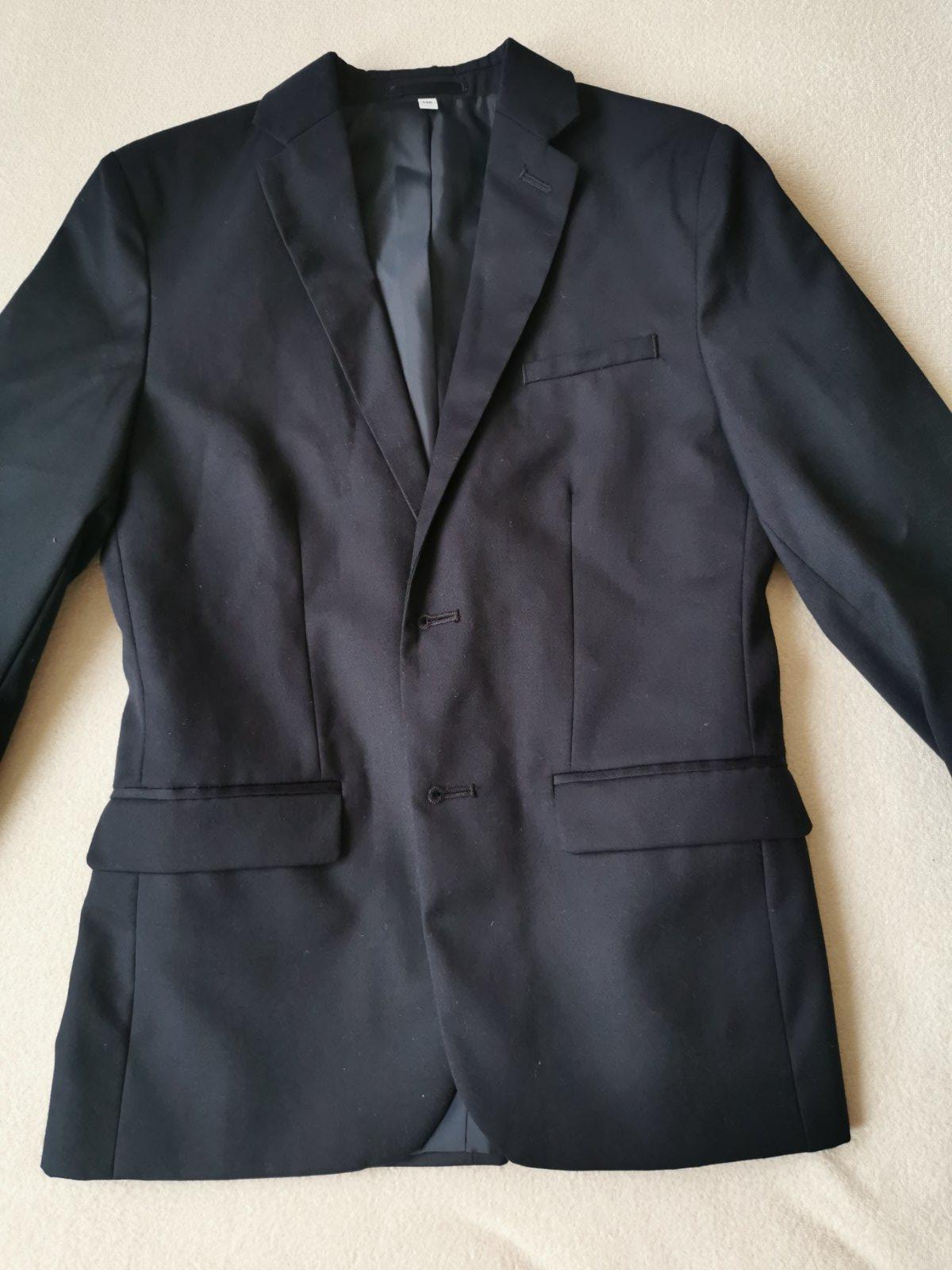 Predám sako veľ.146, dĺžka 57 cm, šírka pod pazuchami 37 cm. Sako použité v jeden deň na svadbe. Rozmery: rukáv spodná časť od podpazuchy 37cm, rukáv vrchná časť od ramena 52 cm, pás v mieste nižšieho gombíka 36(x2) cm, ramená 35 cm (od hranice rukávov). Zadný diel má "razporky" viď foto. poškodenia. Cena 20 € + poštovné resp. osobný odber