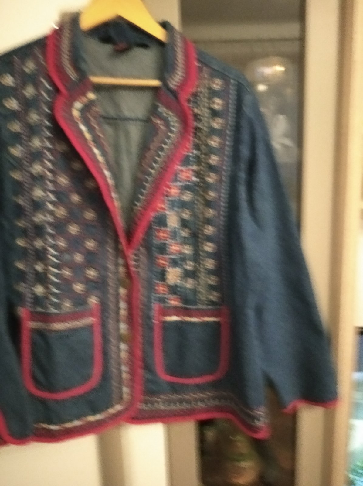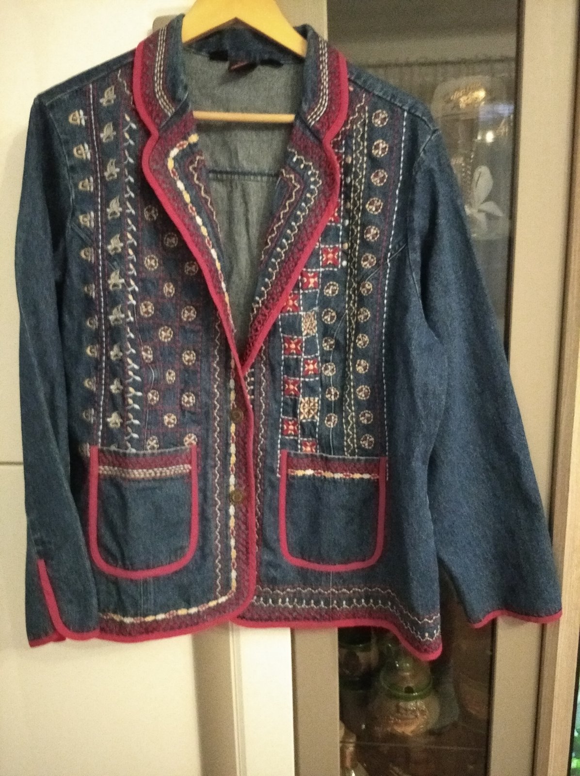 Veľmi pekne, minimálne nosené riflové vyšívané sako.
