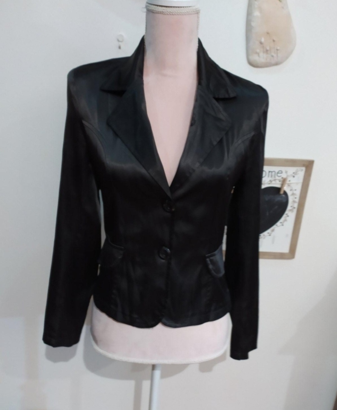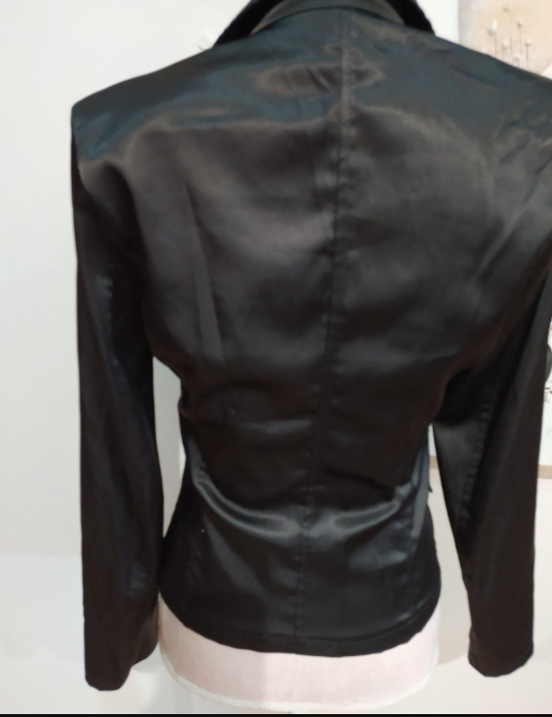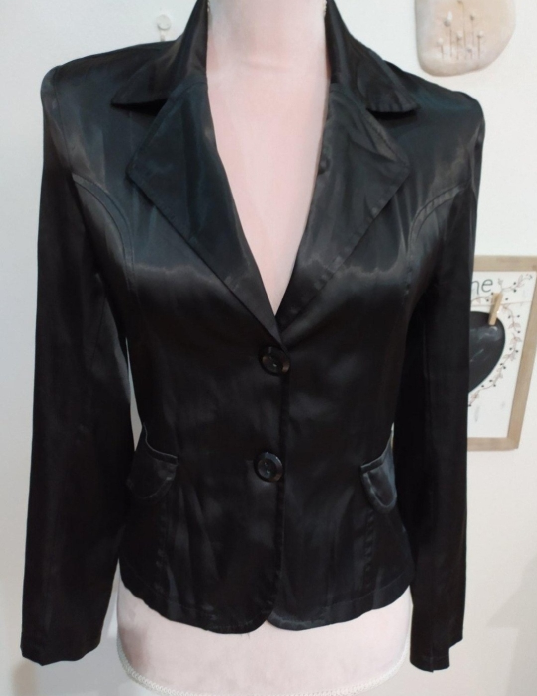 Čierny kabátik PROMOD, nie je uvedená veľkosť, ale je to skôr S, menšie M. Nosený, ale v zachovalom stave, mierne poškriabané gombíky. Zapínanie na vrchu na dva gombíky. Pekne ukáže na postave. Dĺž...