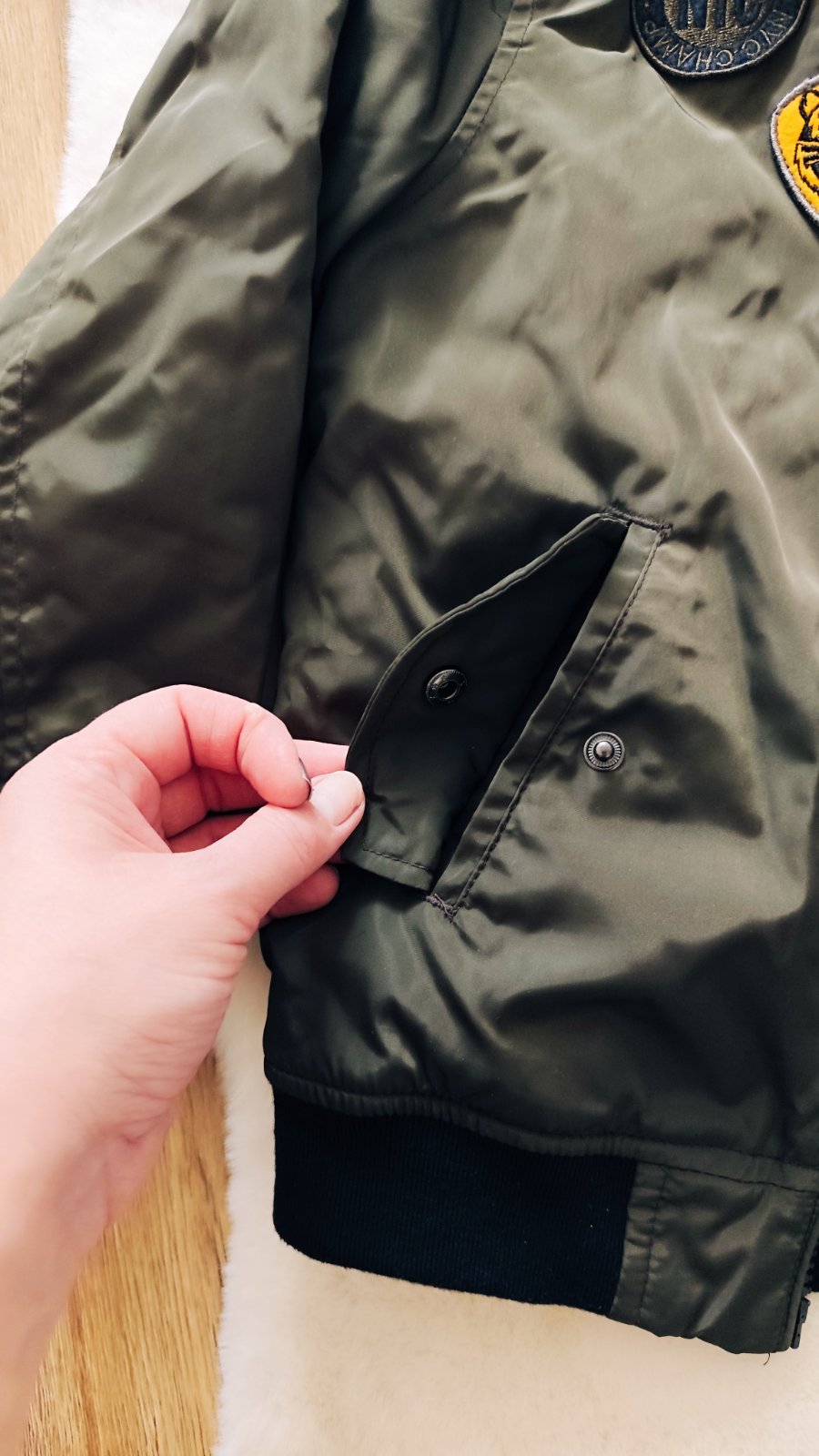 Spodný patent bundy je na gumičku, pevný a nerozťahaný
