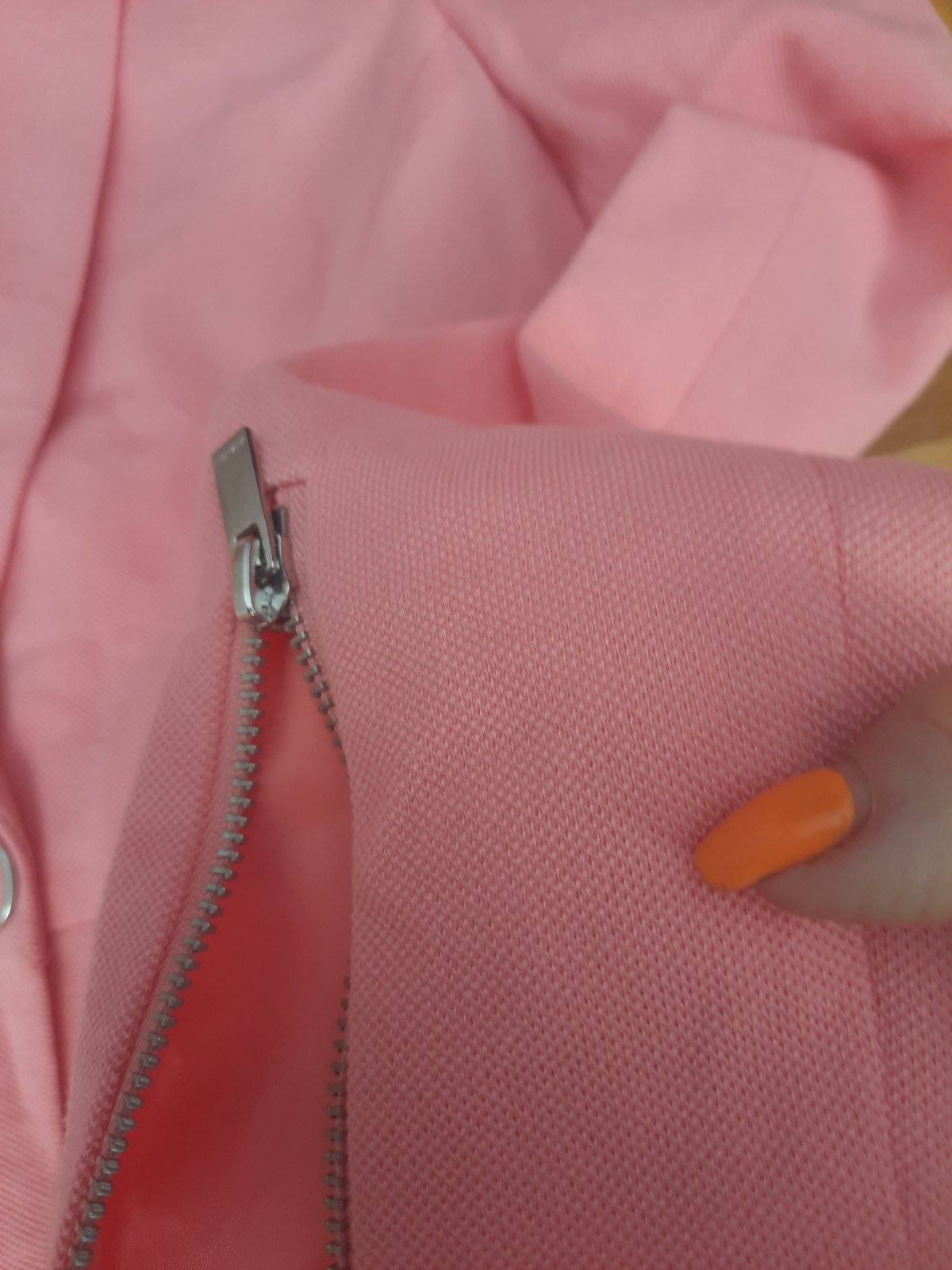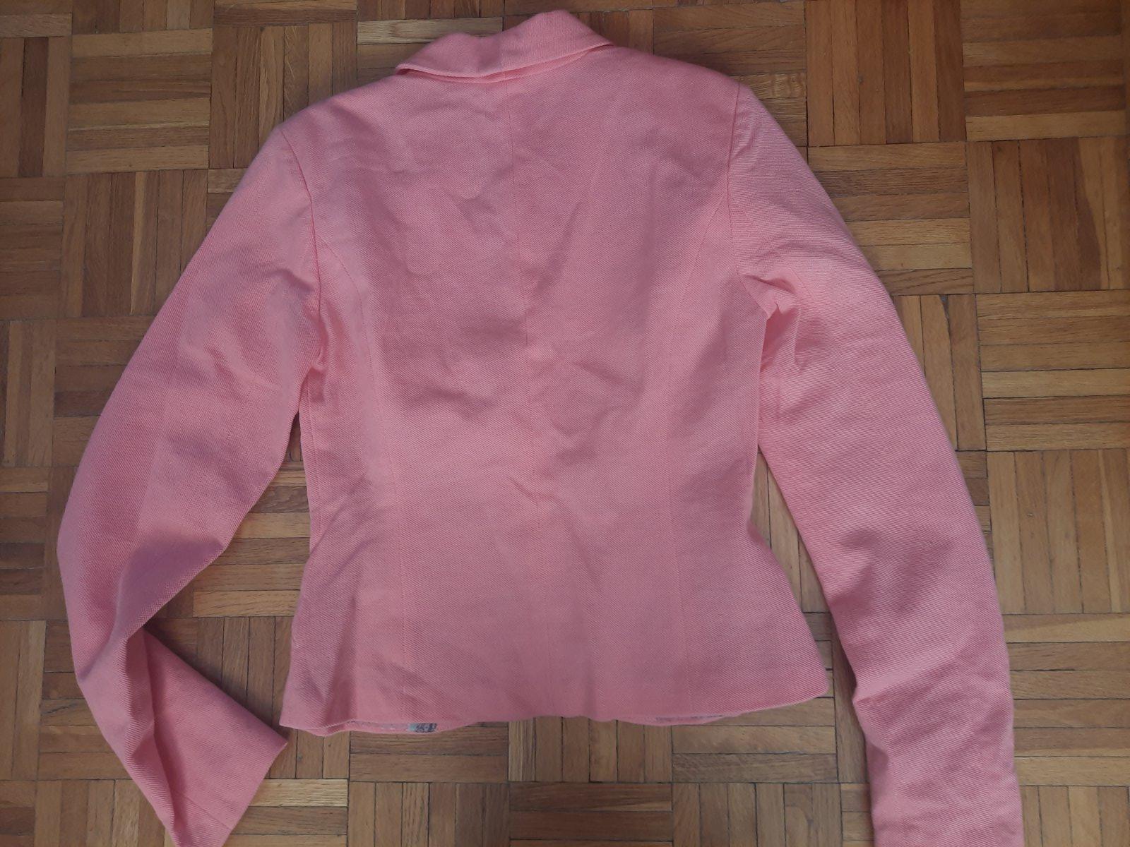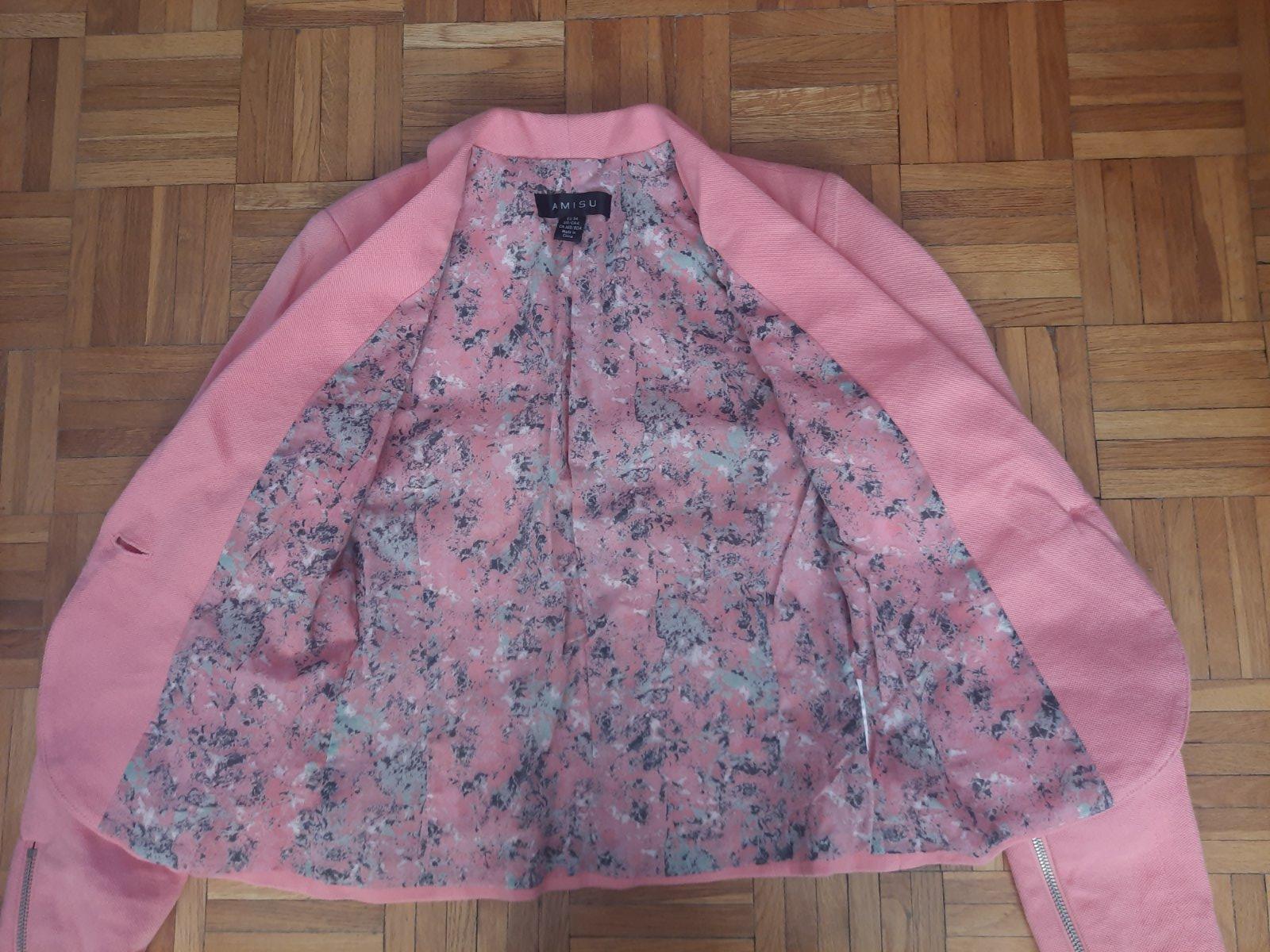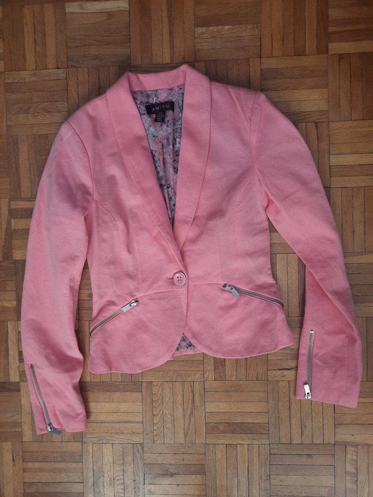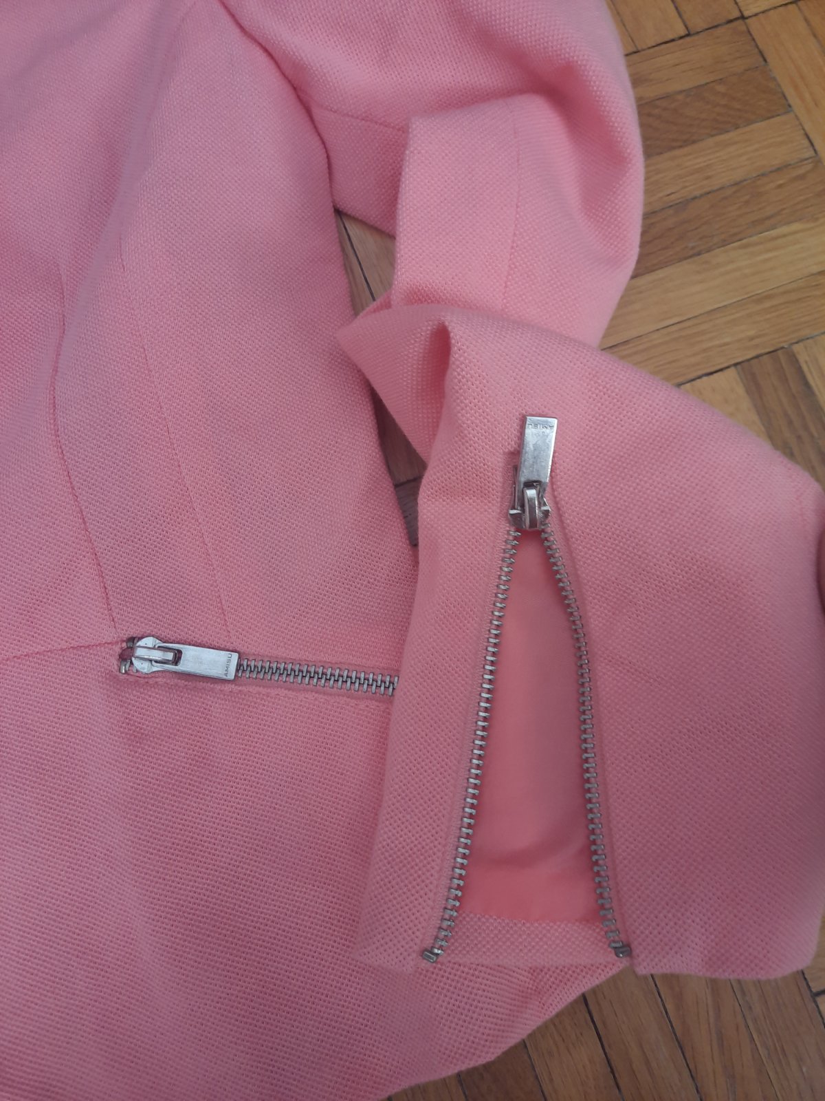 Krásne ružové sako, podšité s farebnou látkou. Zapínanie je na 1 gombík. Vpredu je vačok na zips. Na rukáve je tiež zips - ako ozdoba. Kľudne sa dá obliecť aj v lete na šaty, je to také prechodné sako.