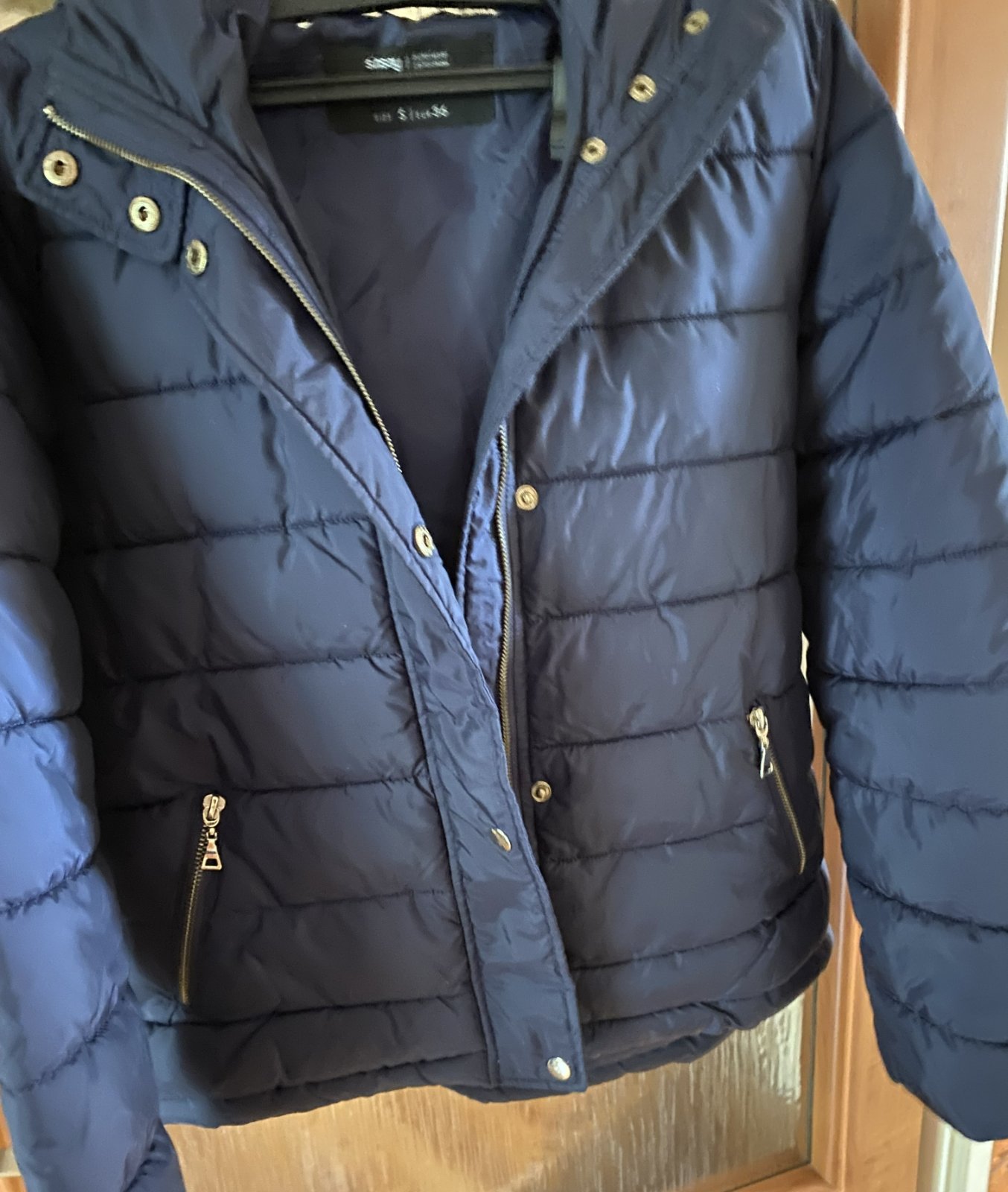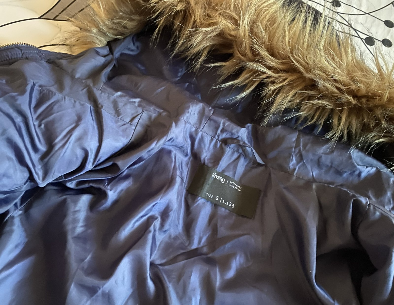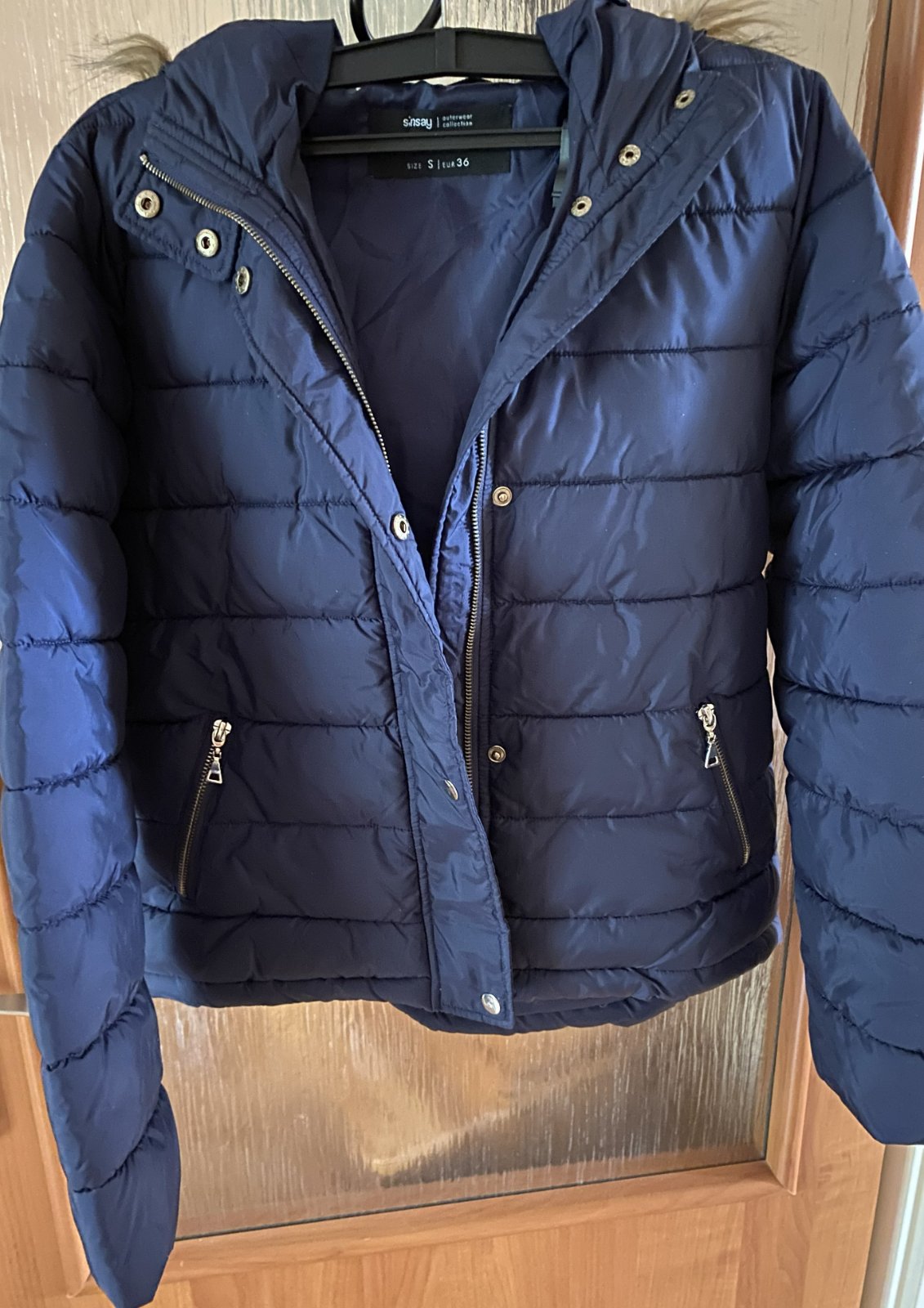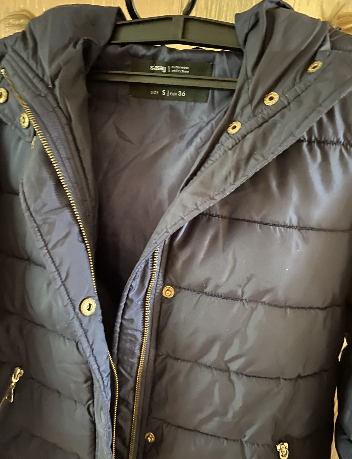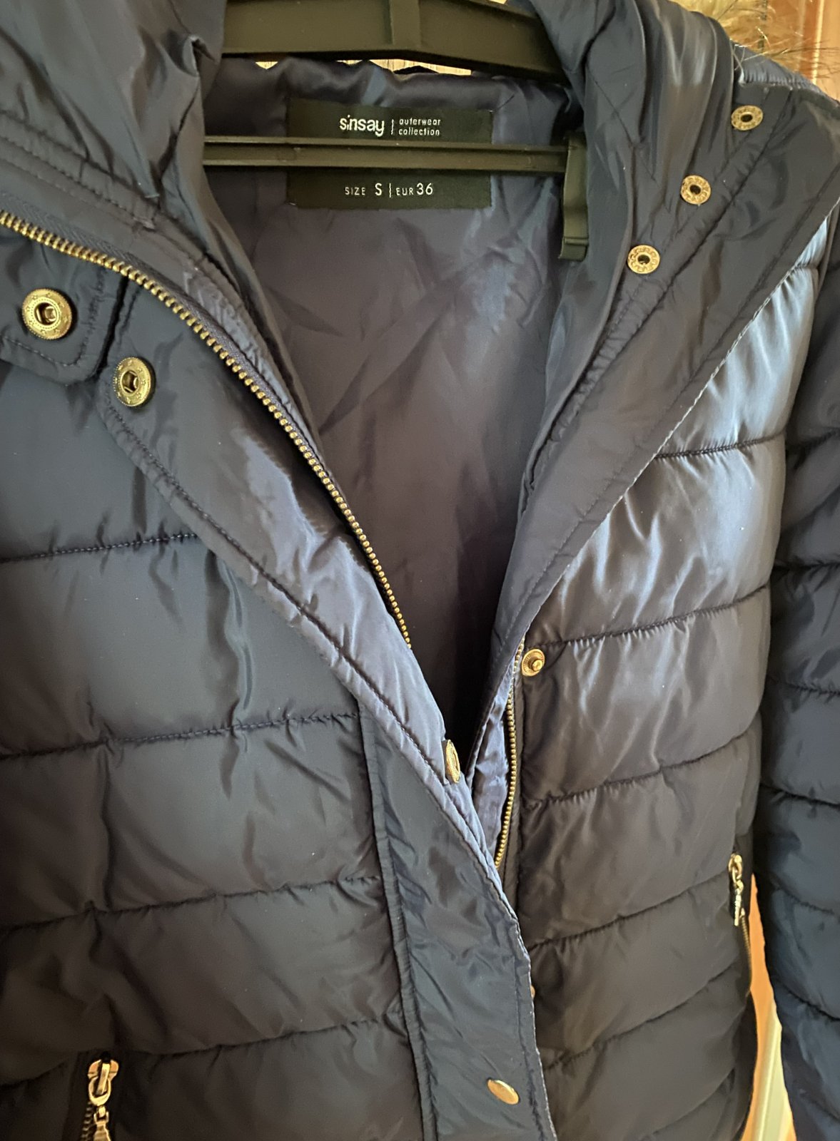 Prešívaná bunda s kapuckou Sinsey v. S - 36, na kapucke umelá kožušinka, pekne prepracovaná, kopa pekných funkčných detailov ( prešívanie, zipsy, cvoky) - nafotené - 3 vrstvy (vonkajšia, vnútorné zateplenie, vnútorná), pekná tmavomodrá farba - niektoré foto osvietené, raz oblečená, v top stave. Miery: dĺžka od krku dolu vpredu: 57cm - vzadu cez stred + 6cm, šírka: 50cmxx2, rukáv od ramena: 59cm + 10cm plece ku kapucke.