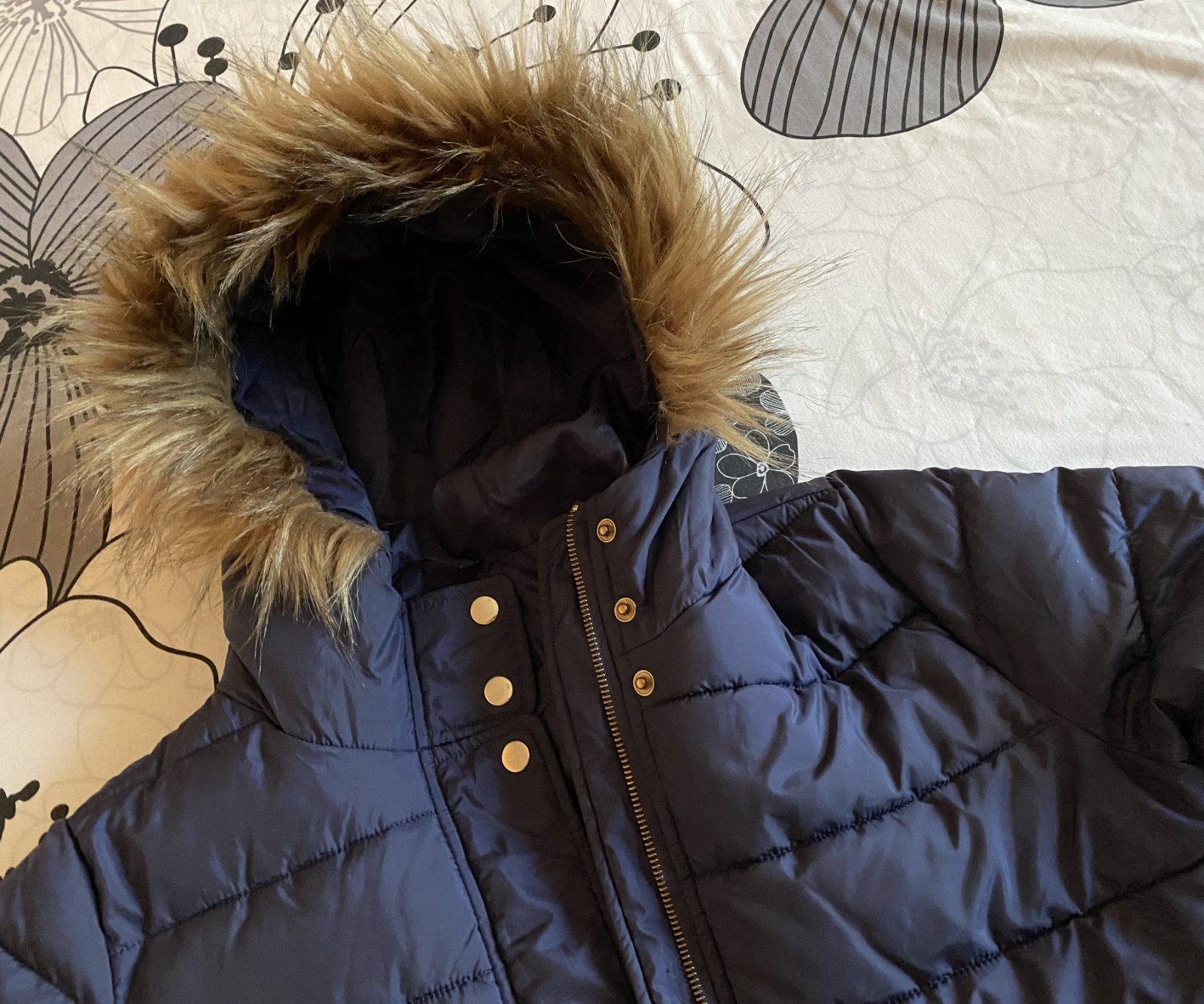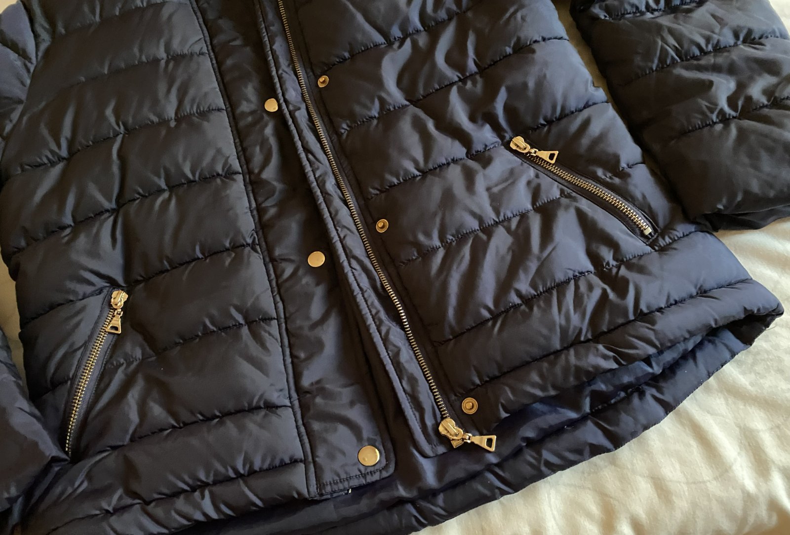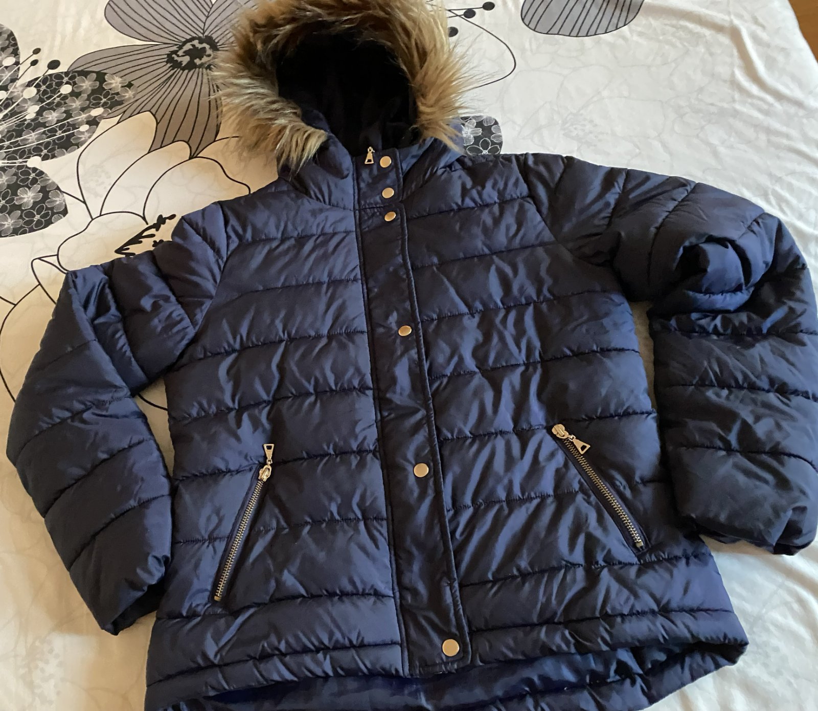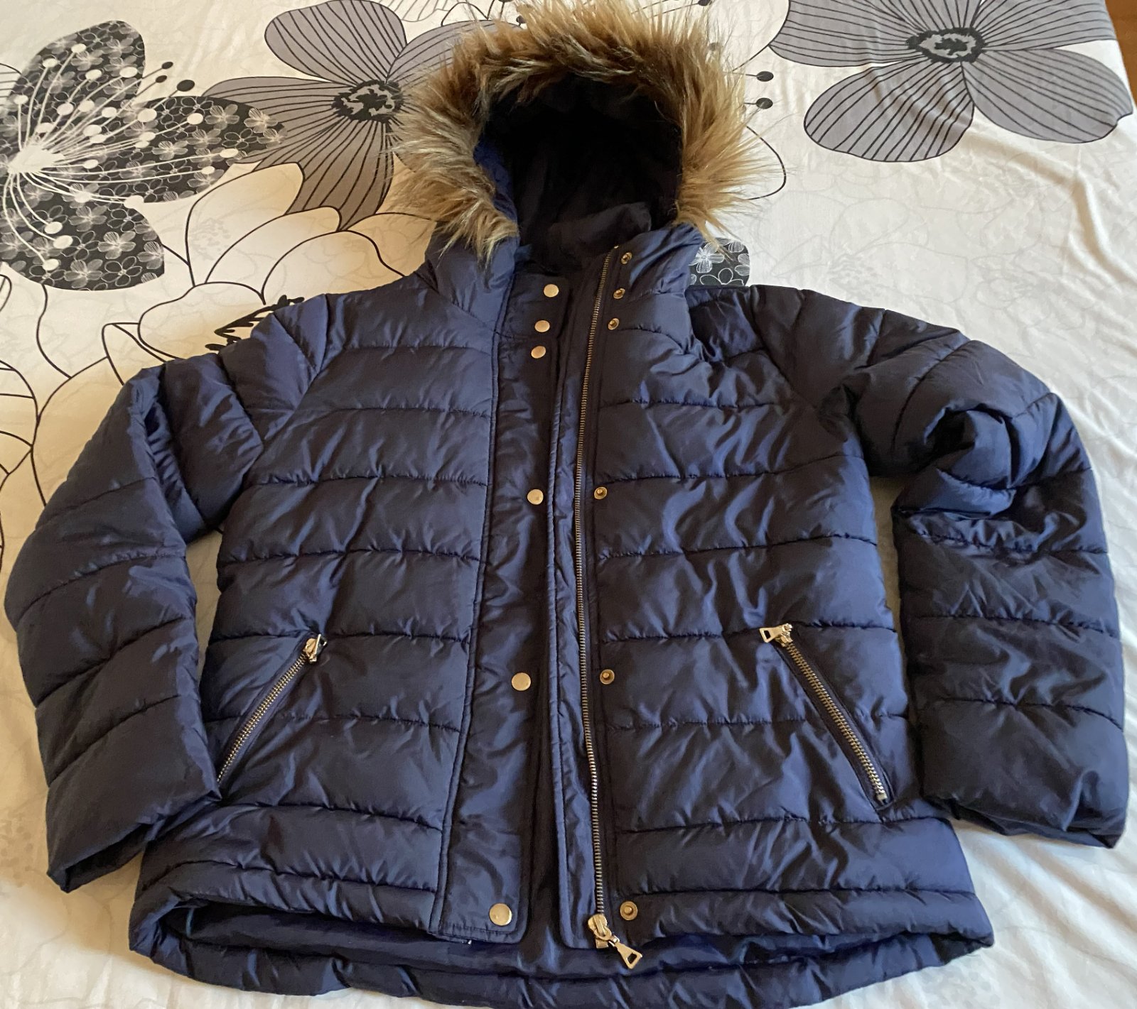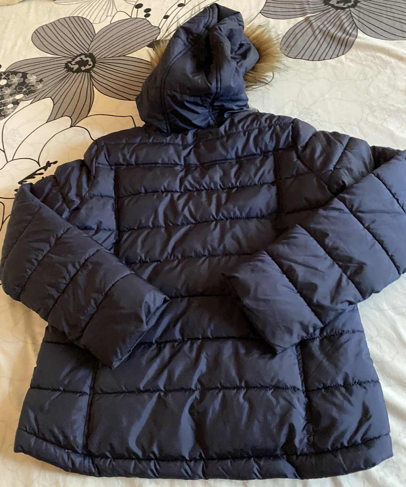 Prešívaná bunda s kapuckou Sinsey v. S - 36, na kapucke umelá kožušinka, pekne prepracovaná, kopa pekných funkčných detailov ( prešívanie, zipsy, cvoky) - nafotené - 3 vrstvy (vonkajšia, vnútorné zateplenie, vnútorná), pekná tmavomodrá farba - niektoré foto osvietené, raz oblečená, v top stave. Miery: dĺžka od krku dolu vpredu: 57cm - vzadu cez stred + 6cm, šírka: 50cmxx2, rukáv od ramena: 59cm + 10cm plece ku kapucke.