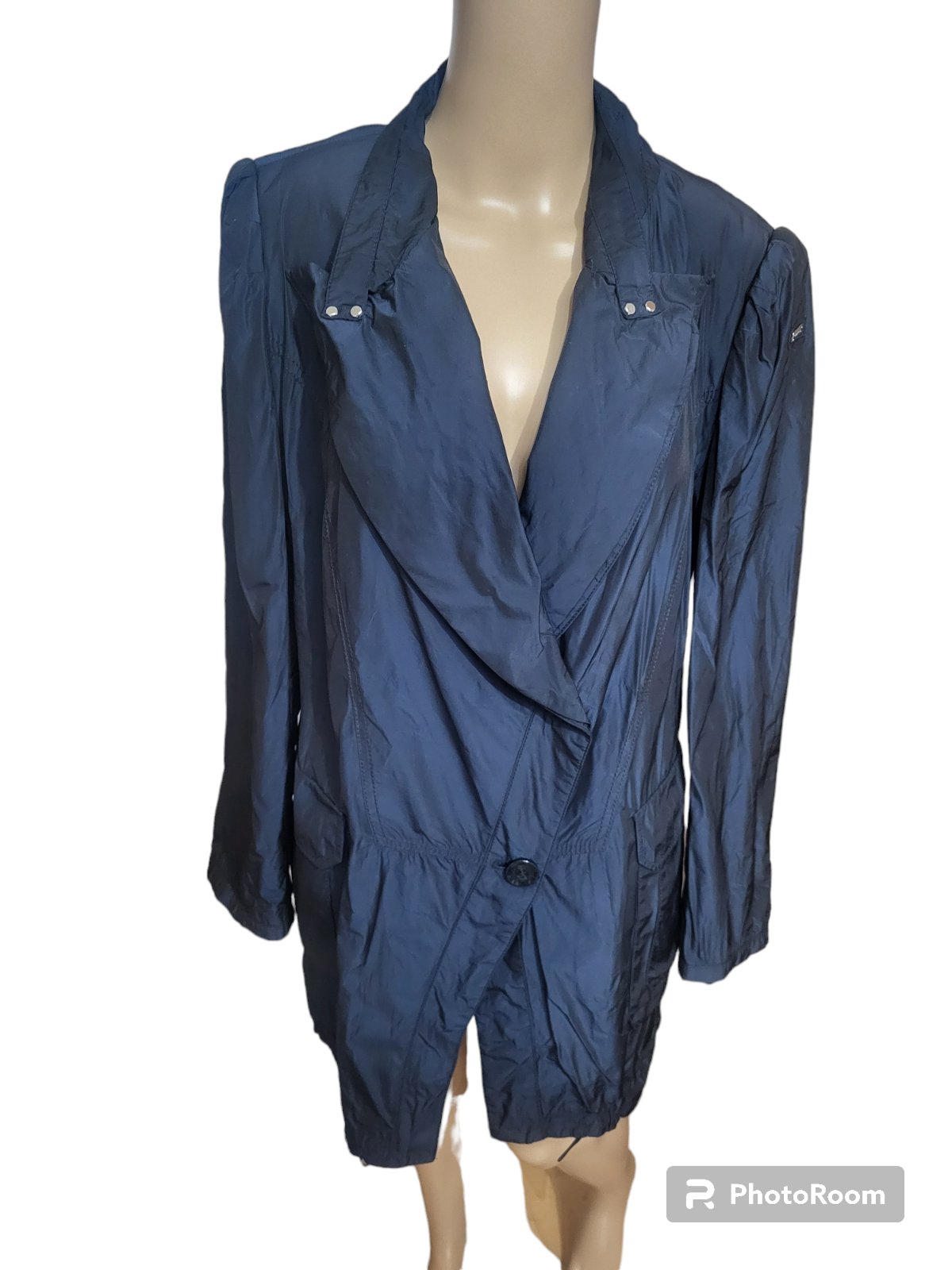 Dámska bundička na prechodné obdobie. Zapínanie je vpredu na gombíky. Vzadu je opasok s prackou na regulovanie obvodu. Dĺžka je 75cm,obvod hrudníka je 112cm a obvod pása je 108cm. Dĺžka rukáva od krku je 70cm