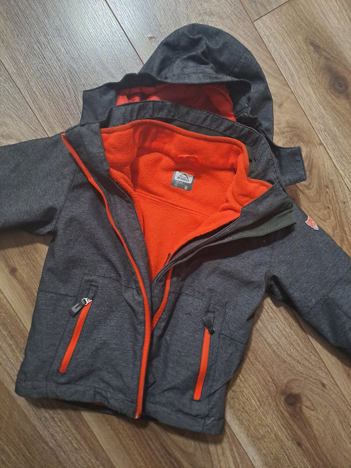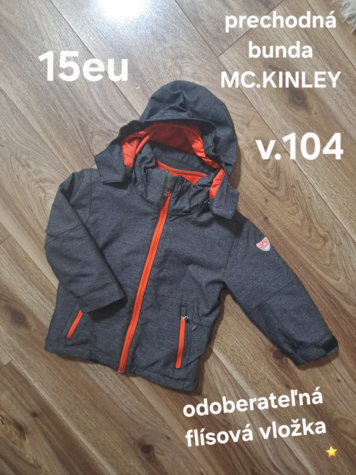 Zelená prechodná softshellová bunda. Značka McKinley,veľkosť 104, reflexné prvky trocha ošuchane, zmolky na okraji kapucne, rukavoch a spodku bundy.
