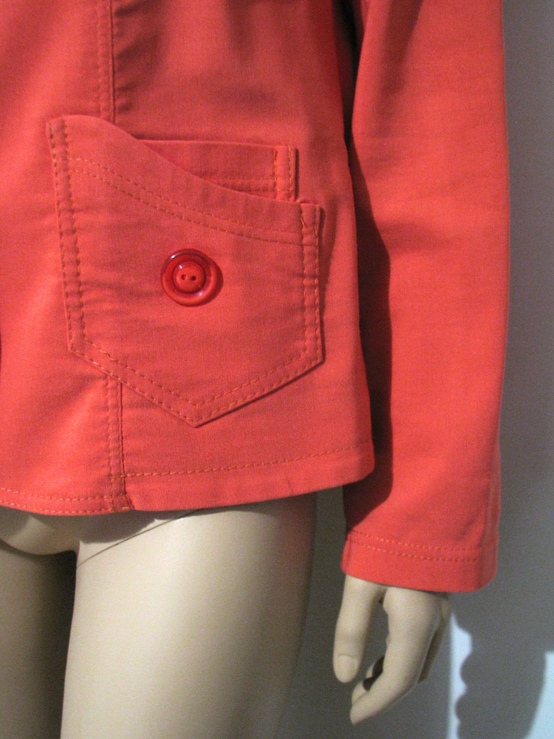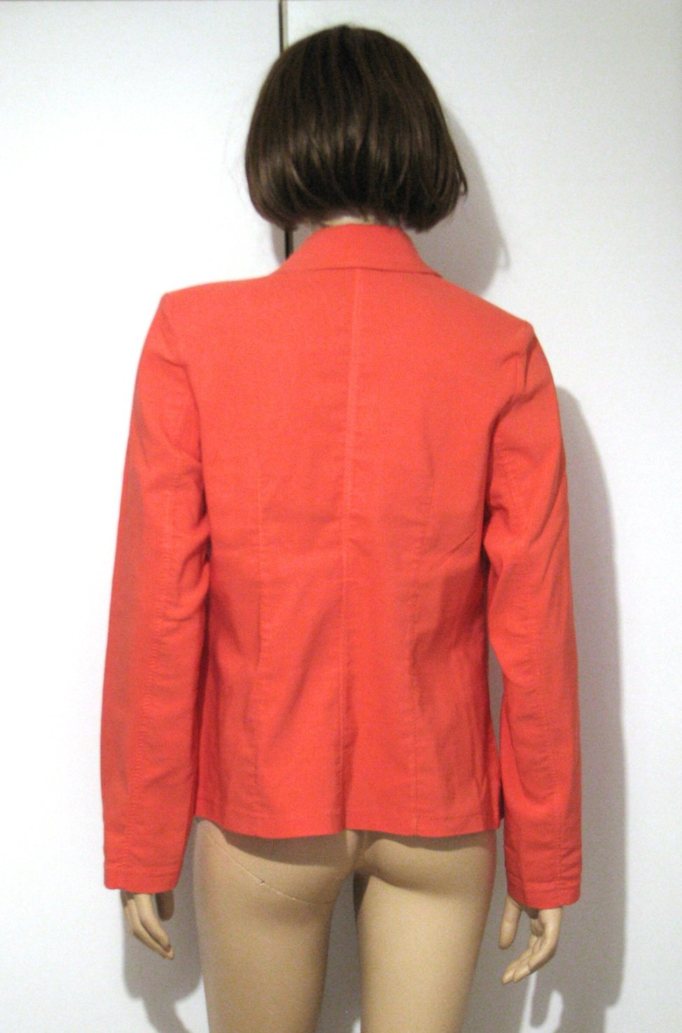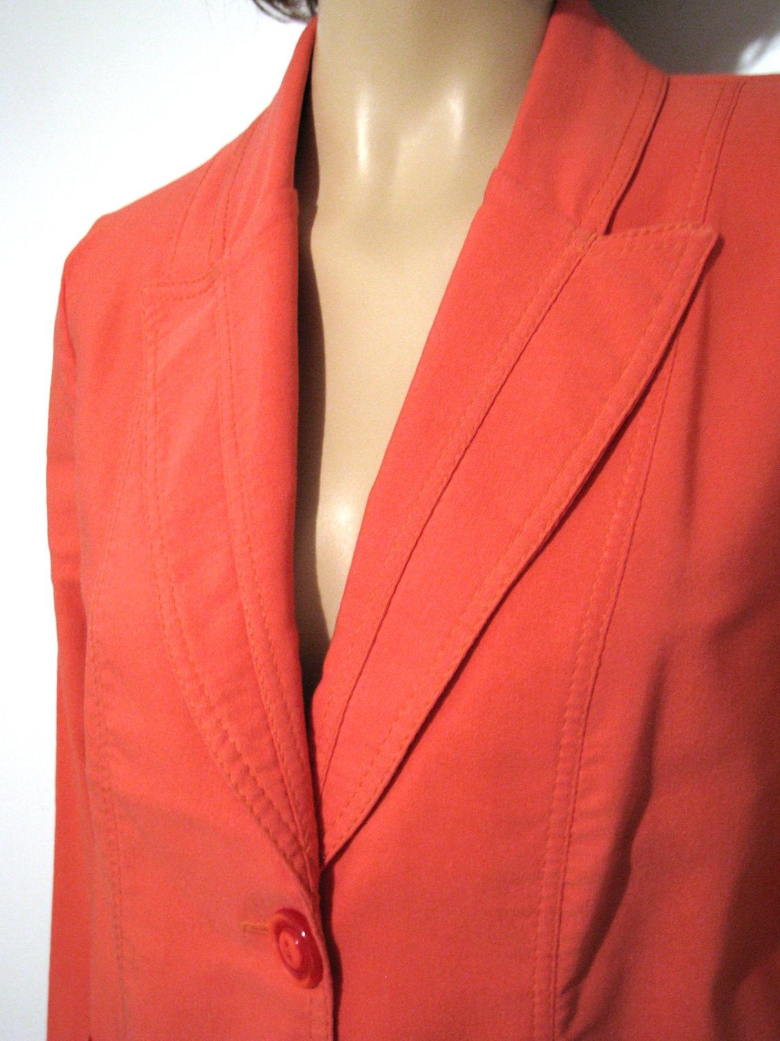Krásne sako lososovej farby so zaujímavým strihom a prepracovanými detailmi. Farba saka je v realite viac do ružova, nezachytila som to poriadne foťákom. Vhodné na jar/jeseň, no i na chladnejšie letné rána a večery :) Výborne zachovalé bez poškodení. Veľkosť len odhadom píšem XL, v prípade záujmu premeriam. Šírka cez prsia je 54 cm, dĺžka dolu chrbtom od prišitia goliera je 61 cm. Látka je elastická.