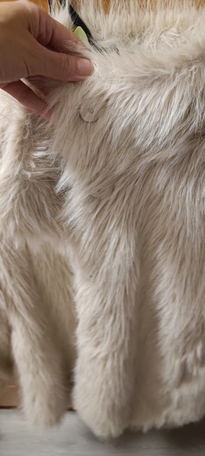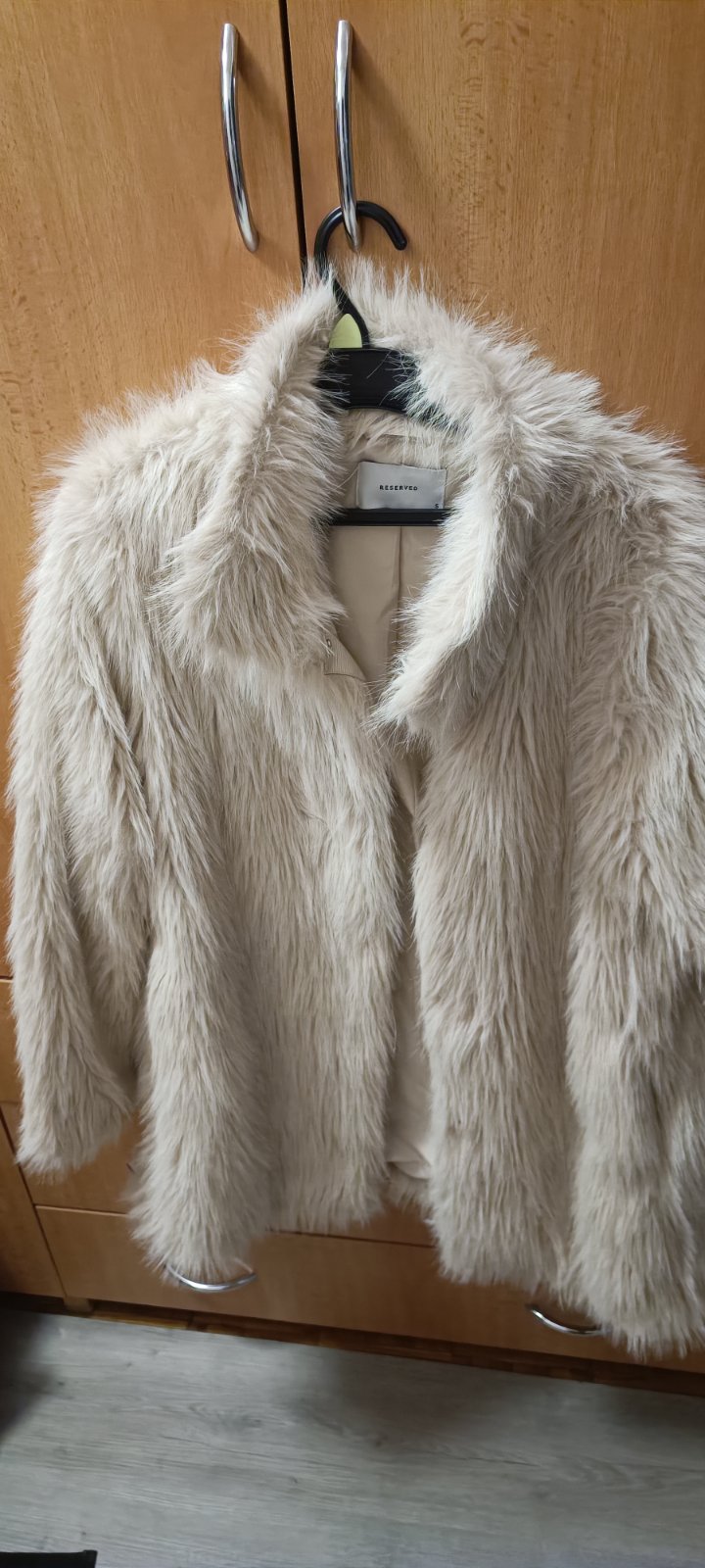 Veľmi pekný, tepľučký. Rozmery: celková dĺžka 90 cm, šírka cez prsia 53 cm, dľžka rukávu od krku 74cm.