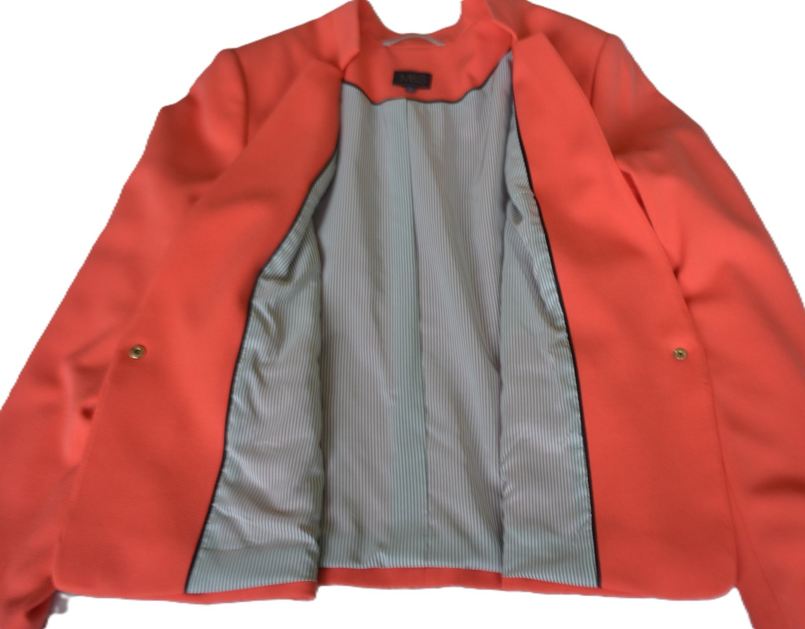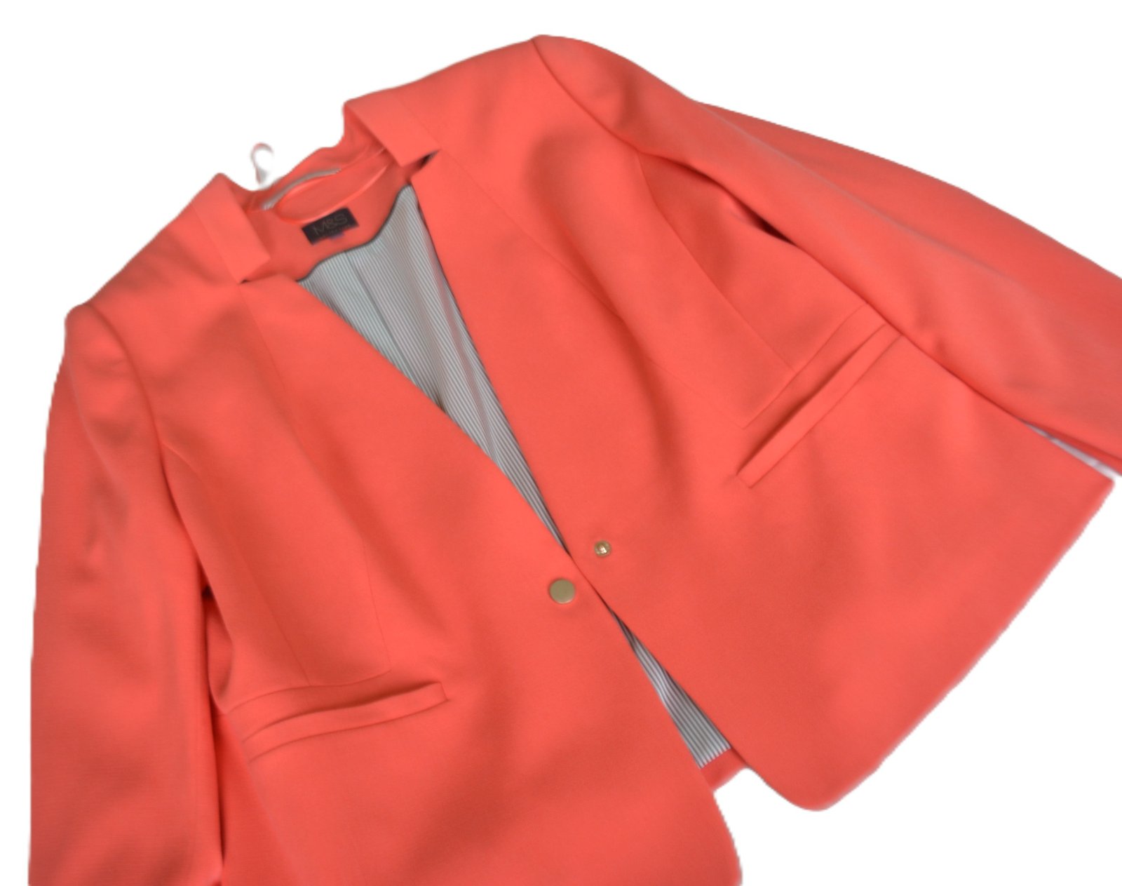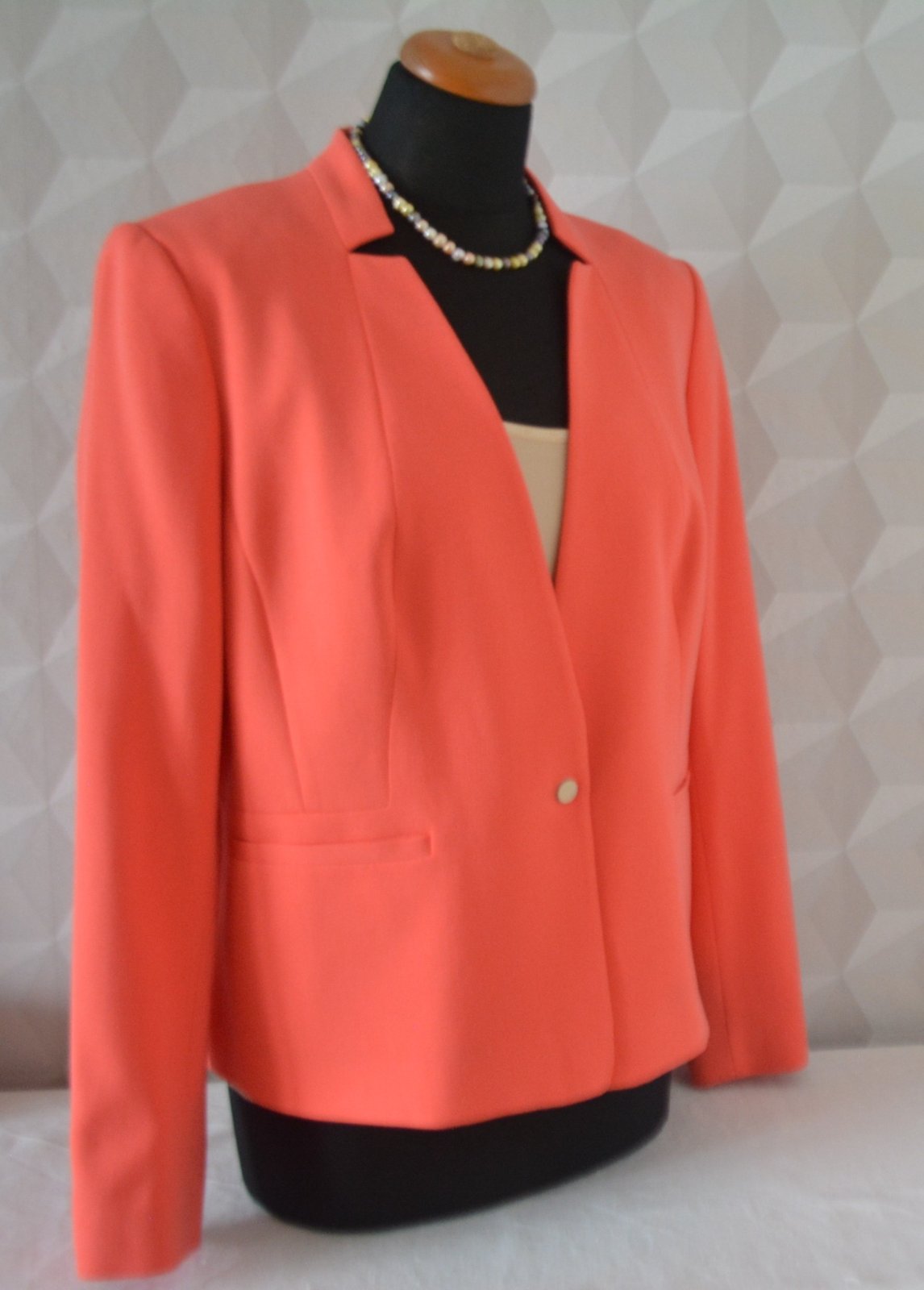 Krásne sako krásnej koralovej farby, značka Marks&Spencer, veľ. XXL - rozmery: dĺžka 59cm, pod pazuchami 2x58cm, rukáv 61/42 cm.