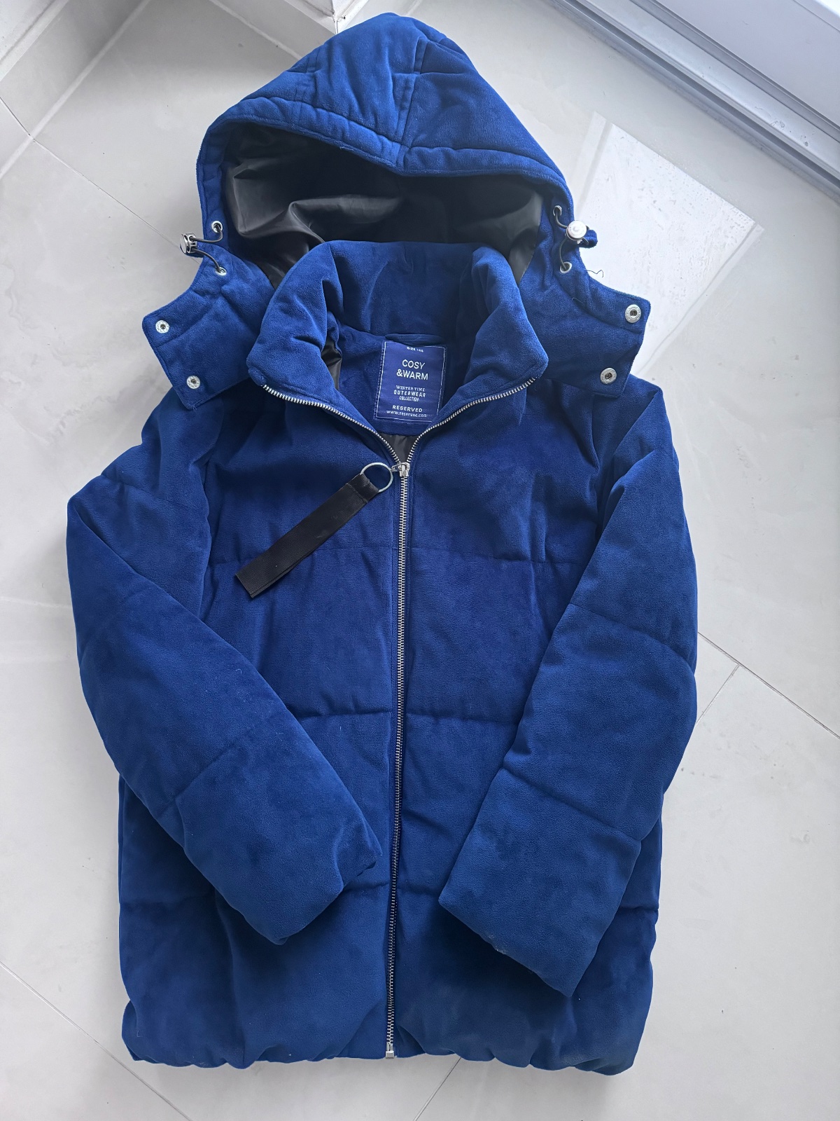 Predám bundu v super stave, párkrát vzatá, veľmi teplá. Farba je kráľovská modrá, materiál zamat.
