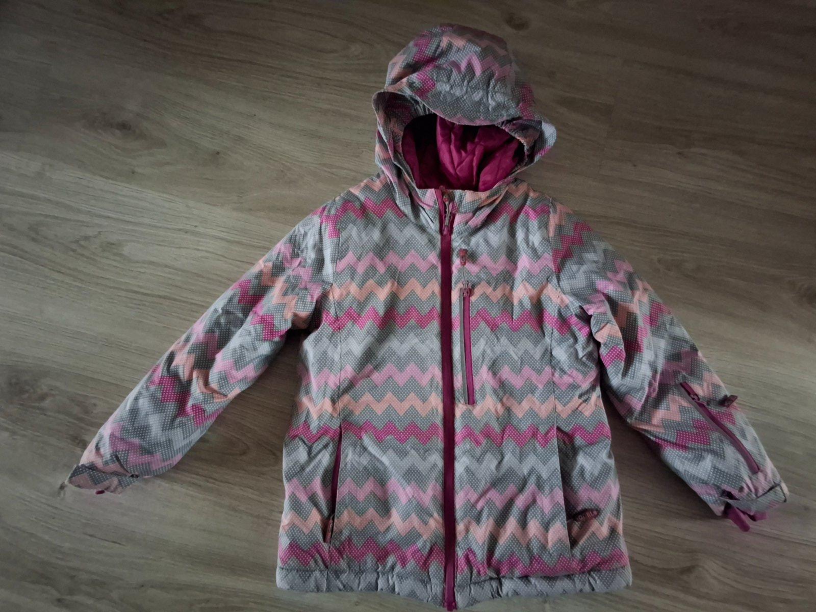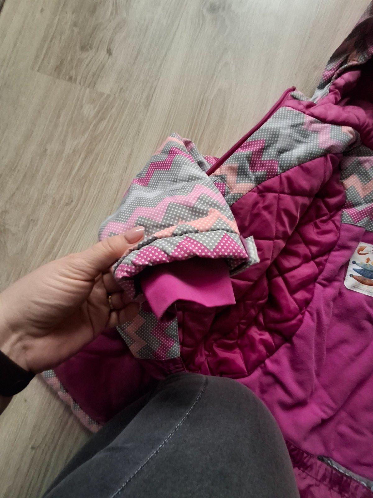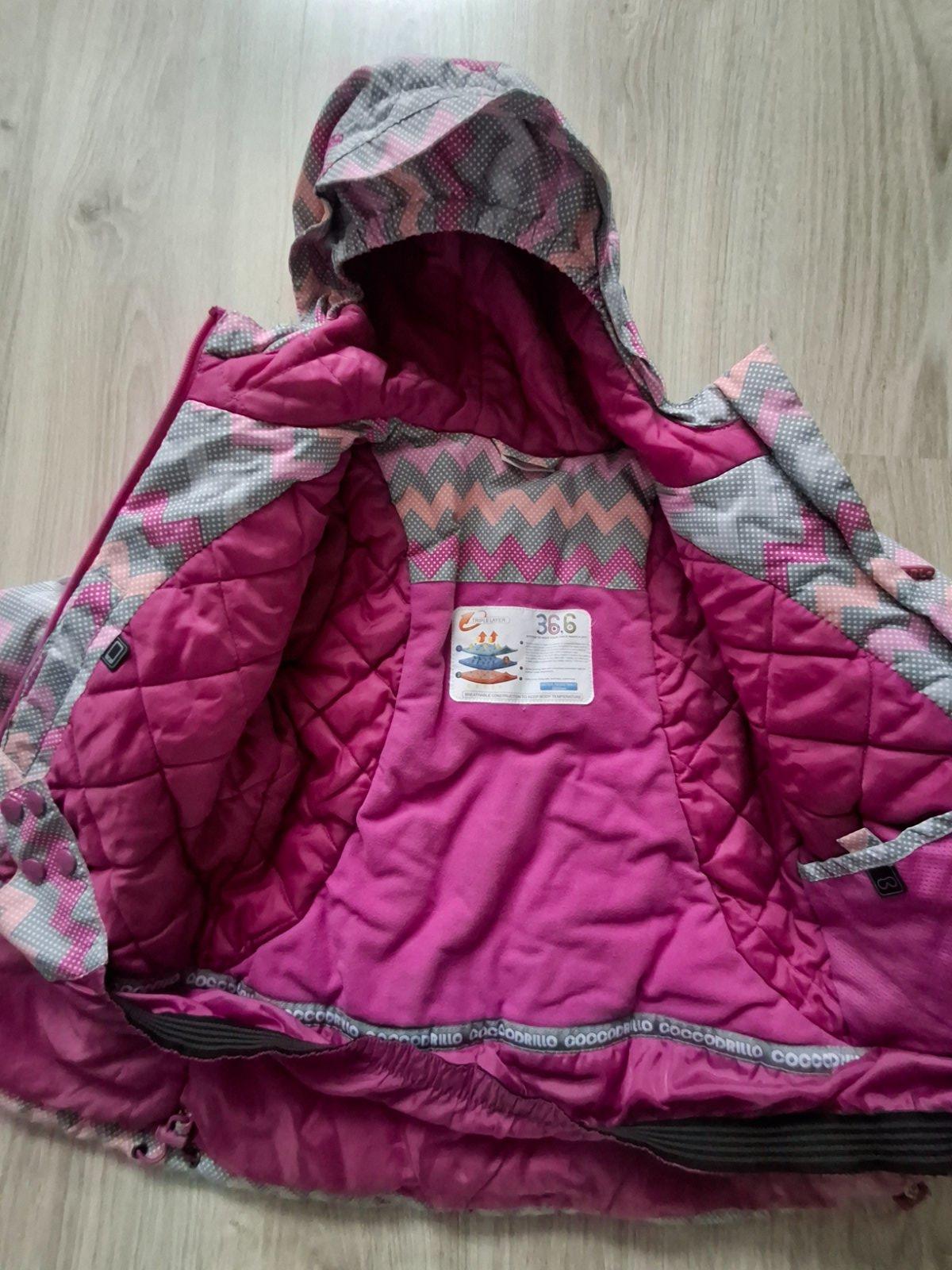 Nosena , nositelna do velkosti 128, farba ruzovo malinova, kozusina na kapucni sa da odopnut, na rukavoch znamky nosenia.