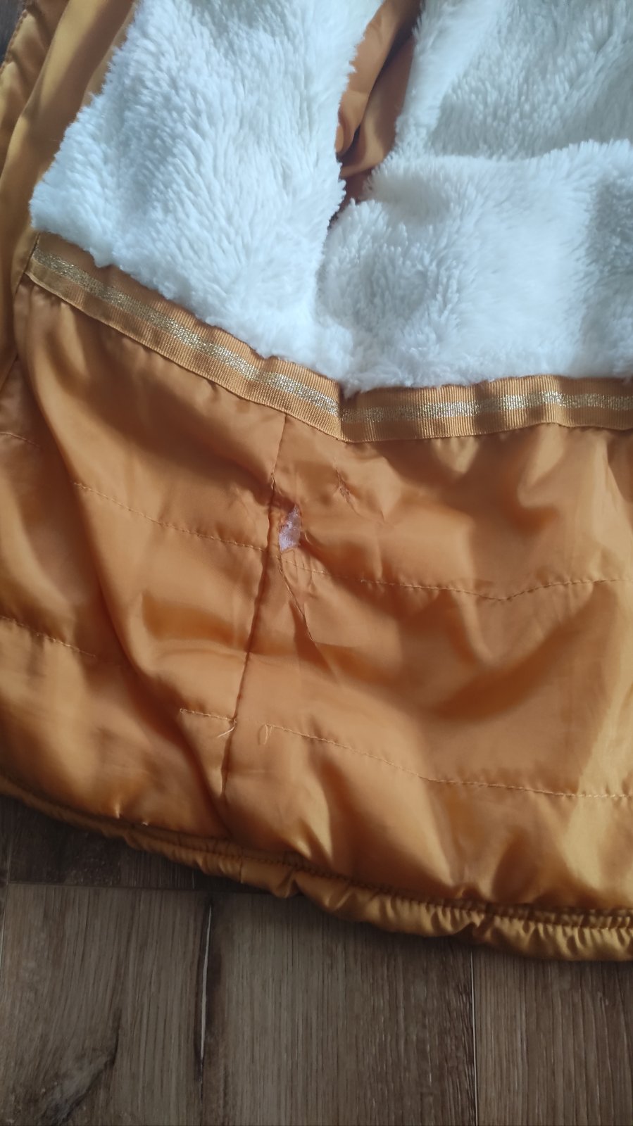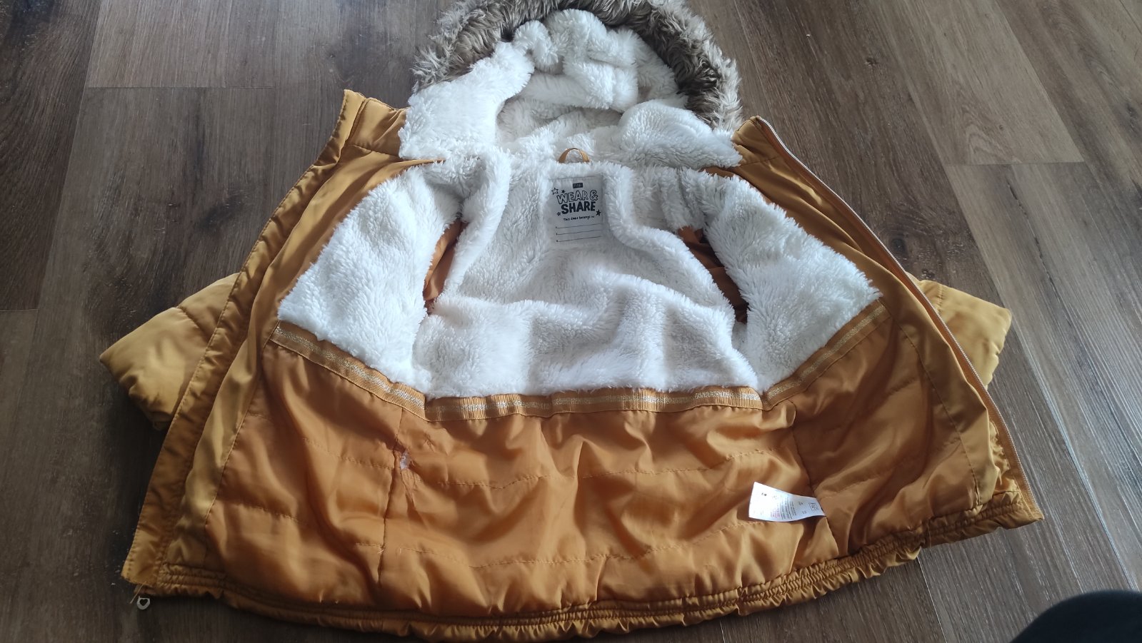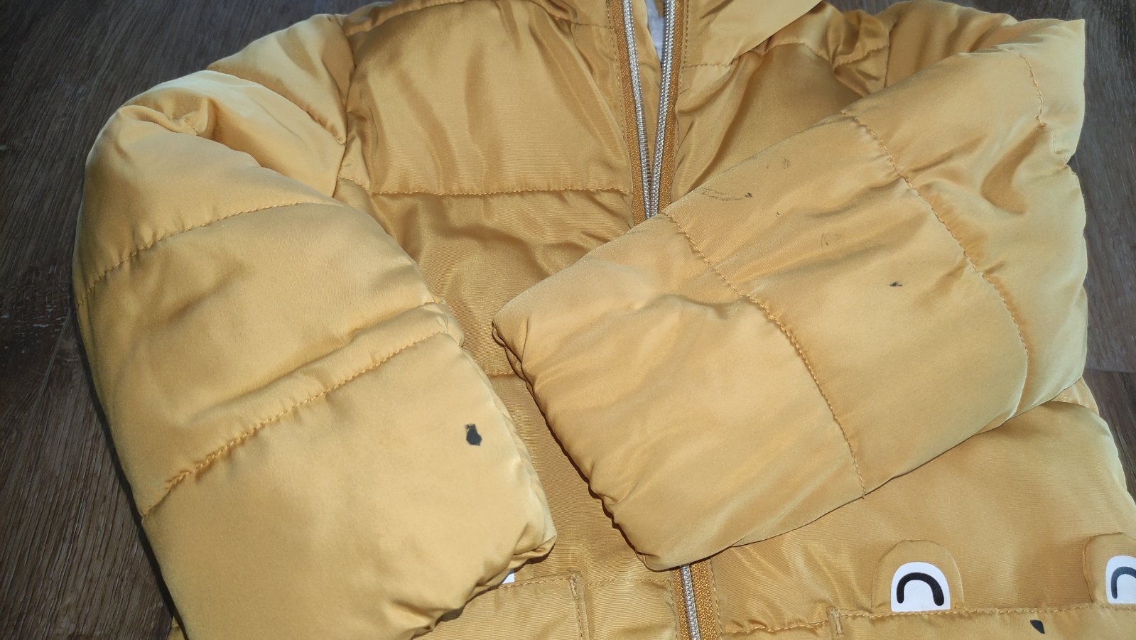 Nosena casto. Rukavy pri zapastiach mierne vyblednute,vid foto. Na vnutornej visacke 1 cast odstrihnuta-dcera podpisana ked nosila bundu do skolky. Maly flak na prednom vrecku (foto). Pisana velko...