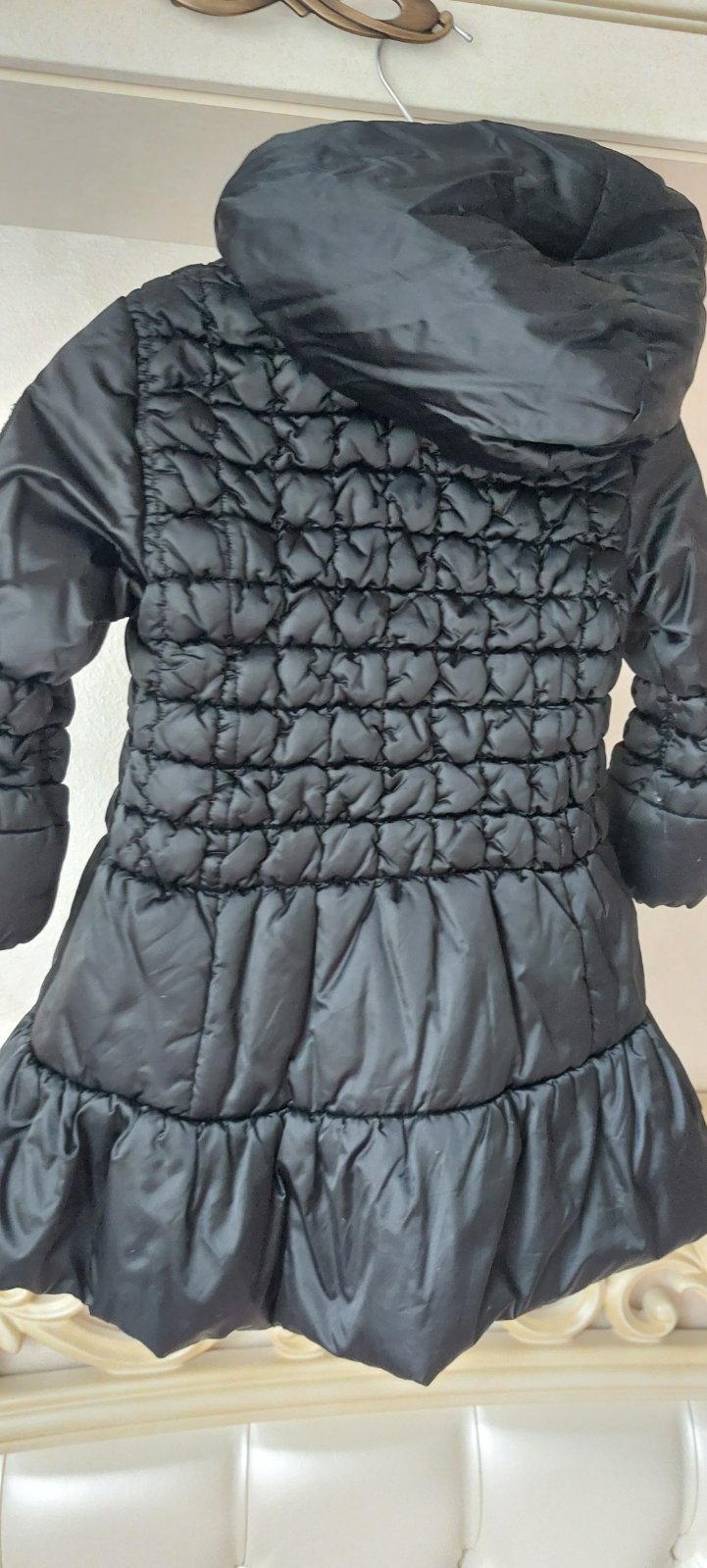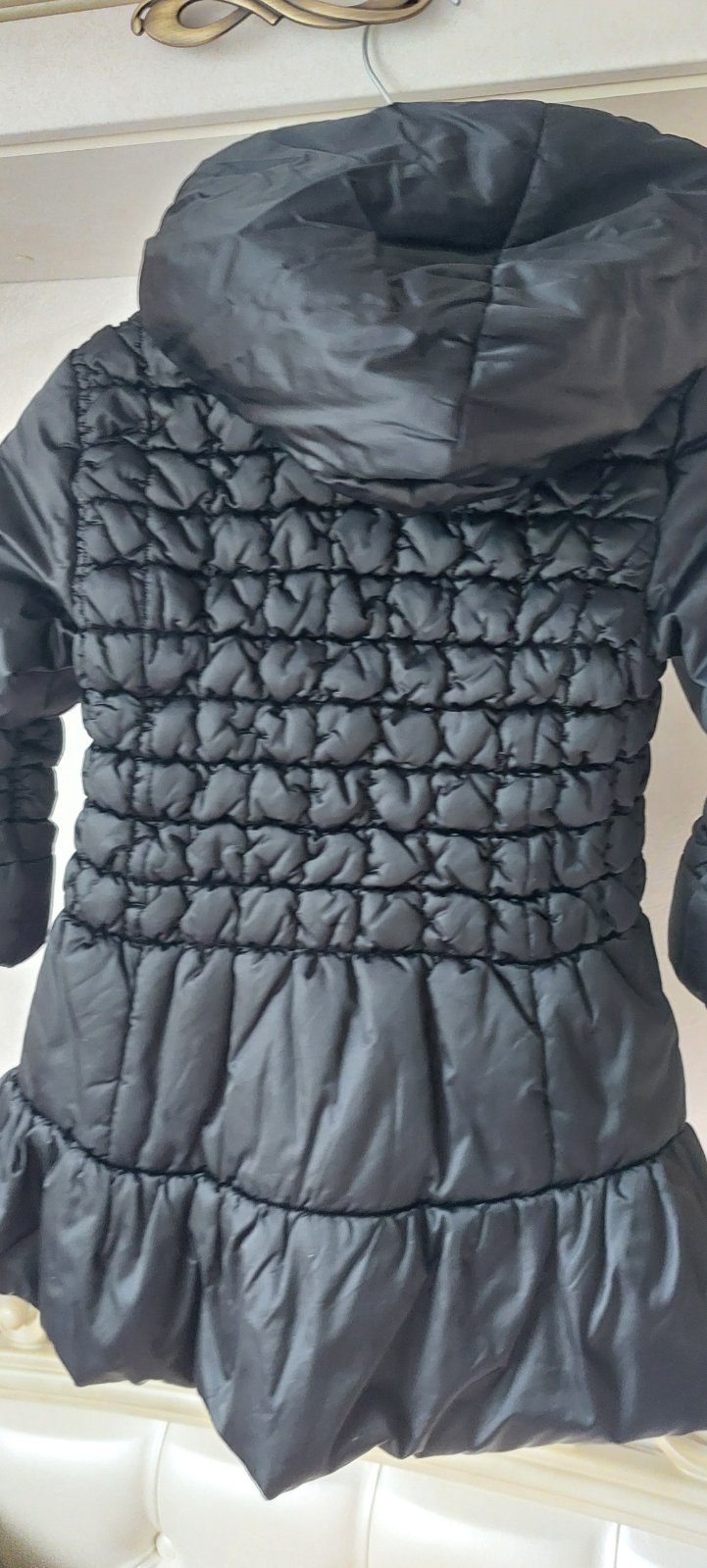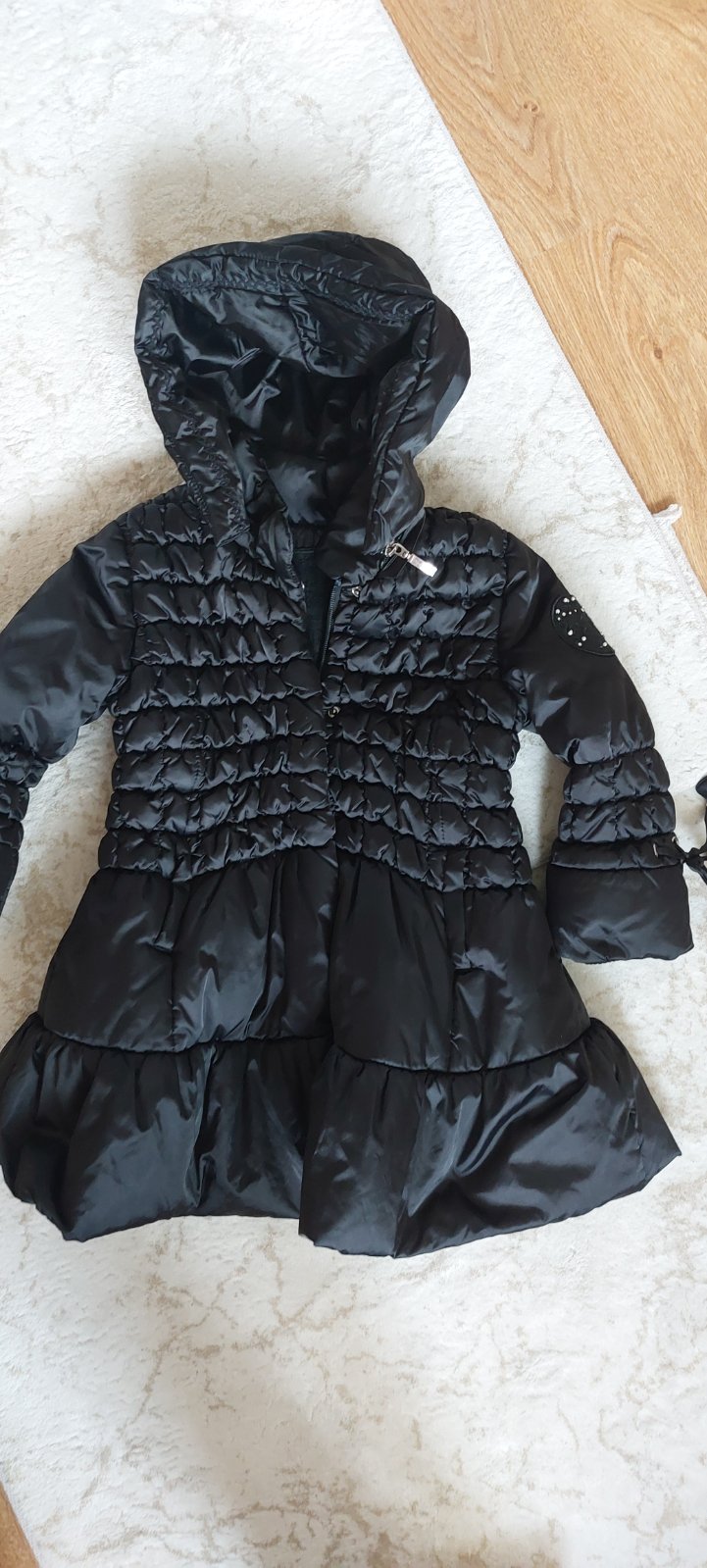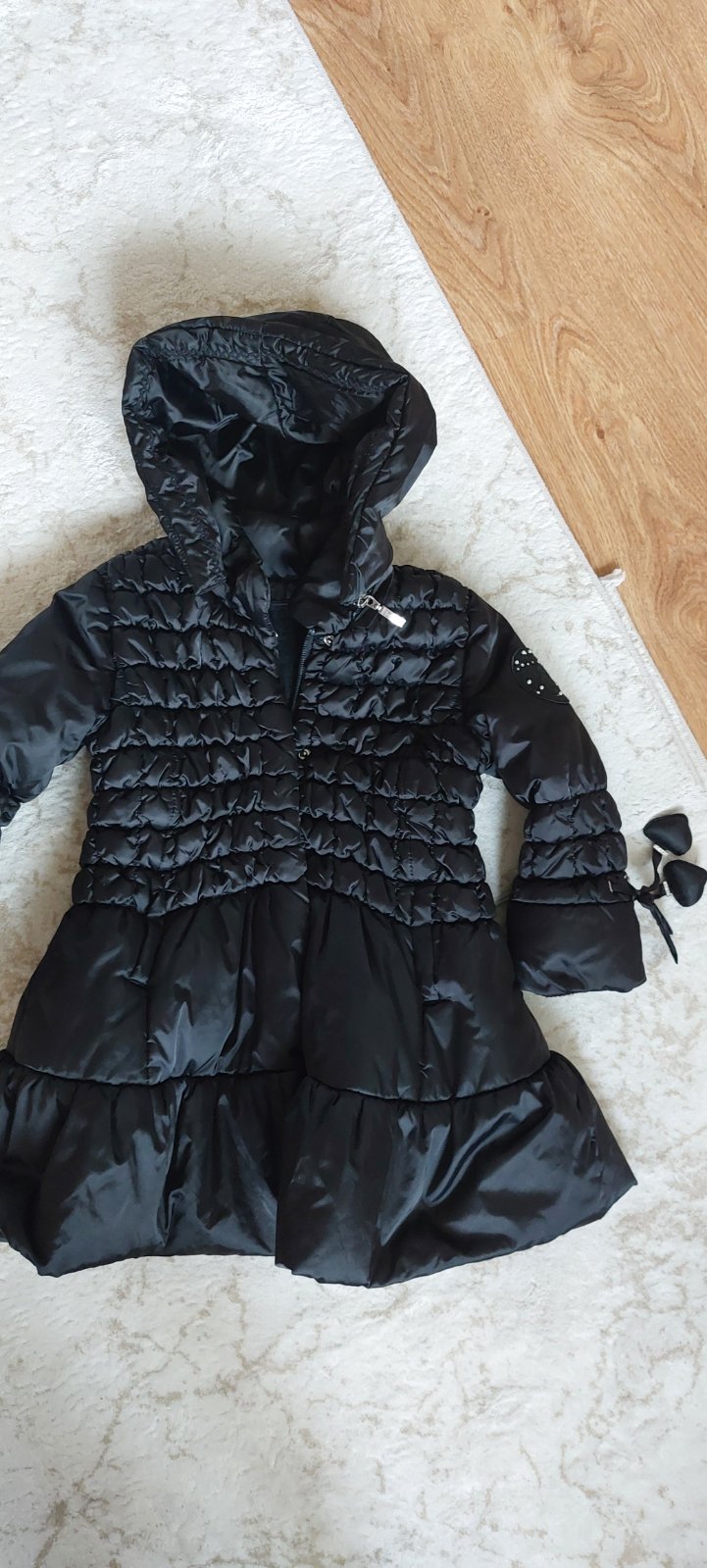 Dá sa nosiť tak okolo veľkosti 104/110,ale tým ze je predlzena vydrží aj dlhšie závisí od dieťatka lebo naša bola drobnejsia. Je v 100% stave, zdobená kamienkami. Kapucňa je odnímateľná.