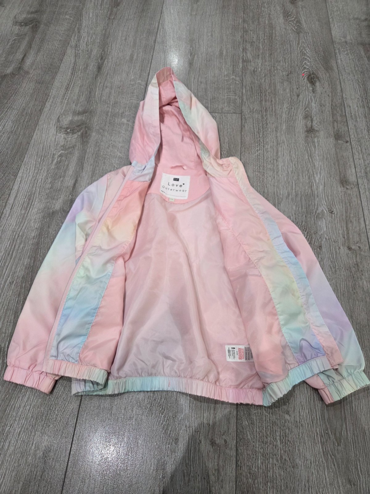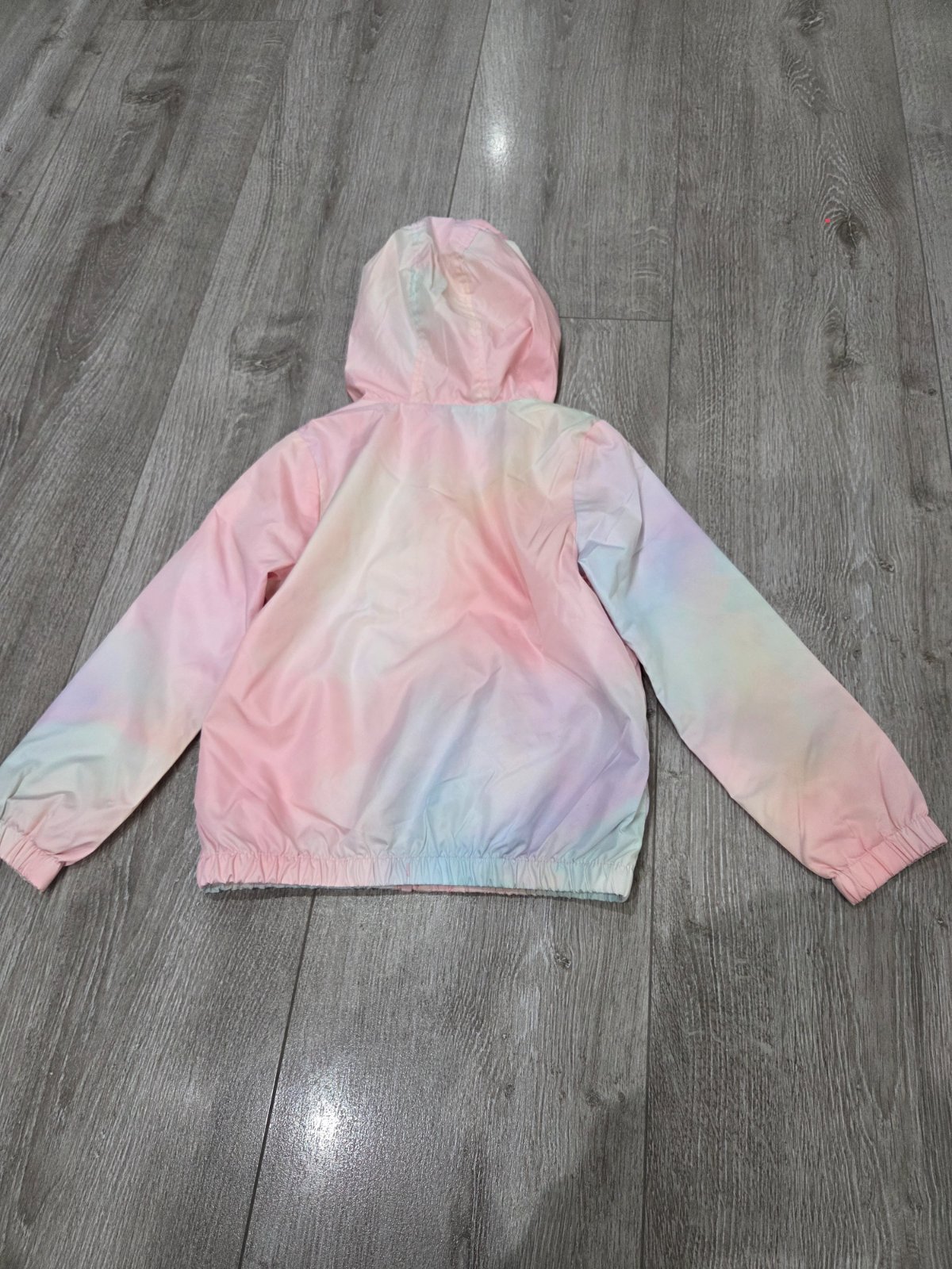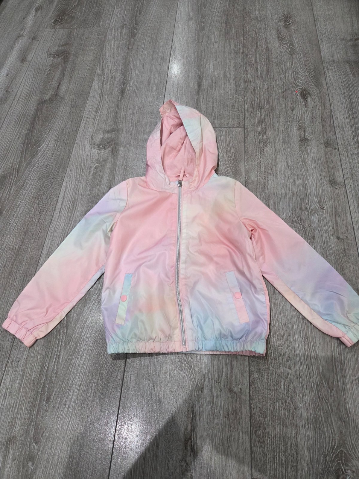 Veľmi dobrý stav (maličký fľak, viď detailné fotky)! Dievčenská prechodná vetrovka s kapucňou, kapucňa nie je odnímateľná, zapínanie na zips, dve bočné vrecká na zips, vo vnútri jemný flís. Materiá...