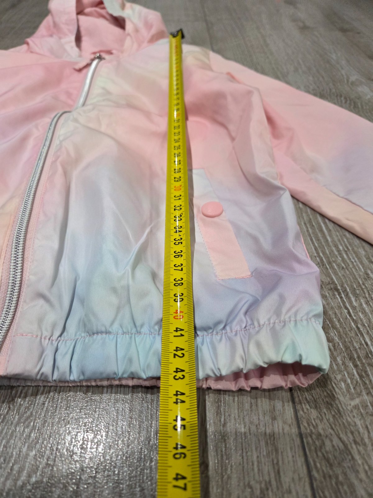 Pekny stav bez poskodenia.Na rukavoch pri patentoch slabe tmave fliacky vid. foto, v tom vzore sa to straca. Dlzka 51 Sirka 40 Rukav od kapucne 48