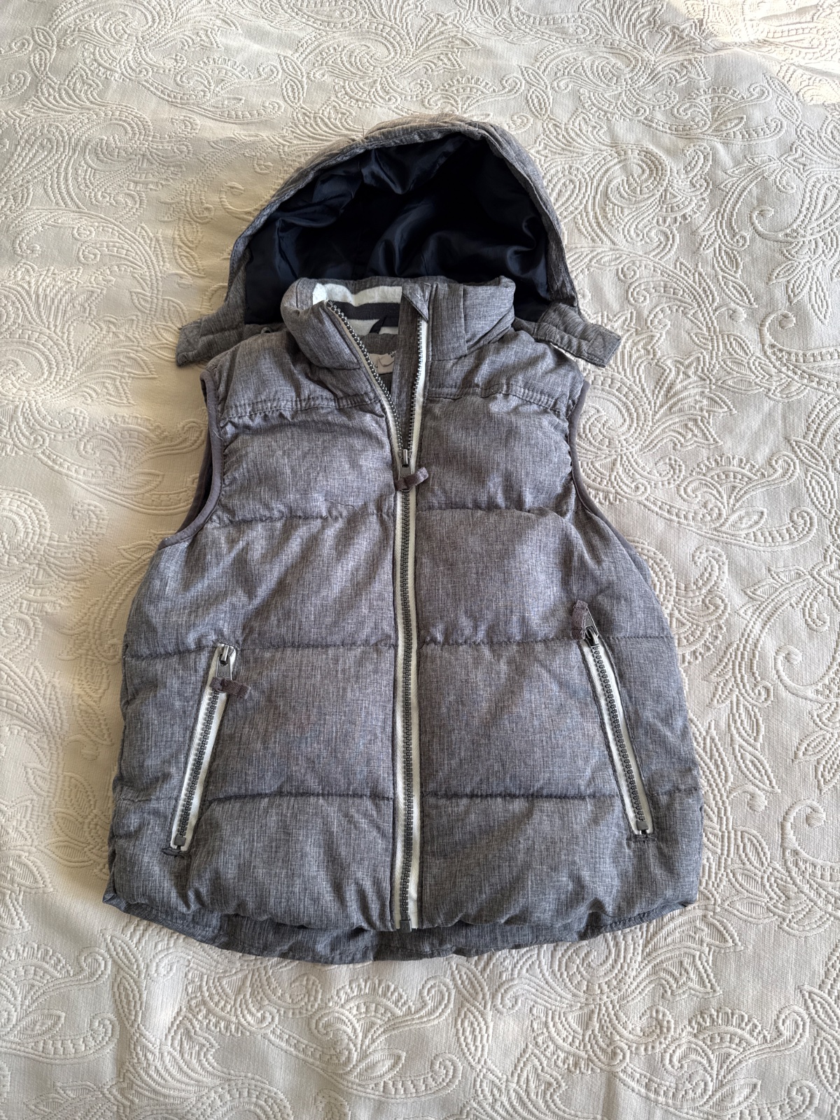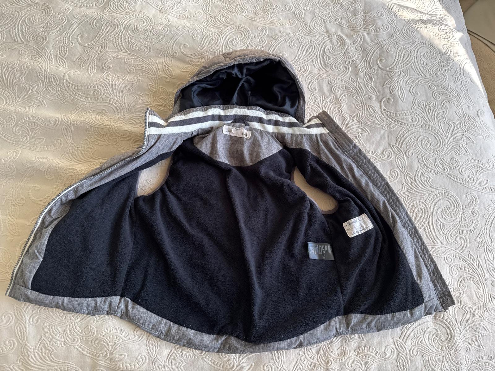Zateplená vesta s odnímateľnou kapucňou, nosena, no ešte stále veľmi pekná a niekomu poslúži.