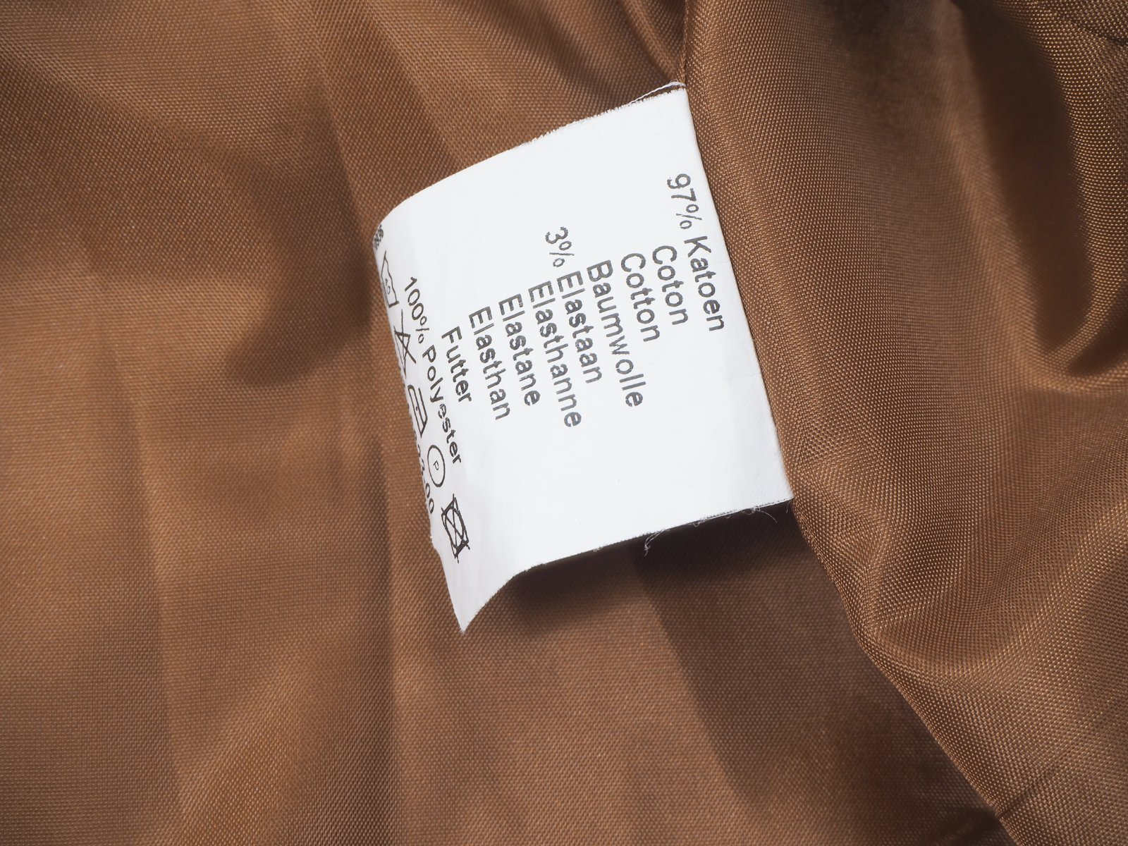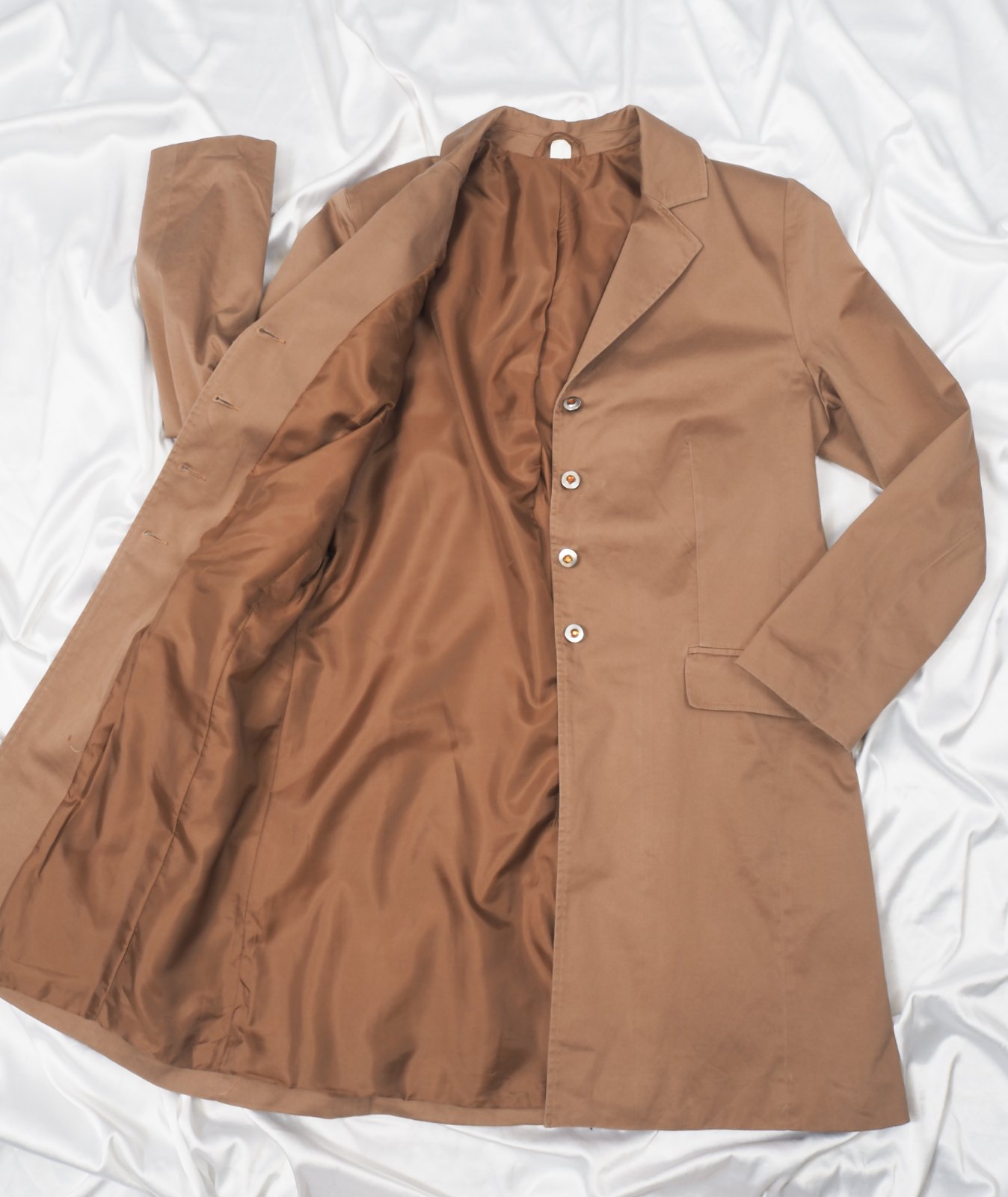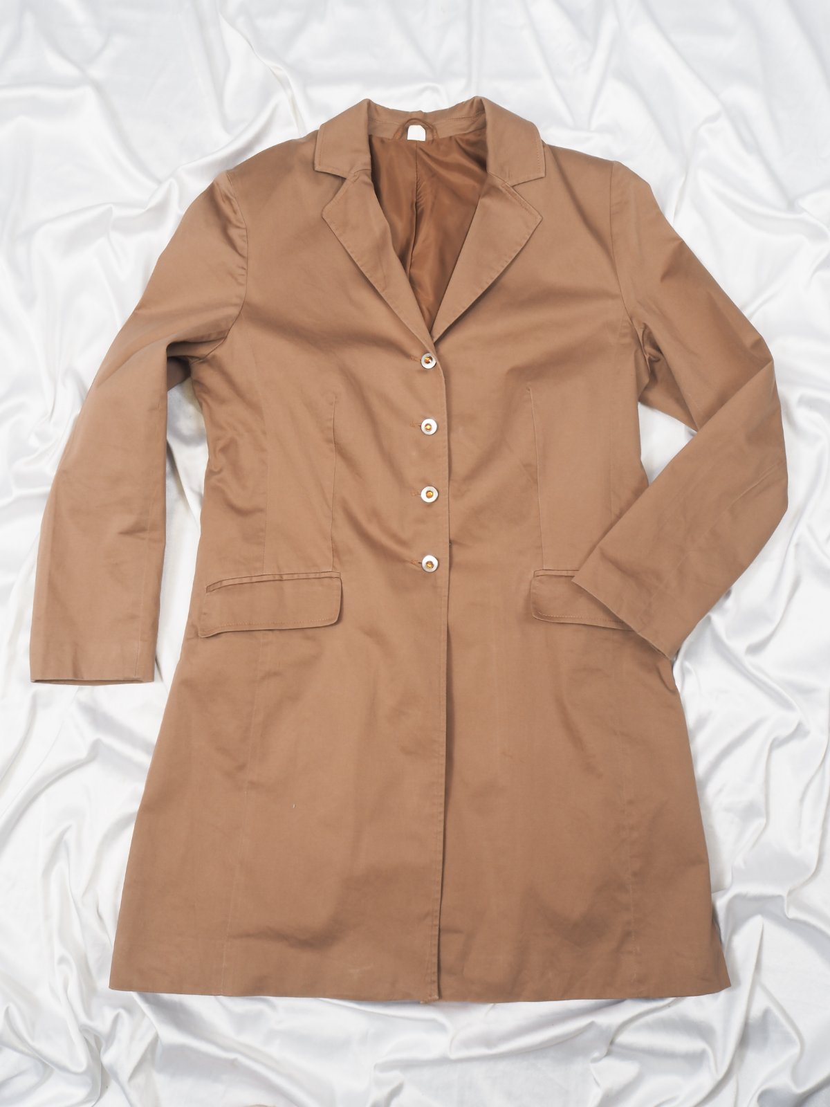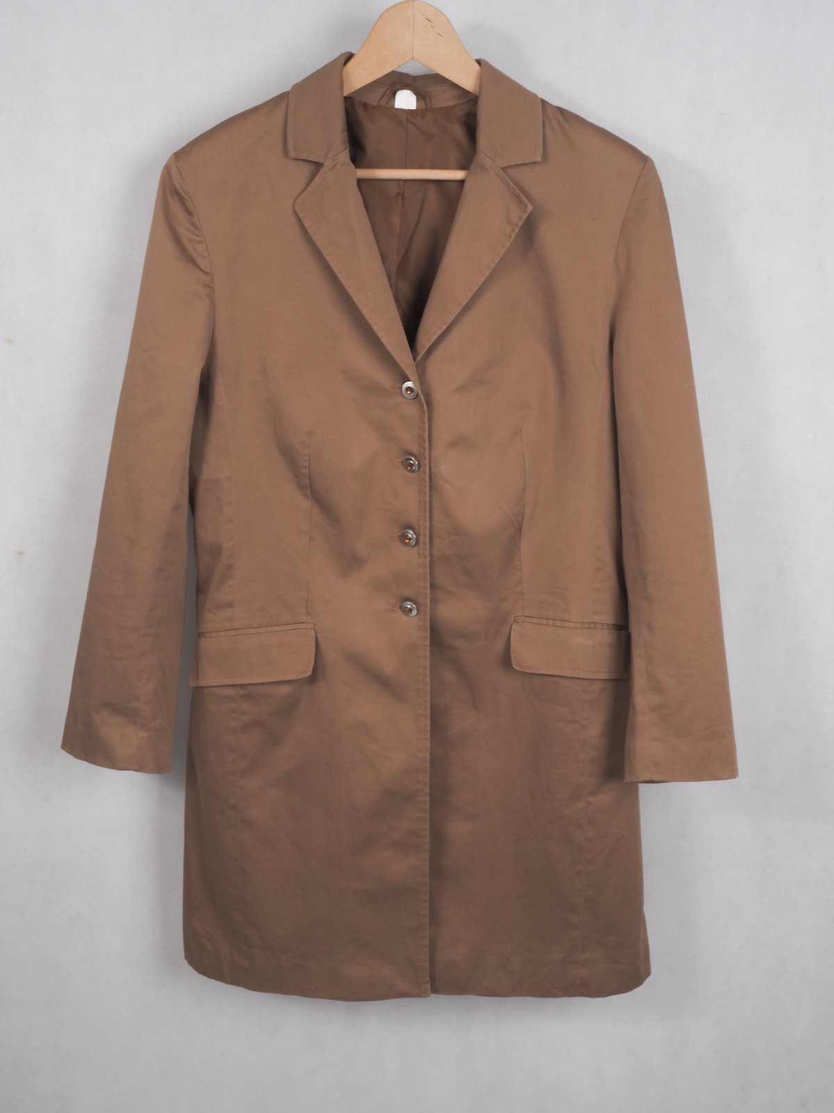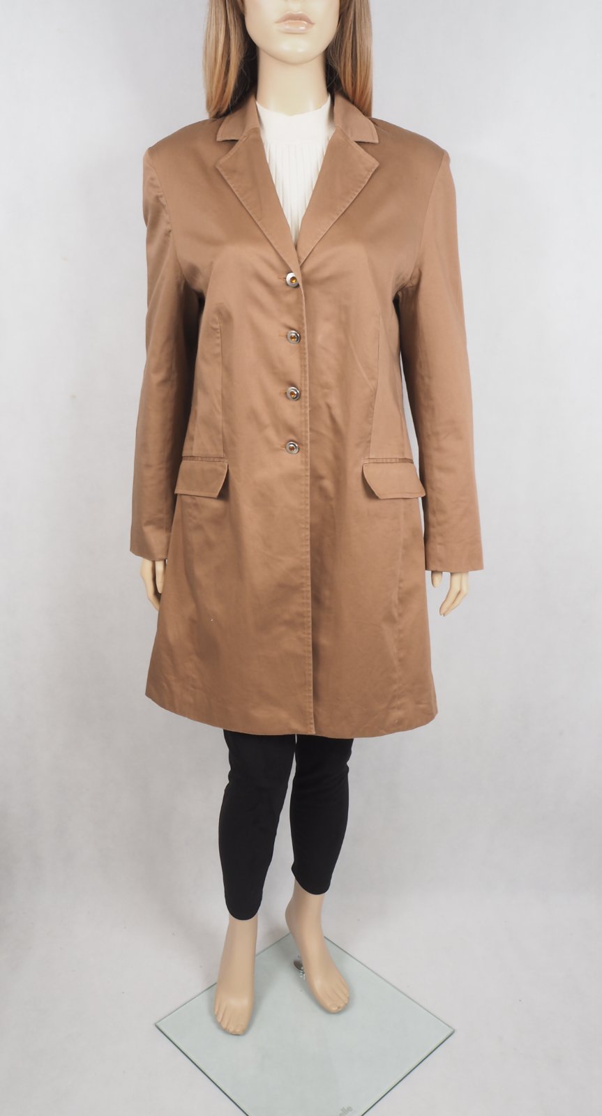 Kvalitný hnedoškoricový kabát, zapínanie na gombíky, podšitý, materiál