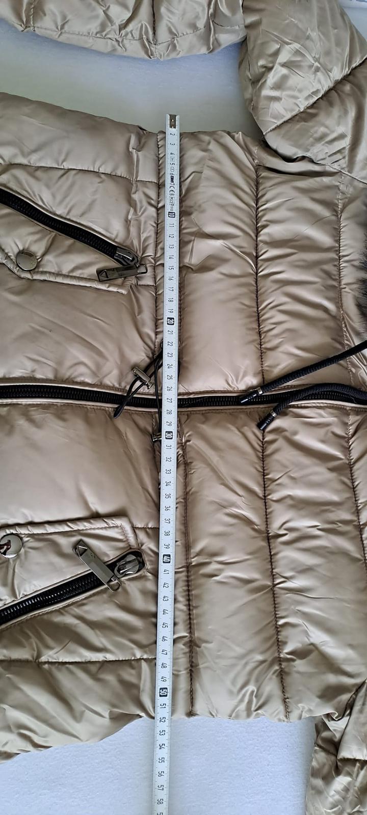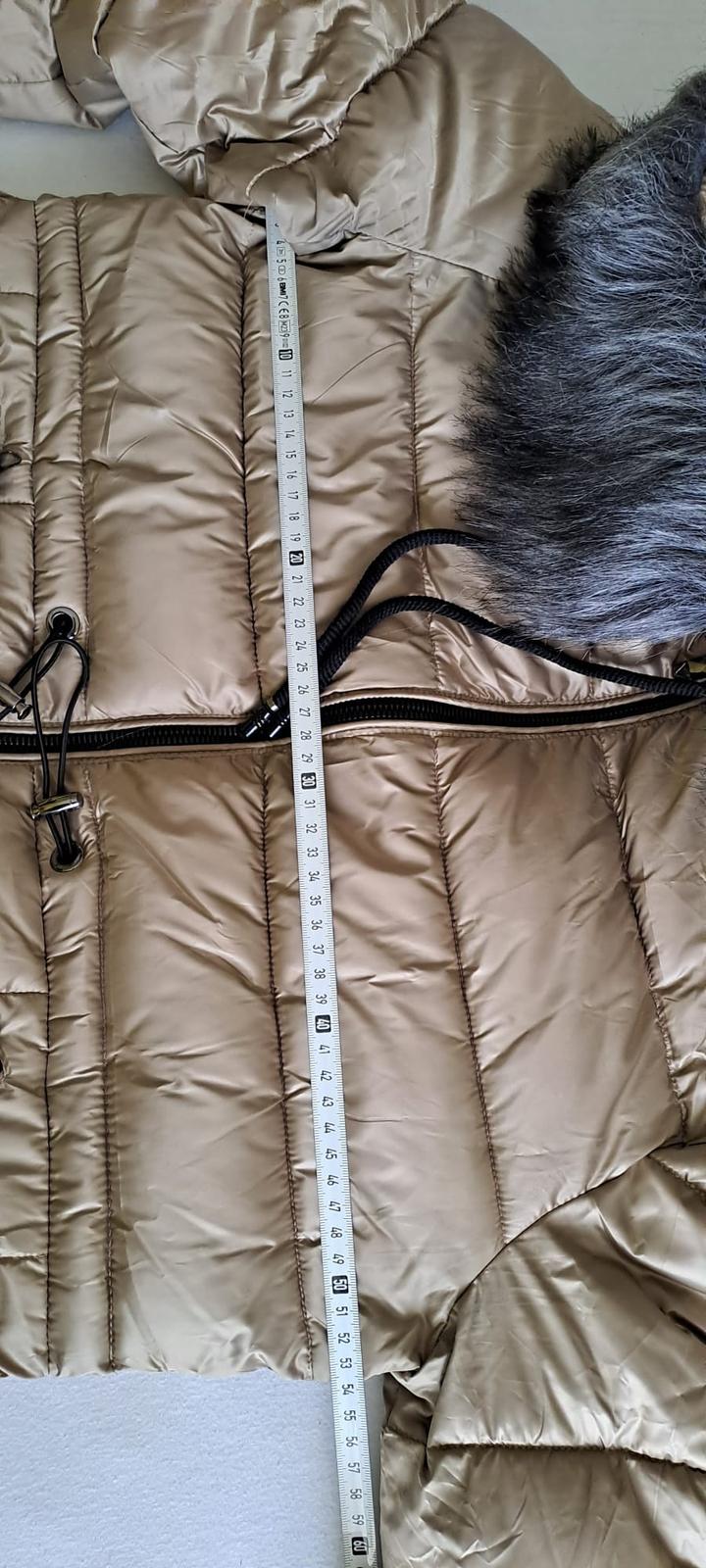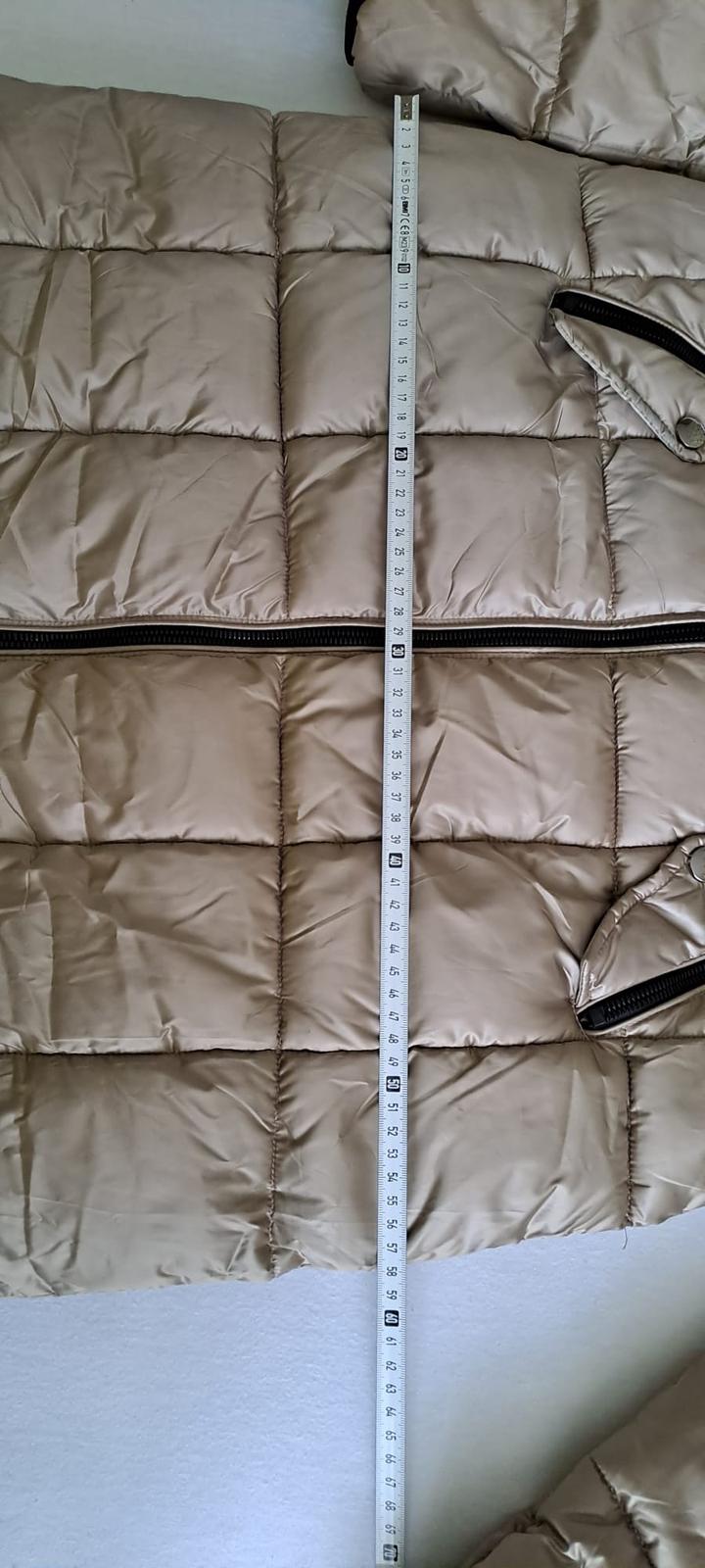 Super kúsok, zopár krát vzatá. Kožušina sa dá odopnúť, v páse pomocou nastaviteľných gumičiek vytvarujete postavu. Ale dá sa nosiť aj ako rovný strih, bez oťahovania v páse. Ba rukávoch patenty. Super sedí, neoľutujete. Veľkosť 42-44. Pozrite rozmery na fotkách. Značka S'West.